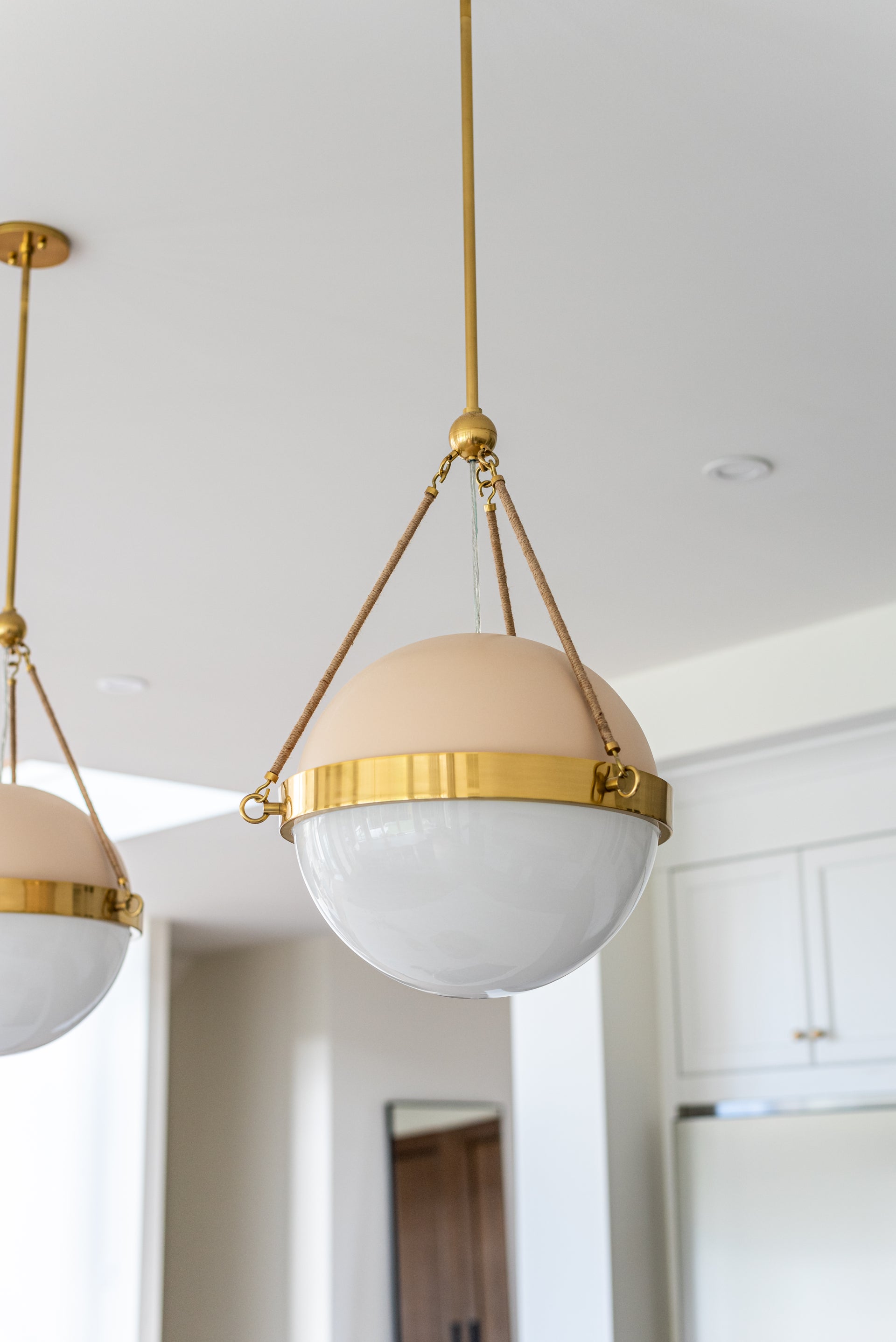 Named after one of Mandy Cheng’s earliest childhood friends, the Abbie family reflects both her vibrant presence and the striking jewelry she often wears. Pairing floaty cloud glass with natural jute rope, the materials nod to their shared years surfing along the California coast amid driftwood and palm trees. While the sconce silhouette is simplified, the pendant features a painted top with an Aged Brass cuff encircling its center to add a layer of shine.