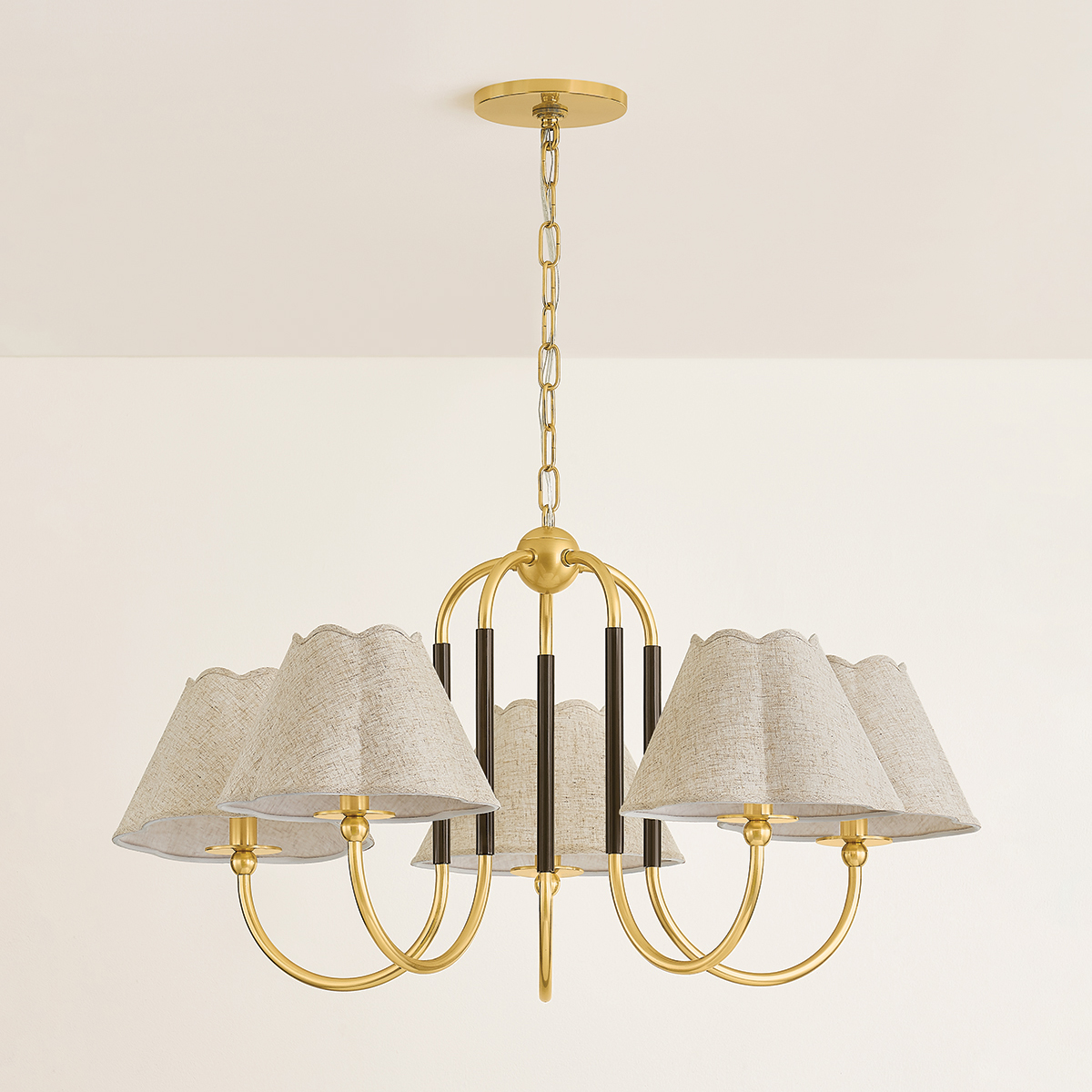 The Janie family updates a traditional framework with contemporary silhouettes and an unexpected mix of materials, making it ideal for both classic and modern spaces. Scalloped shades cast a softly diffused light, creating a subtle, curved shadow. The contrasting True Bronze sleeve against the Aged Brass frame accentuates Janie’s fresh, re-imagined form. Designed to be layered together, these fixtures are designed in honor of Mandy’s beloved family of in-laws.