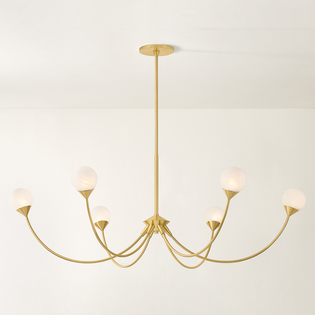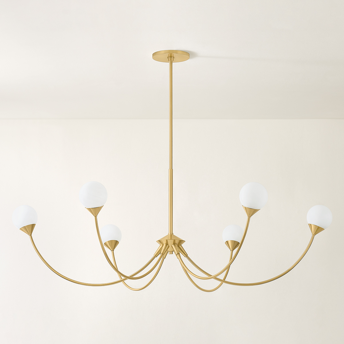 The silhouettes of the Natasha family are classically decadent, yet light and sparse. Swooping arches and balanced cloud glass orbs make the chandeliers feel daring, while the sconce is soft and simplified. Finished in Aged Brass, Natasha hits the right notes between new and nostalgic for a fresh form language that will invigorate any space.