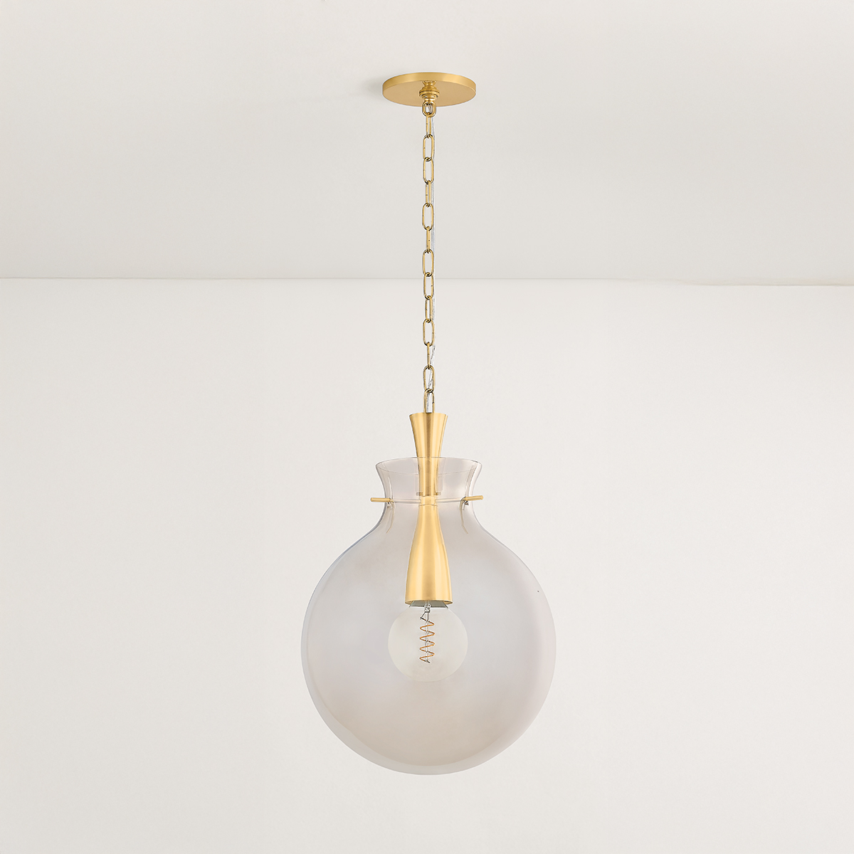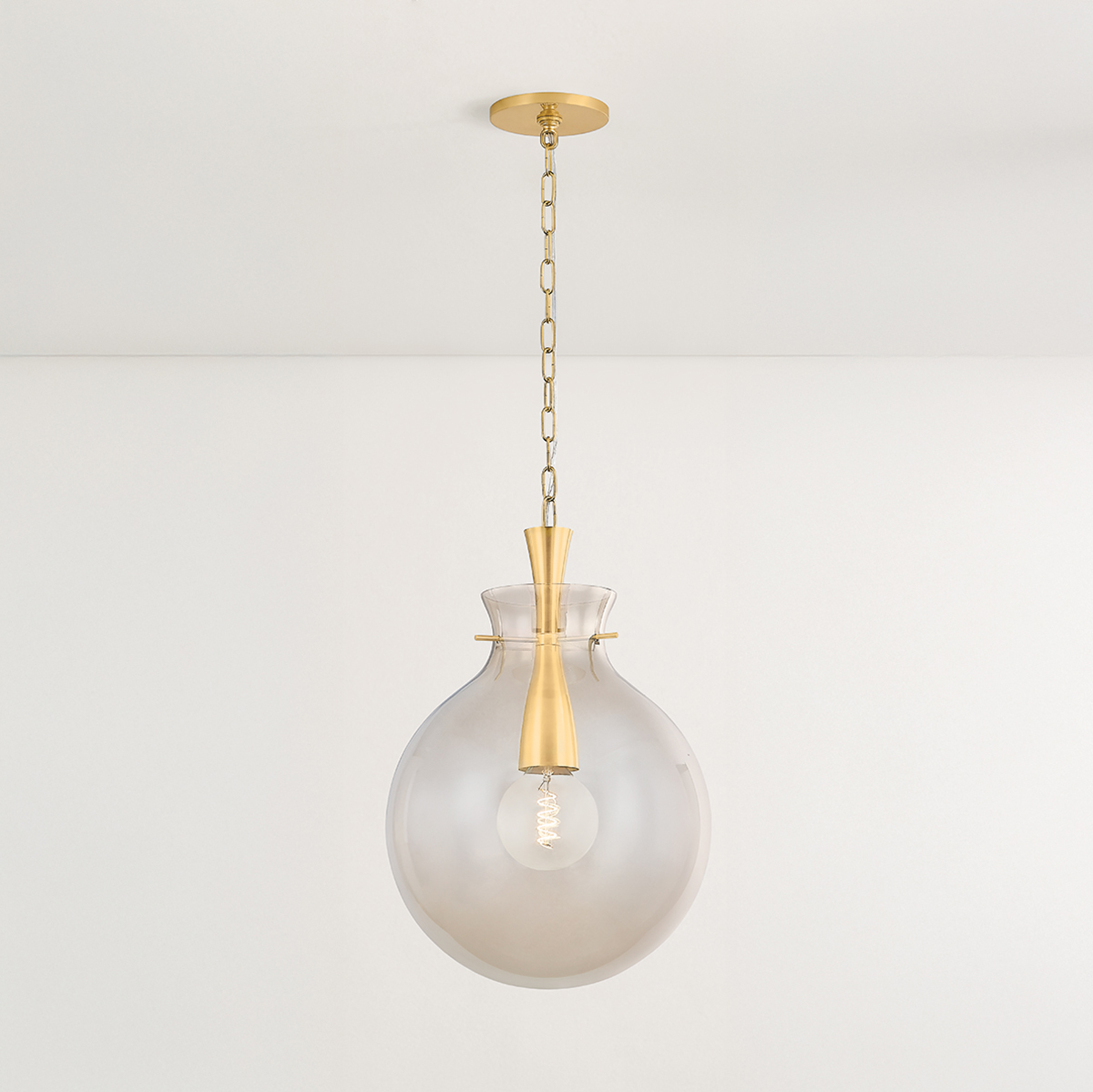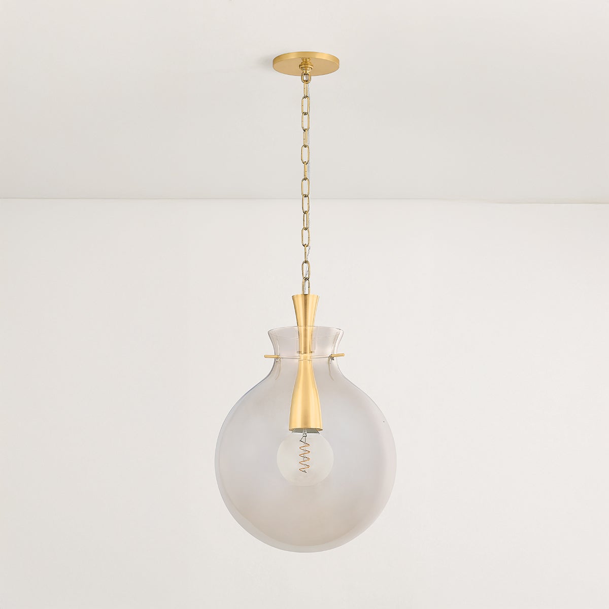 Inspired by vintage glass vases, the Benita pendant has a delicate, yet voluminous form with an innovative construction. The light bronze glass shade is warm and inviting, drawing you in with its romantic glow. To create a feeling of continuity with the Aged Brass suspension chain, the metalwork flows through the opening of the shade, revealing a glimpse of the craftsmanship. Benita comes in two sizes to brighten up kitchens, living rooms, and bedrooms.