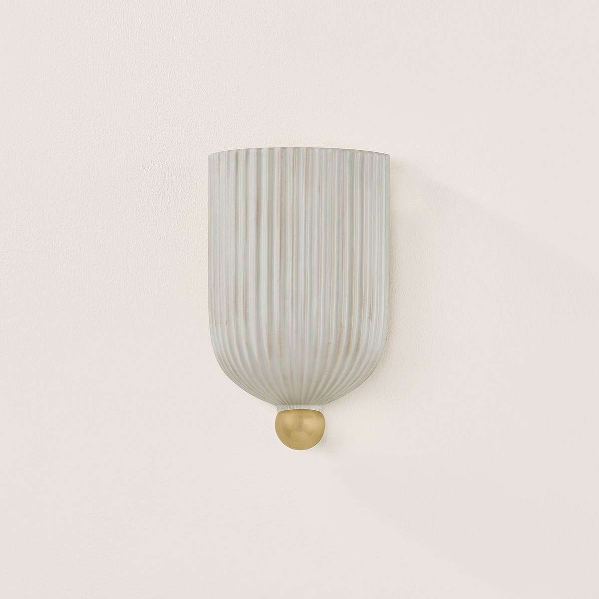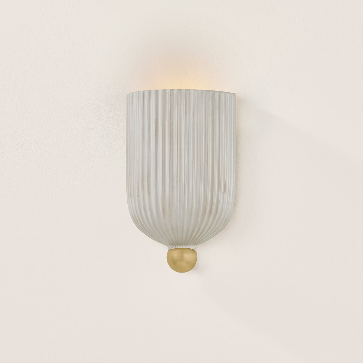 Inspired by the elegance of ancient Greek columns, the vertical ribbing on the Amira sconce creates a neoclassical moment on the wall. As the matte white Fluted Cream ceramic glaze pools in the grooves, an earthy bisque undertone adds a warm, artisanal note. Finished with an ornamental Aged Brass sphere, this petite uplight creates a calming, elevated mood in a bath or powder room.