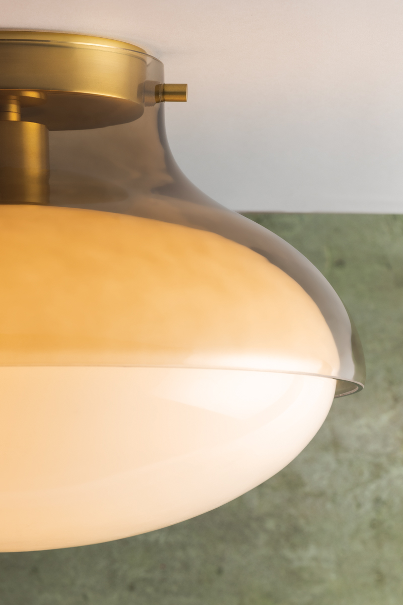 The soft curves and mechanical detailing of Gianna create visual tension while retaining a sense of balance. A light bronze glass layer melts from an Aged Brass canopy, surrounding a glossy opal glass inner shade to form the organic design. The clean, minimalist shape is elevated by the distinctive double glass composition and the industrial-style pins that hold the entire fixture together.