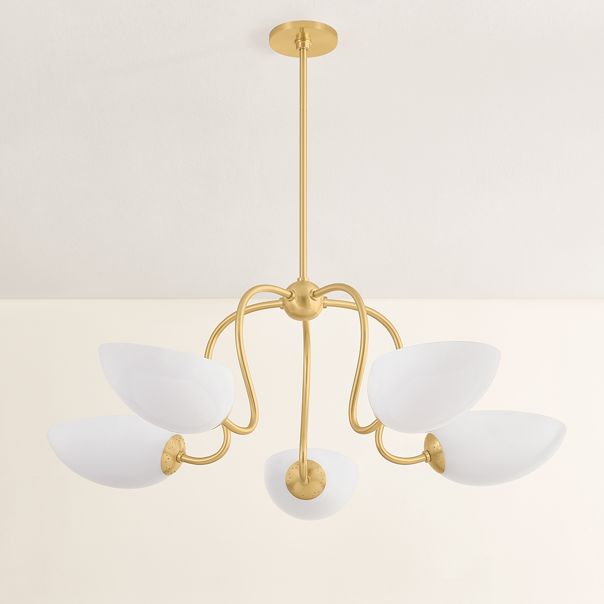 The Reva family leans into a sense of vintage nostalgia. Drawing on a botanical motif, the silhouette’s stem-like arms swoop dramatically into an S-curve to support each leaf-shaped uplight. The elongated cloud glass shades feature inner etching, diffusing light softly across a space. In both the semi-flush mount and chandelier, the classical design lines of Reva shine with a warm Aged Brass finish.
