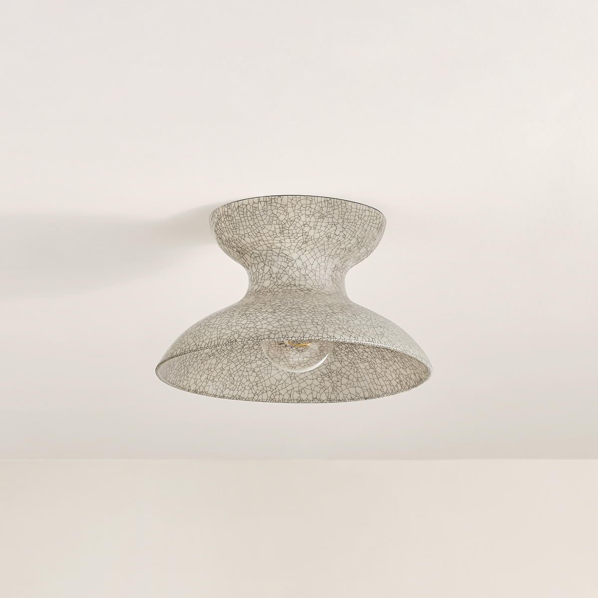 A contemporary take on a 1960s design, the Carina flush mount features a subtly organic shade shape with hidden Aged Brass-finished hardware. The glossy glazed Belgian Crackle ceramic finish softens the minimalist silhouette, making it feel warm and approachable. A perfect modern essential, this utilitarian, yet elevated fixture works well in a kitchen or dining space.