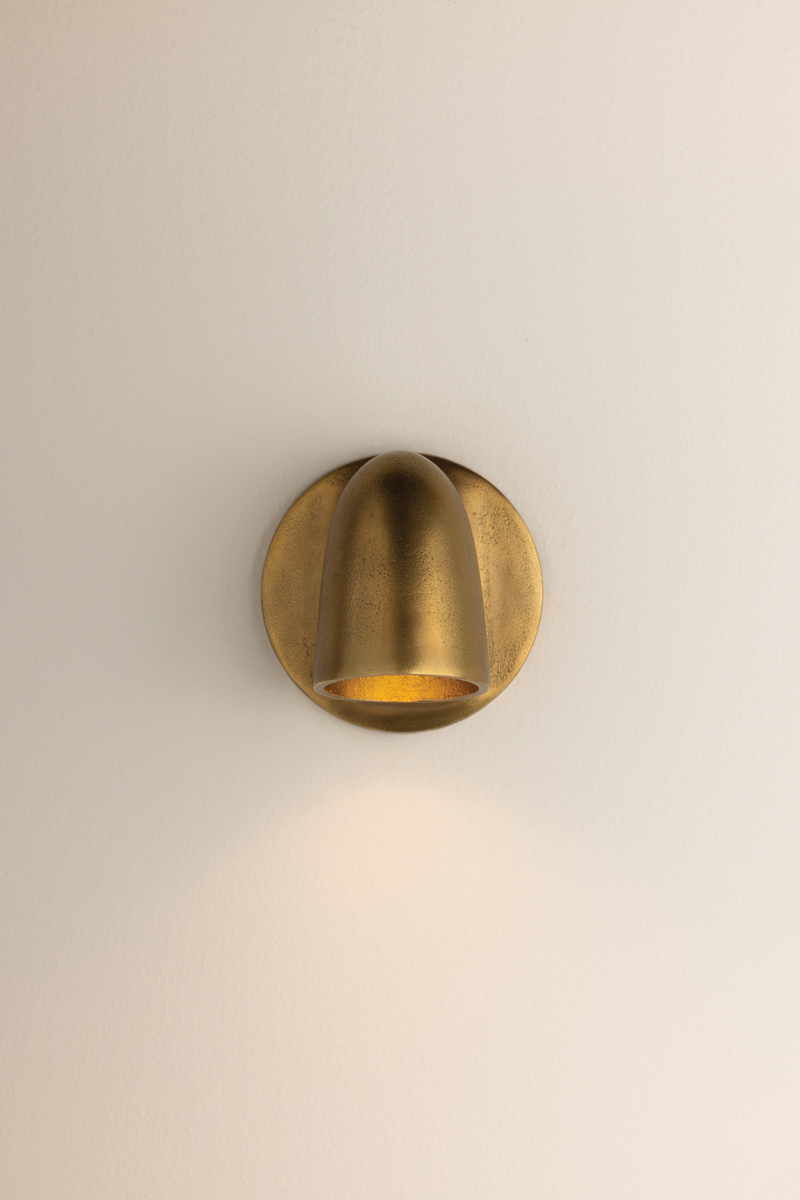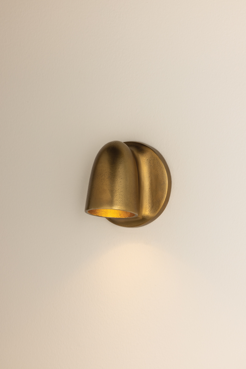 Petite, yet architectural, the Canna sconce provides a warm wash of light in a room. Cast from a metal piece with an Aged Brass finish, it features a rough, textural surface quality. This versatile all-rounder can be used as an uplight or downlight, making it ideal for spaces like a bath or powder room.