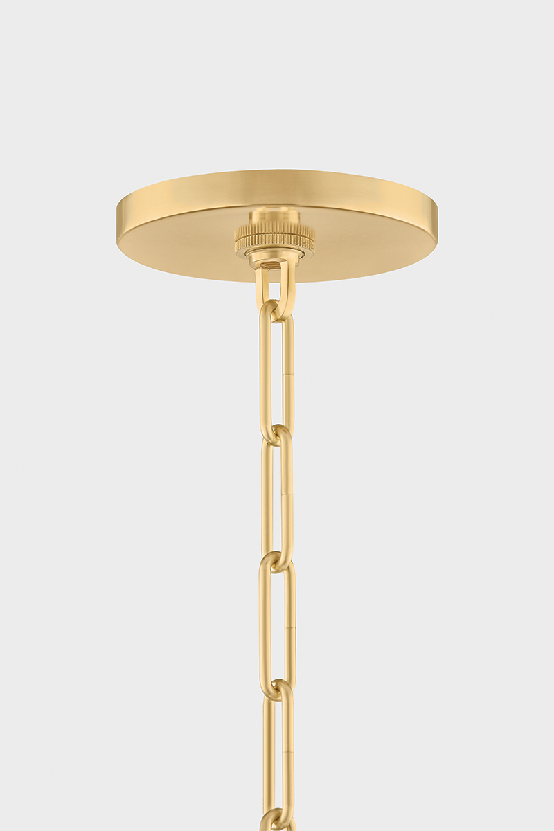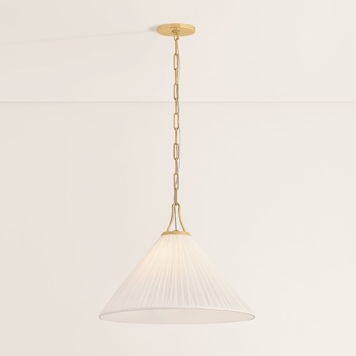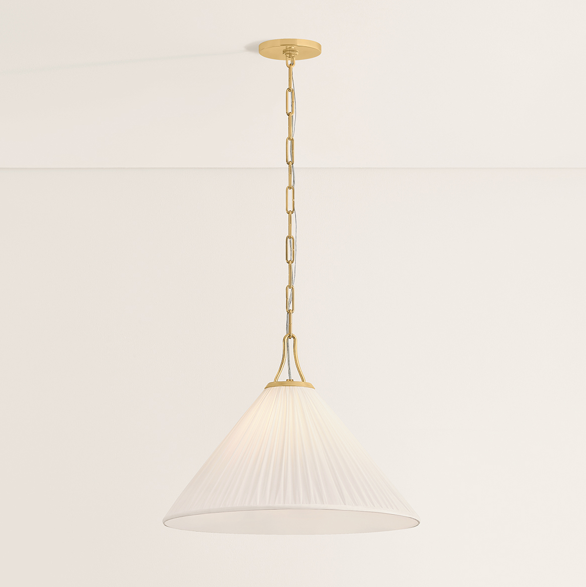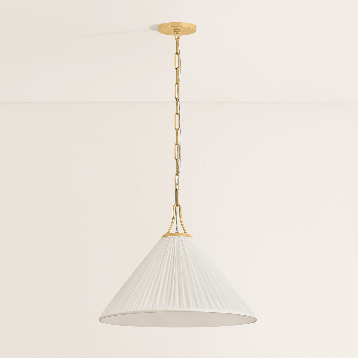 Elegant in its simplicity, the Merida pendant pairs a pleated faux silk shade with crisp metalwork. A sleek racetrack loop extends from the top of the fixture, its elongated shape seeming to be drawn downward by the weight of the shade. Finished in Aged Brass, this special detail and classic chain add a clean modern touch to the design. Available in two sizes.