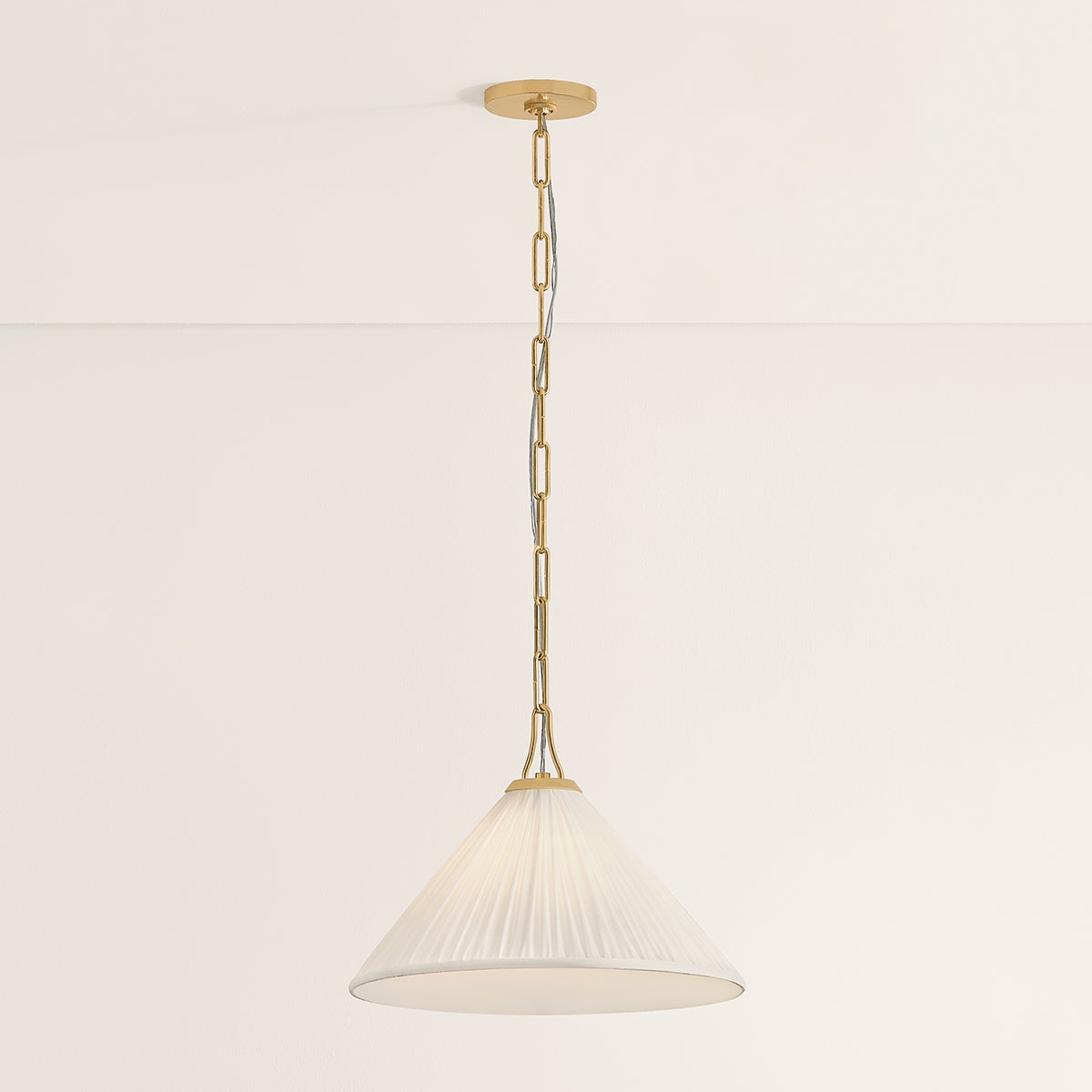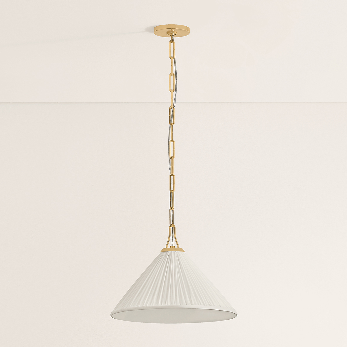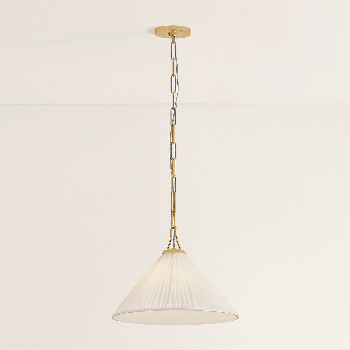 Elegant in its simplicity, the Merida pendant pairs a pleated faux silk shade with crisp metalwork. A sleek racetrack loop extends from the top of the fixture, its elongated shape seeming to be drawn downward by the weight of the shade. Finished in Aged Brass, this special detail and classic chain add a clean modern touch to the design. Available in two sizes.