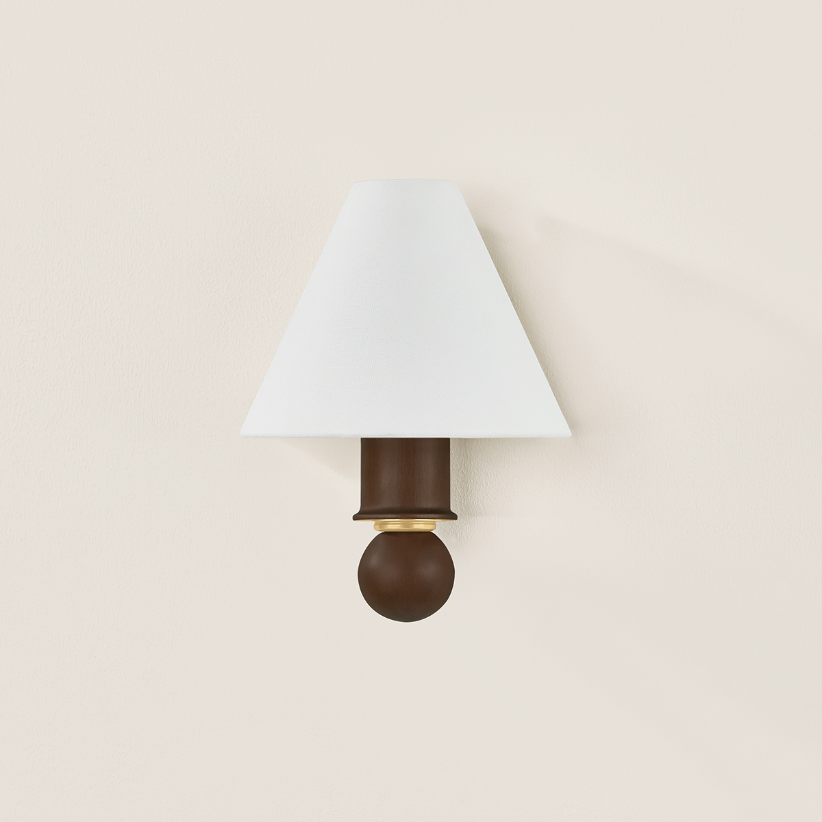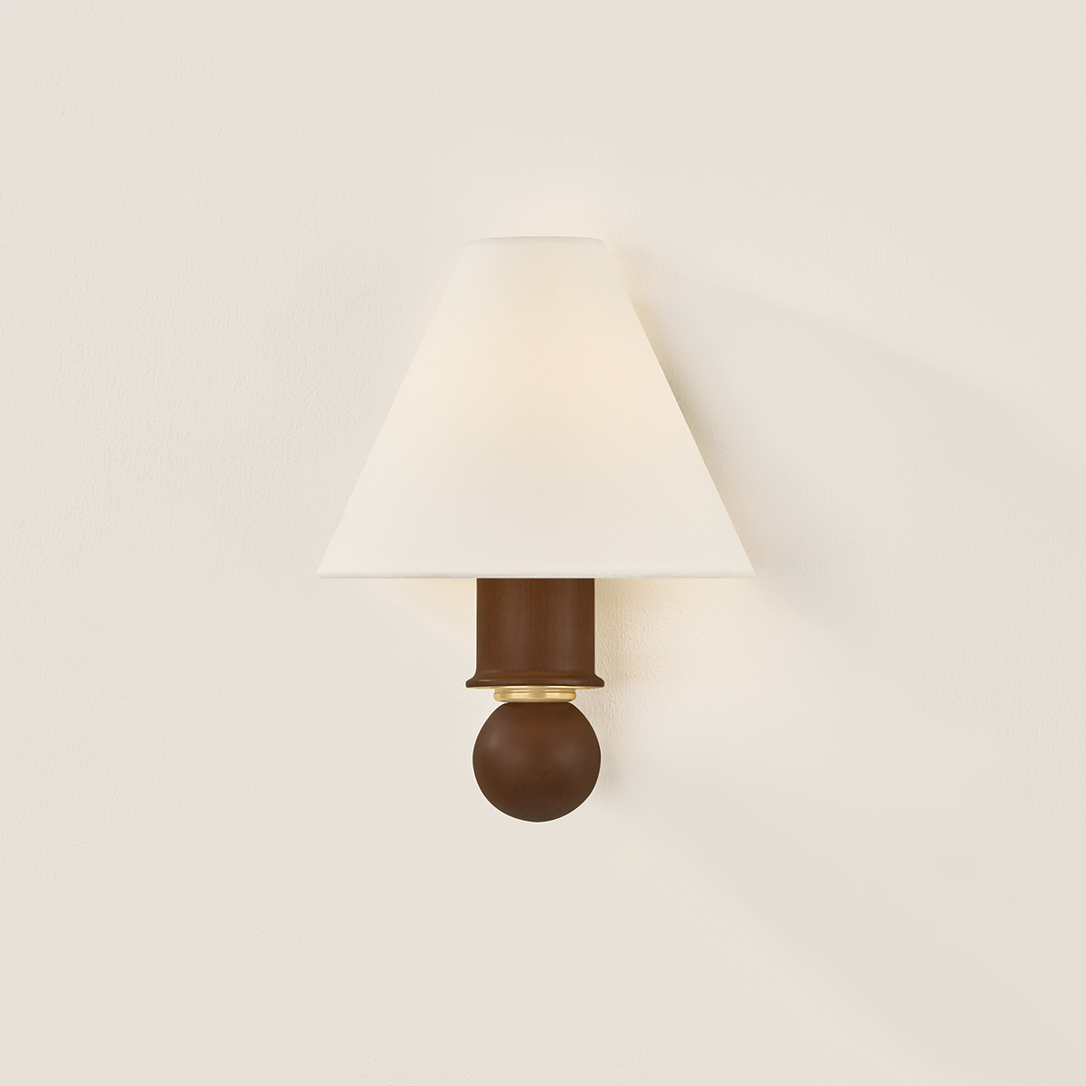 A petite sconce with a large presence, Candice pairs a distinctive turned wood stem with a white linen half-shade. The polished wood evokes a sense of heritage and craftsmanship, enhanced by the decorative shaping. An Aged Brass reflector beneath the shade creates a soft, warm glow, adding to Candice’s antique-inspired charm.