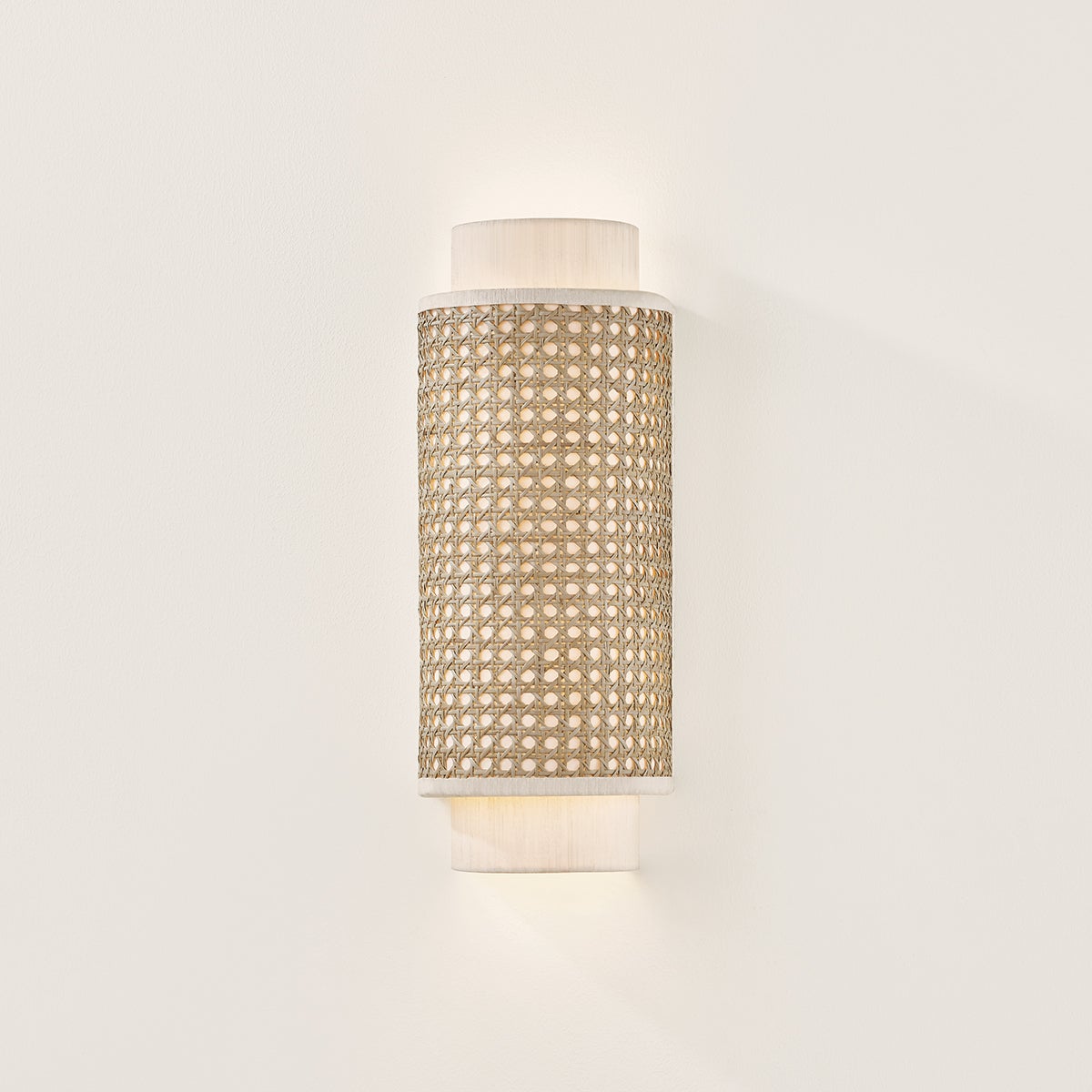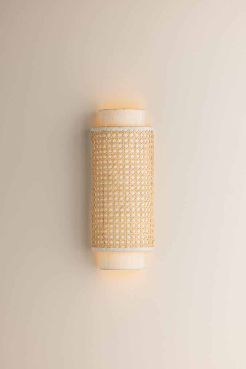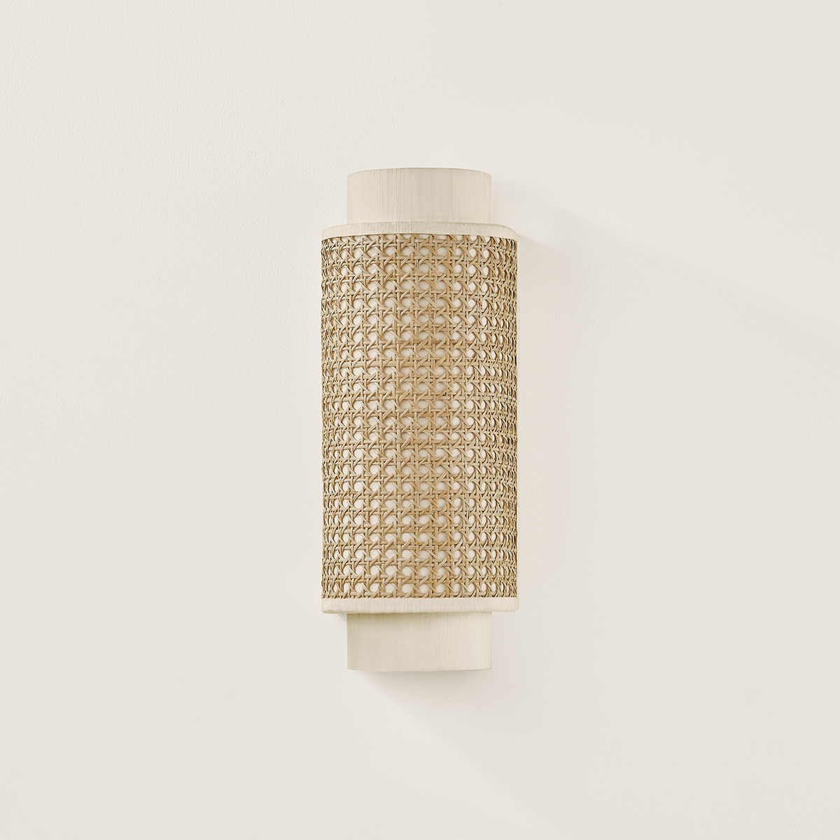Natural materials, handcrafted detail, and soft layering create the charming and usable Tina sconce. A curved raw silk shade forms a tunnel that shields the light, while the outer basket cane wicker layer creates a textural point of interest. A warm, inviting glow fills the shade, bouncing off concealed Aged Brass hardware and softly spilling from both ends to wash the wall.