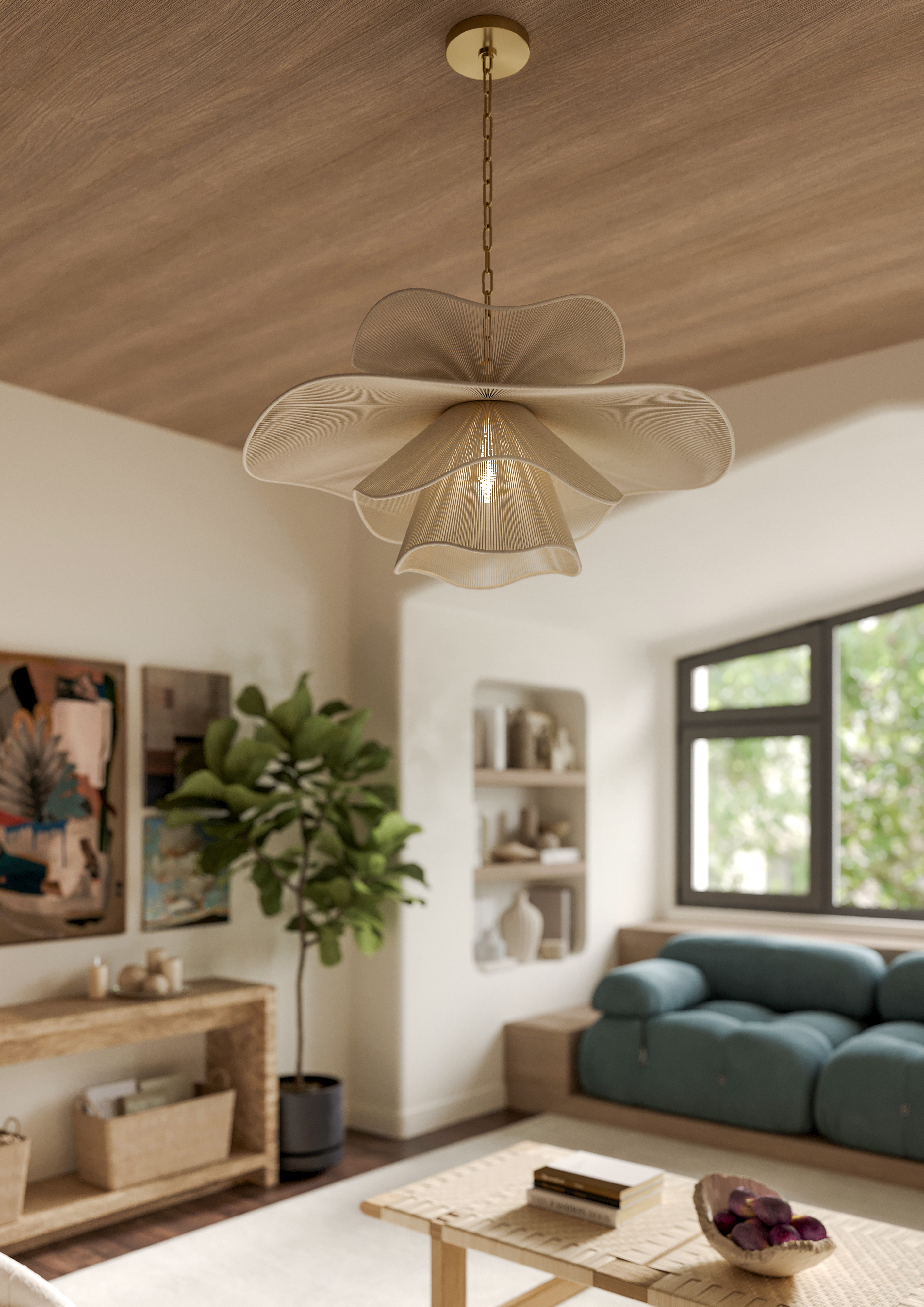 Composed of layered leaf-inspired forms, the Amanda pendant makes a grand-scale visual impact. The four softly undulating cotton-string shades create an implied sense of rhythmic movement as their sculptural lines come alive with light. Despite the generous silhouette, Amanda is airy as it floats above dining tables and entryways. Suspended from an Aged Brass chain and available in two sizes, it brings a quiet drama to any space.
