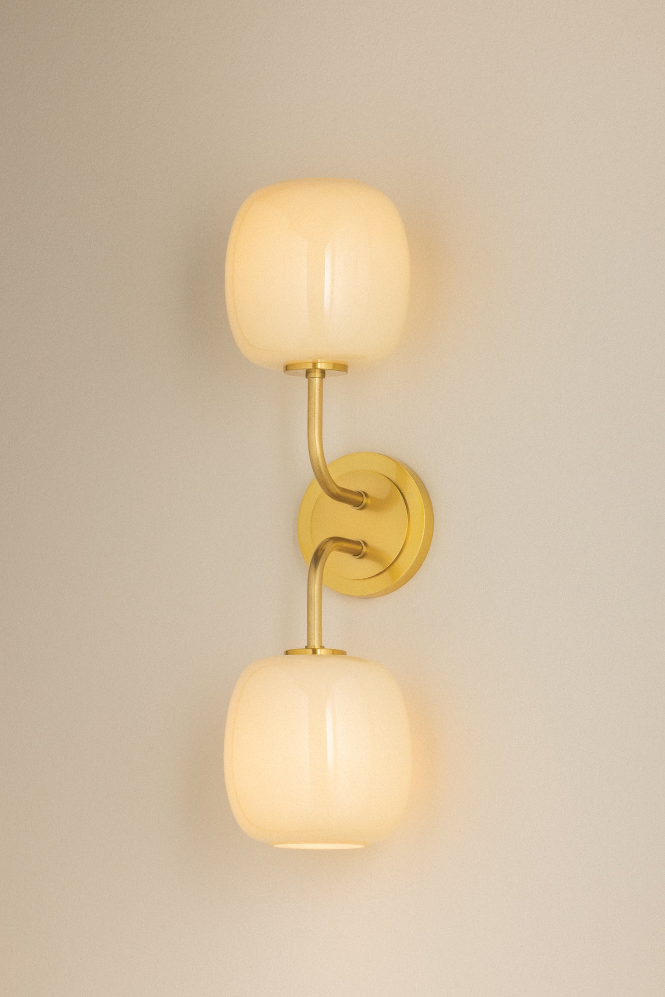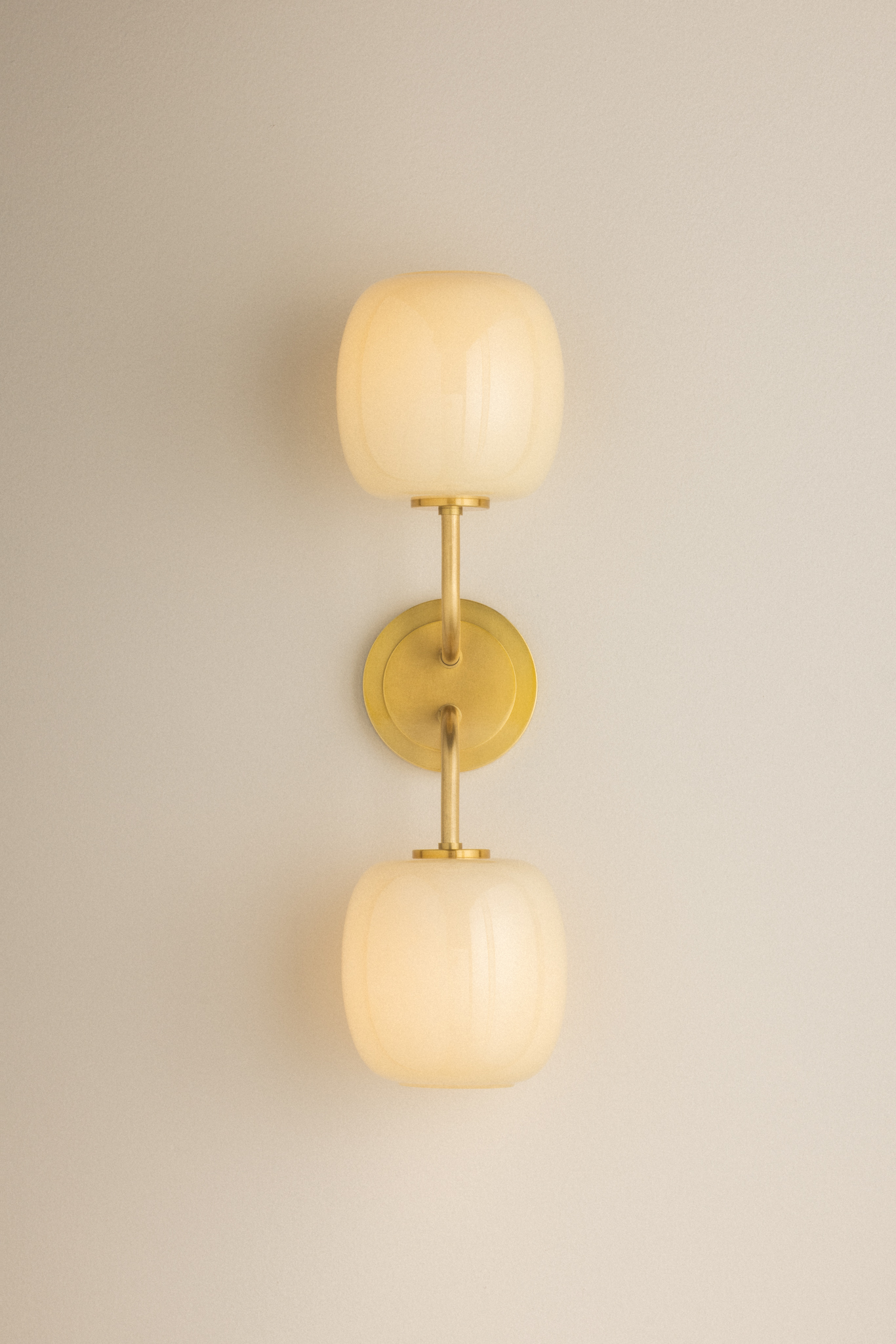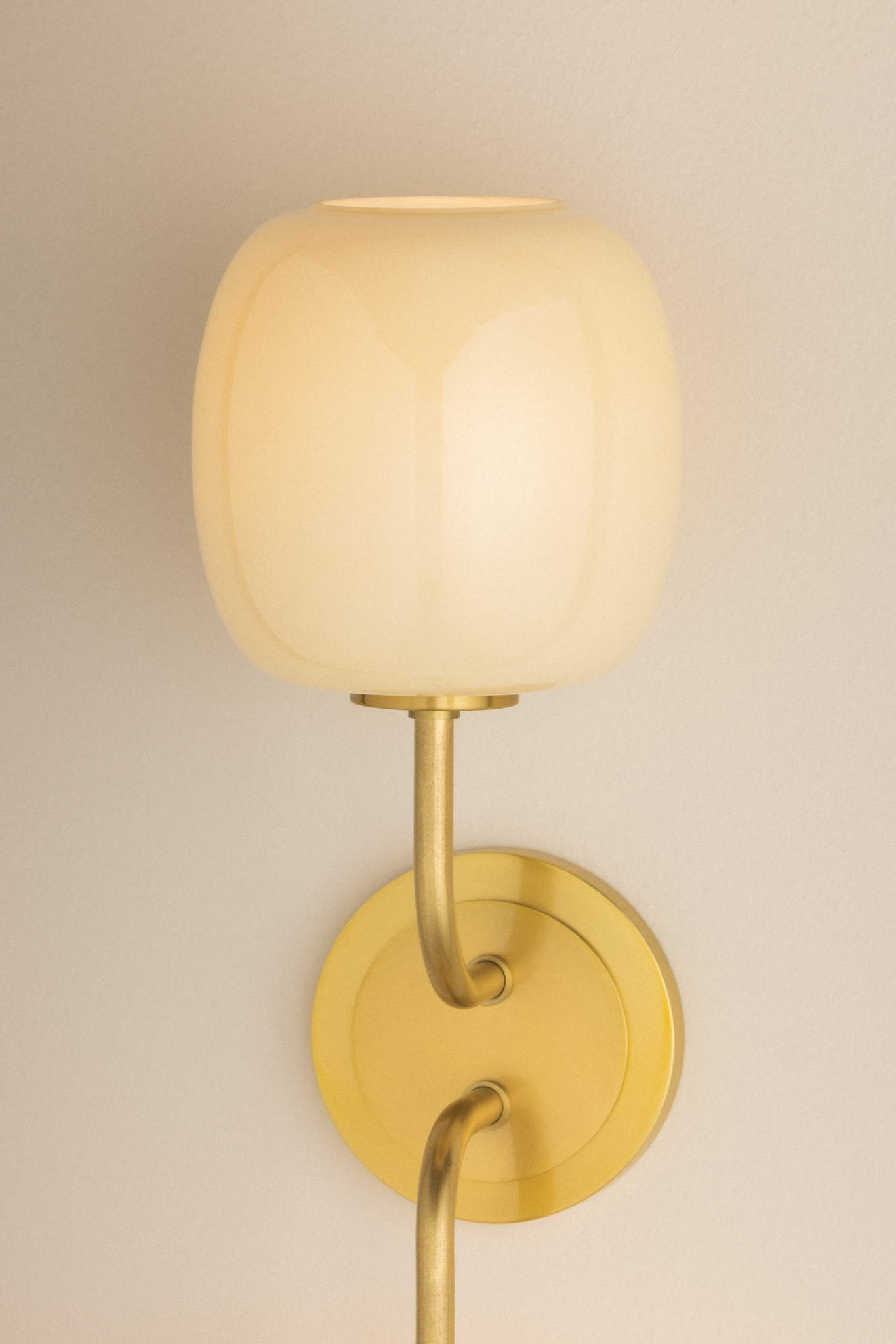 The Lisette family transforms simple geometric shapes into highly expressive compositions. In the 6- and 8-light semi-flush mounts, staggered arms branch outward in a radiant, bouquet-like arrangement. The 1- and 2-light sconces provide a more nuanced nod to botanical forms. Each shiny cream opal glass shade features a delicate fluted edge. Finished in Aged Brass, Lisette’s dynamic energy enlivens any space.