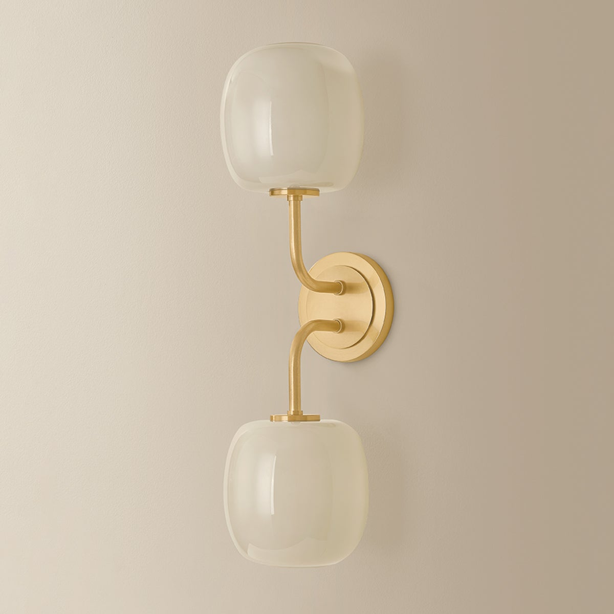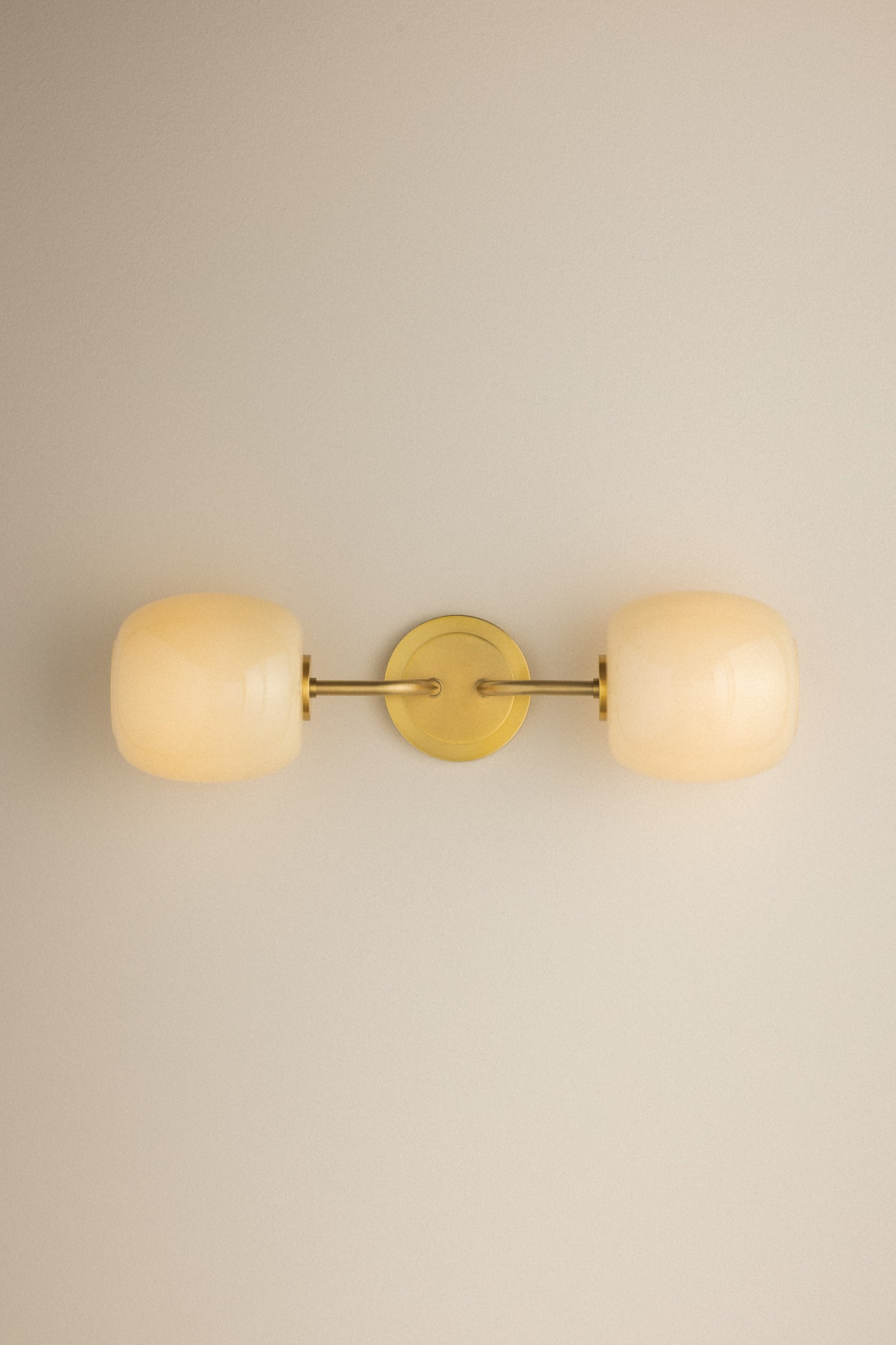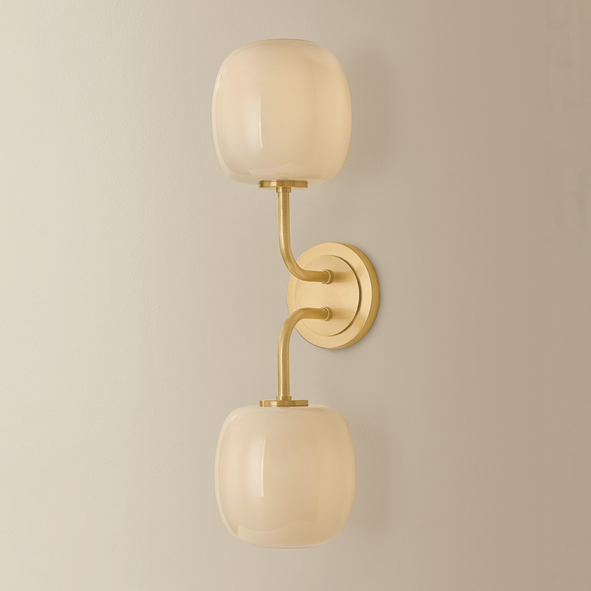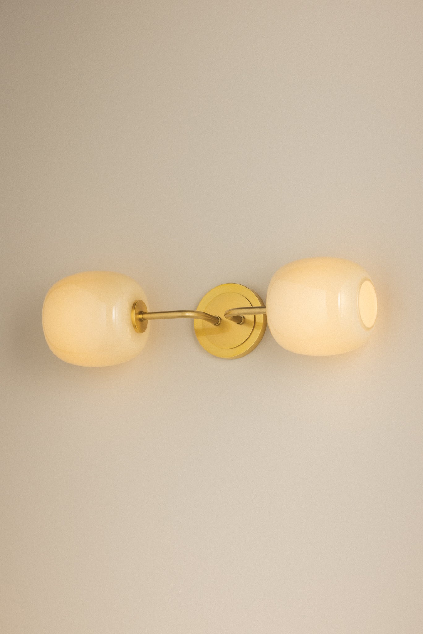 The Lisette family transforms simple geometric shapes into highly expressive compositions. In the 6- and 8-light semi-flush mounts, staggered arms branch outward in a radiant, bouquet-like arrangement. The 1- and 2-light sconces provide a more nuanced nod to botanical forms. Each shiny cream opal glass shade features a delicate fluted edge. Finished in Aged Brass, Lisette’s dynamic energy enlivens any space.
