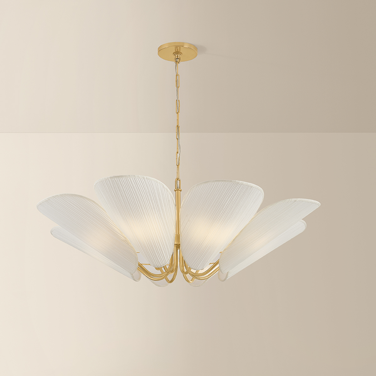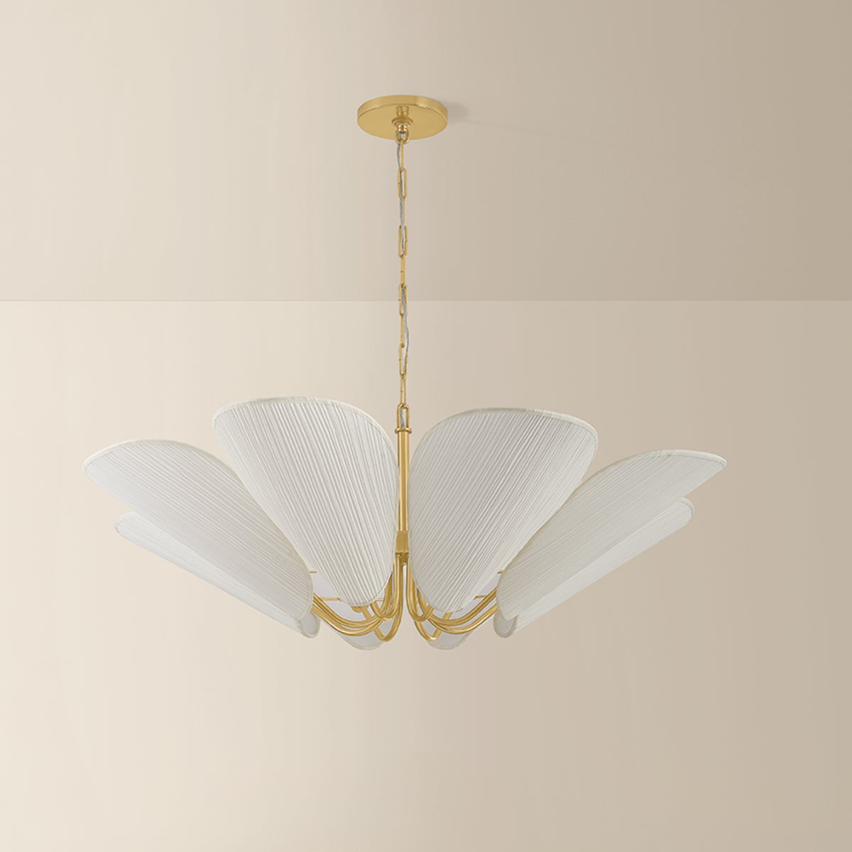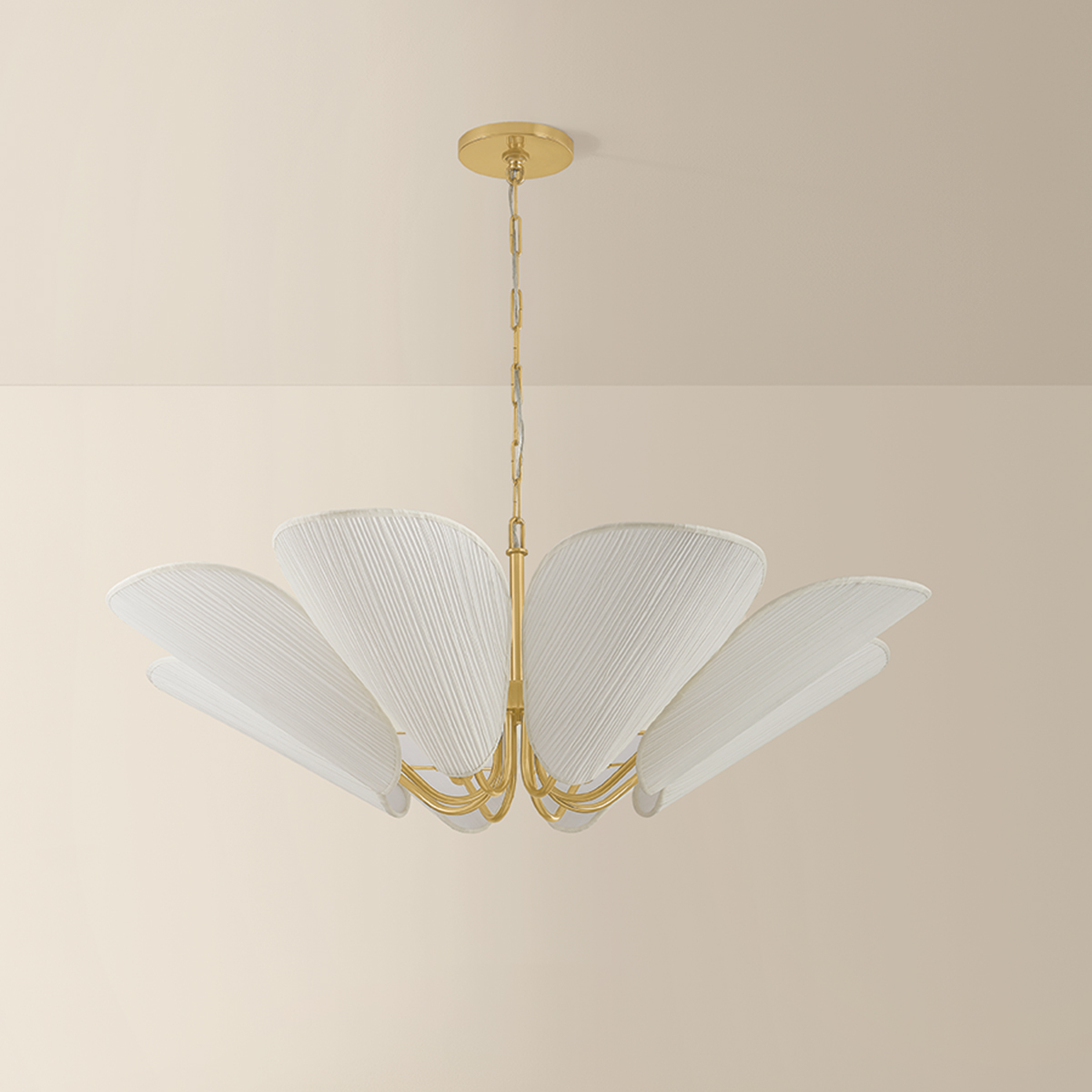 Upturned, petal-like shades in texturally fine, gathered off-white linen create a soft, organic impression in the Winifred chandelier. A light glows behind each of the eight forms, illuminating this botanical fan silhouette. Finished in Aged Brass, this vintage-inspired delight will lift the mood in any room.