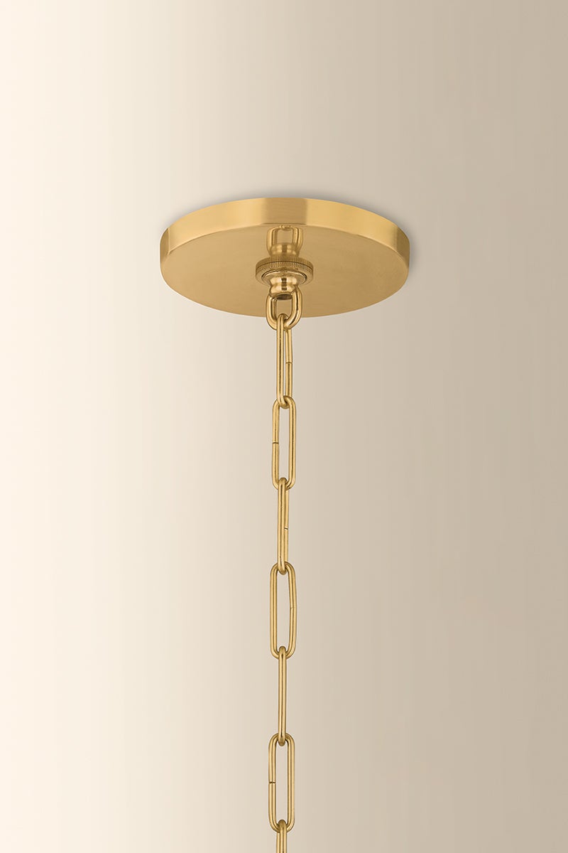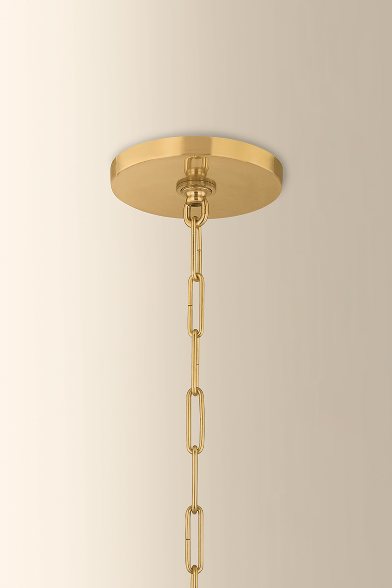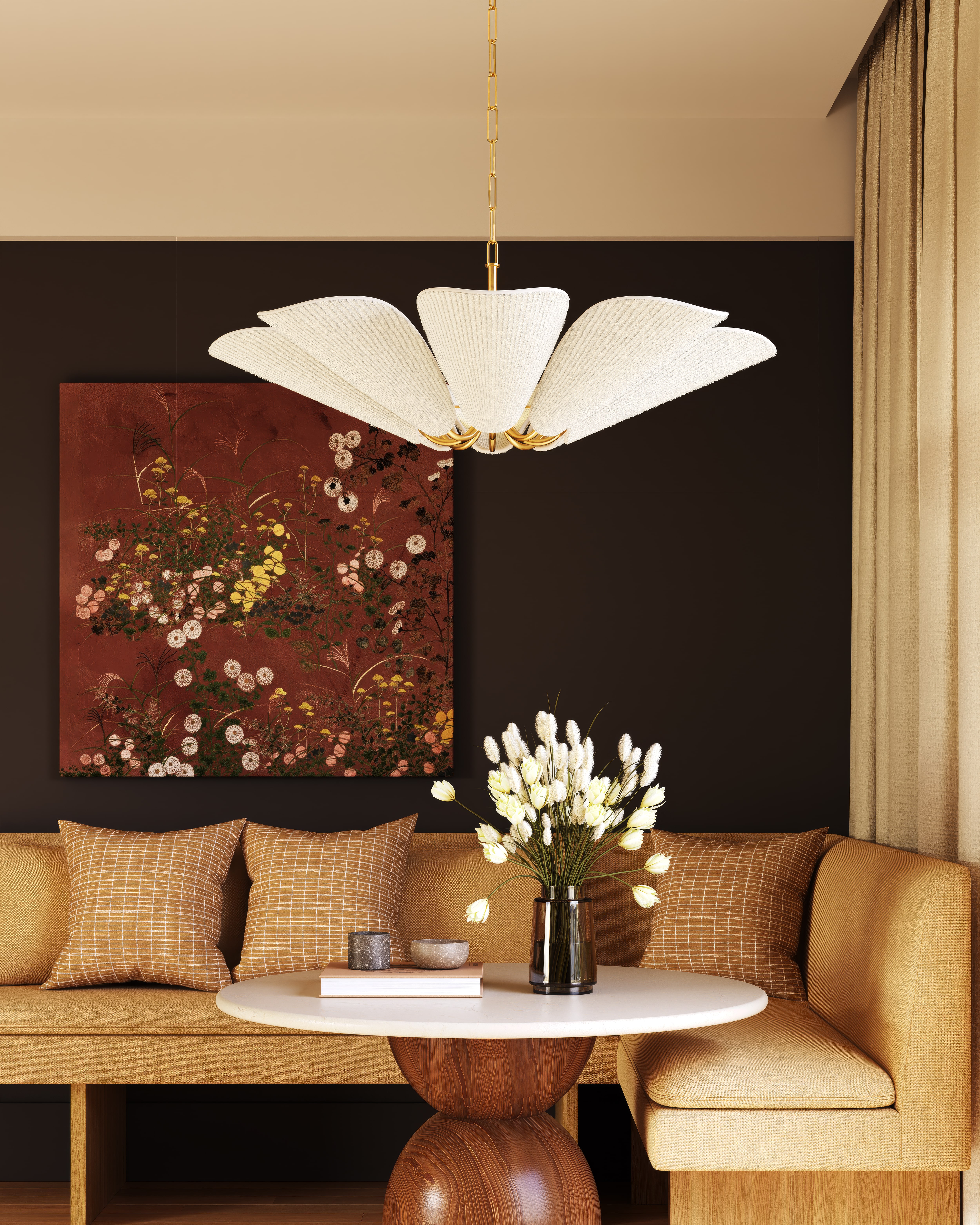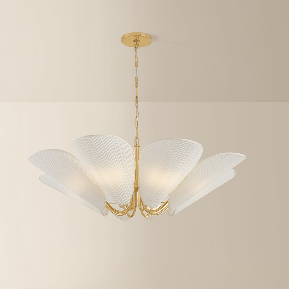 Upturned, petal-like shades in texturally fine, gathered off-white linen create a soft, organic impression in the Winifred chandelier. A light glows behind each of the eight forms, illuminating this botanical fan silhouette. Finished in Aged Brass, this vintage-inspired delight will lift the mood in any room.