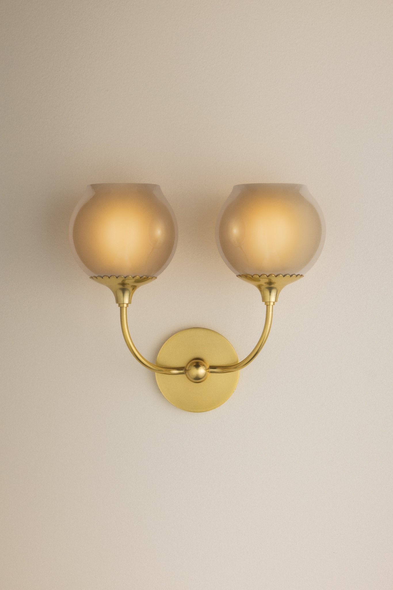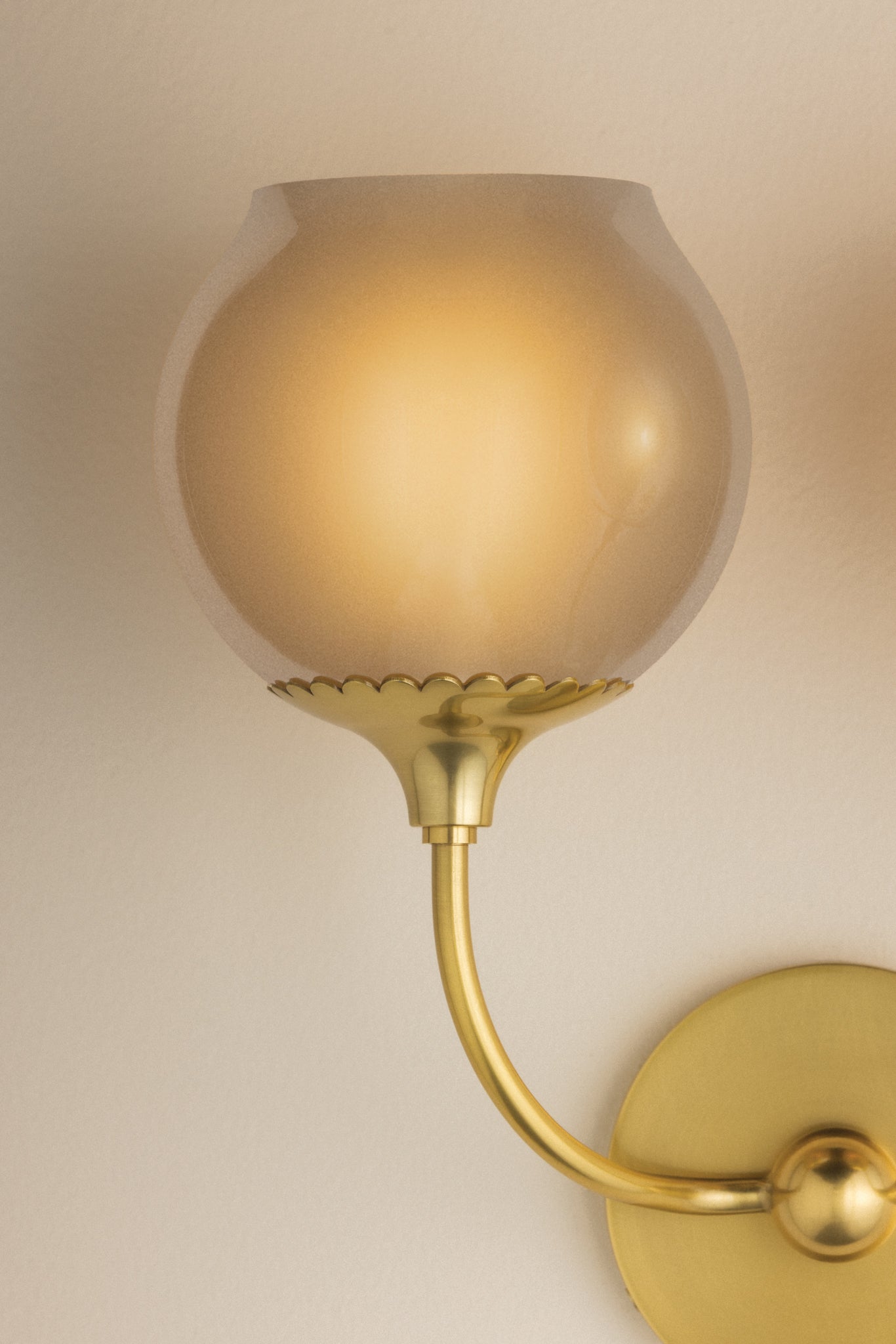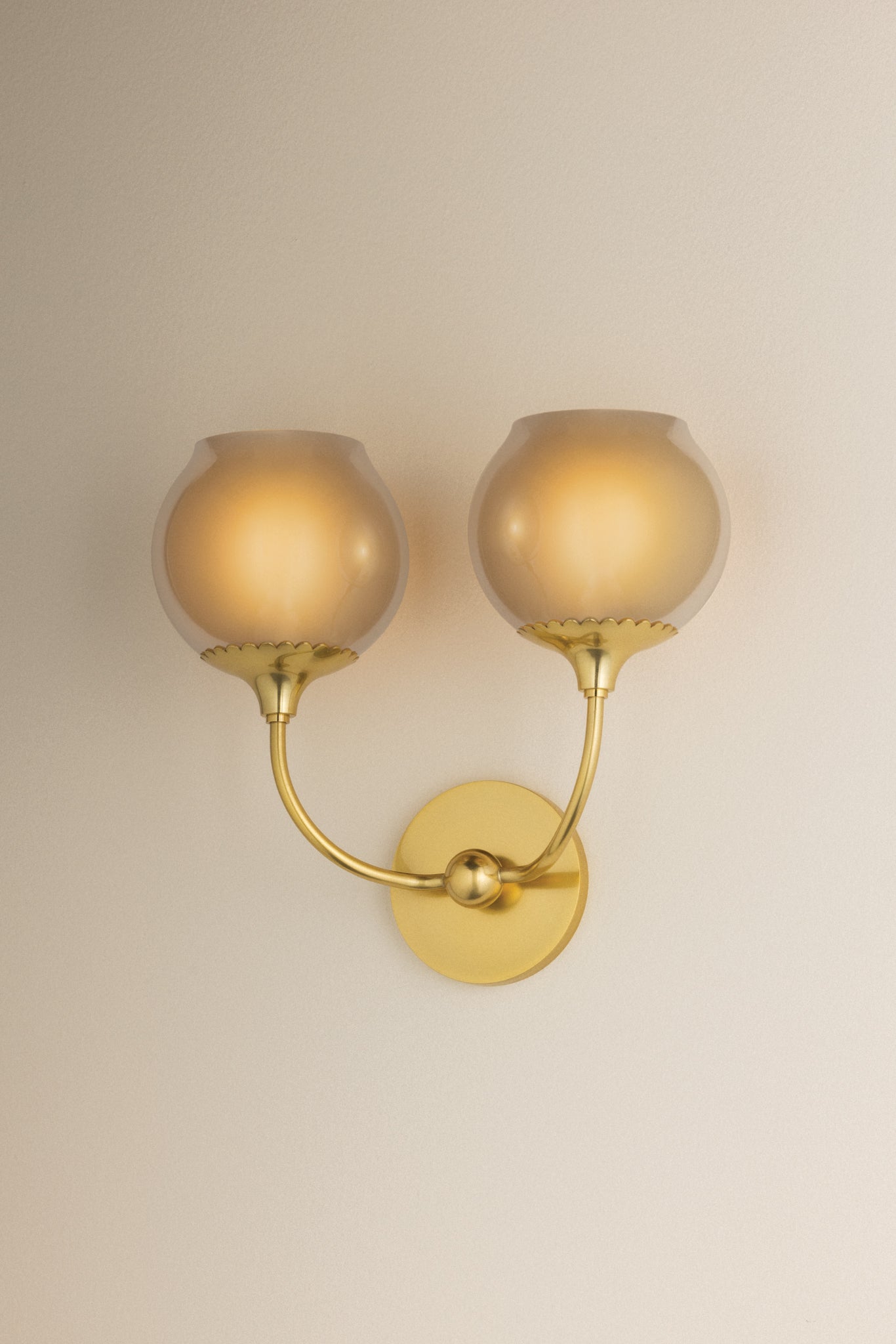Like a drop of morning dew, the Daya sconce delights with an opalescent, slightly botanical influence. Each reflective glass orb is tinted in a champagne finish and inside etched for a serene, glowing effect. Finished in Aged Brass, the curved armature culminates in a delicately scalloped fitter reminiscent of a flower. Available with 1 or 2 lights.