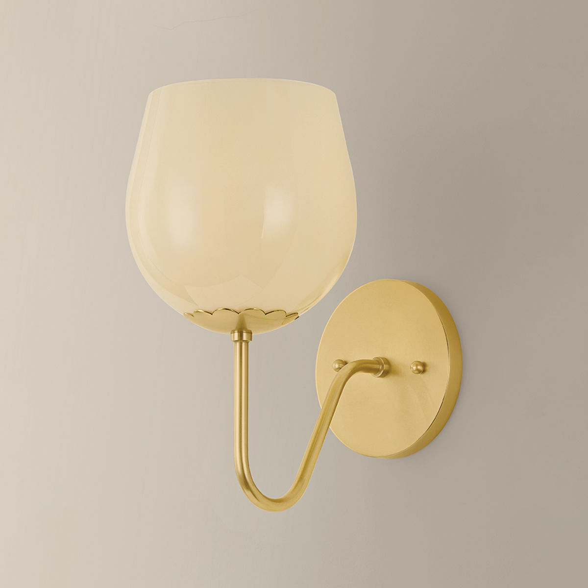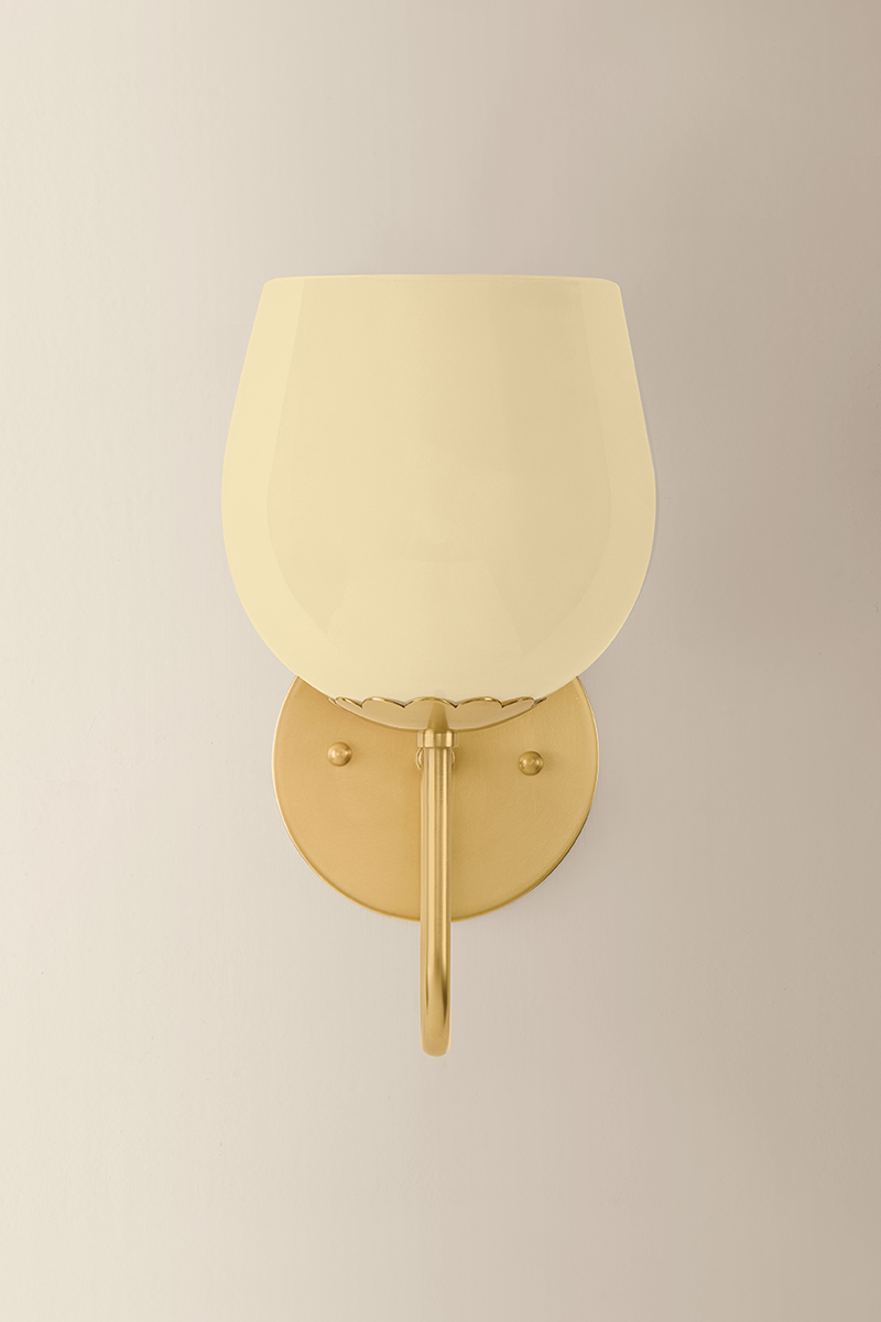 The Genevieve family blooms with vintage romance. Each arm unfurls like a stem to the sun, supporting a rosebud-shaped shade in Cream Opal glass. Recalling mid-century Italian lighting, the design includes a scalloped detail at each fitter and an Aged Brass finish on the frame. Available as a 1-light sconce and 5-light chandelier, Genevieve’s lyrical curves and pearlescent tones make for a compelling composition.