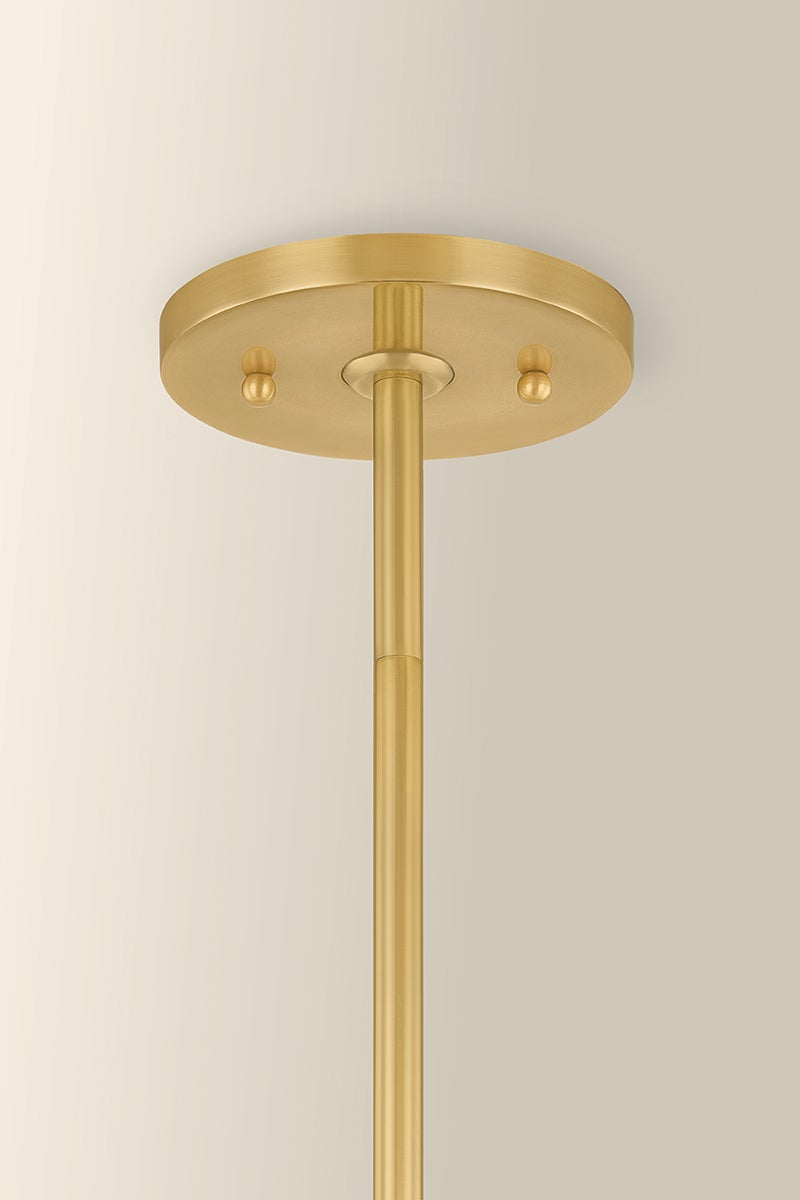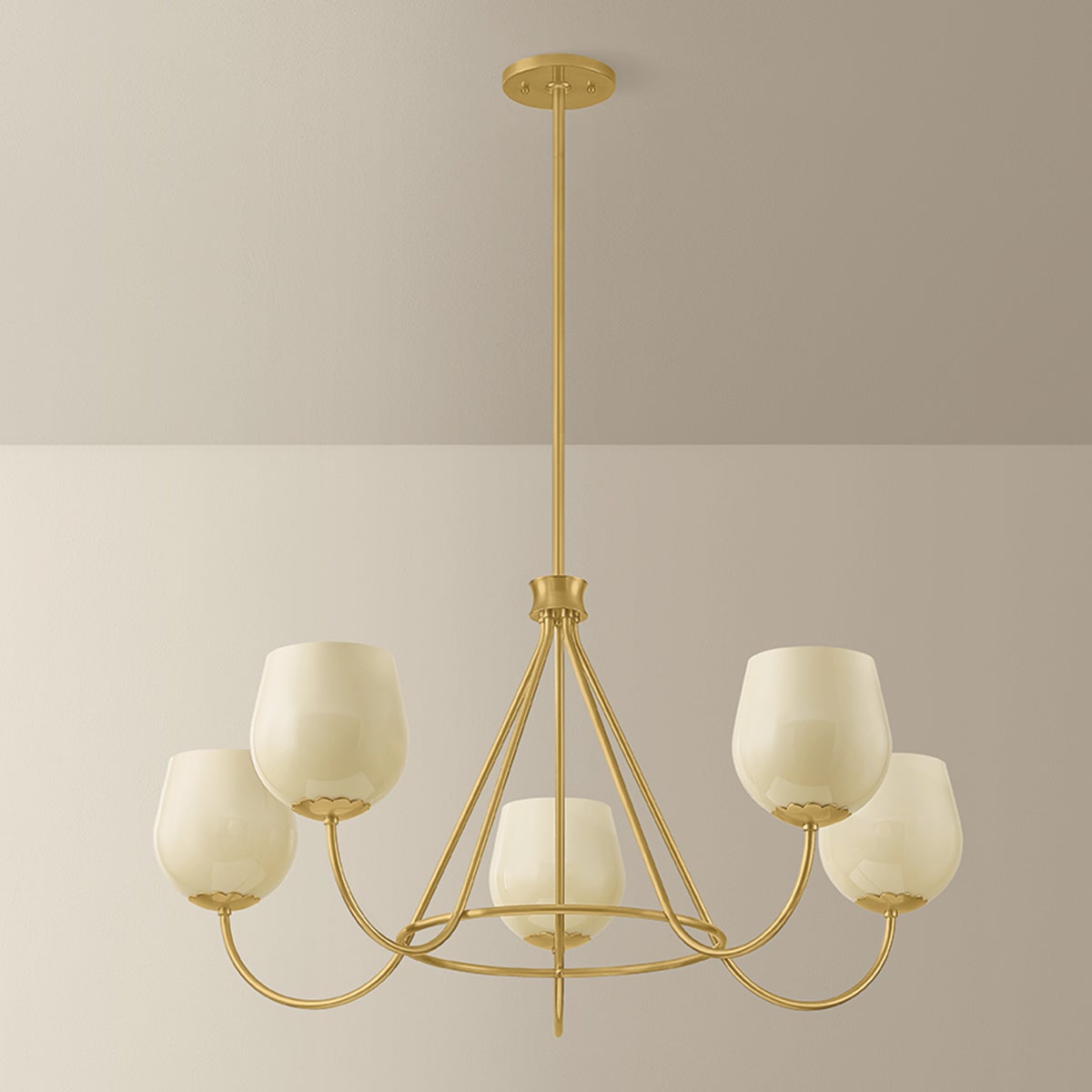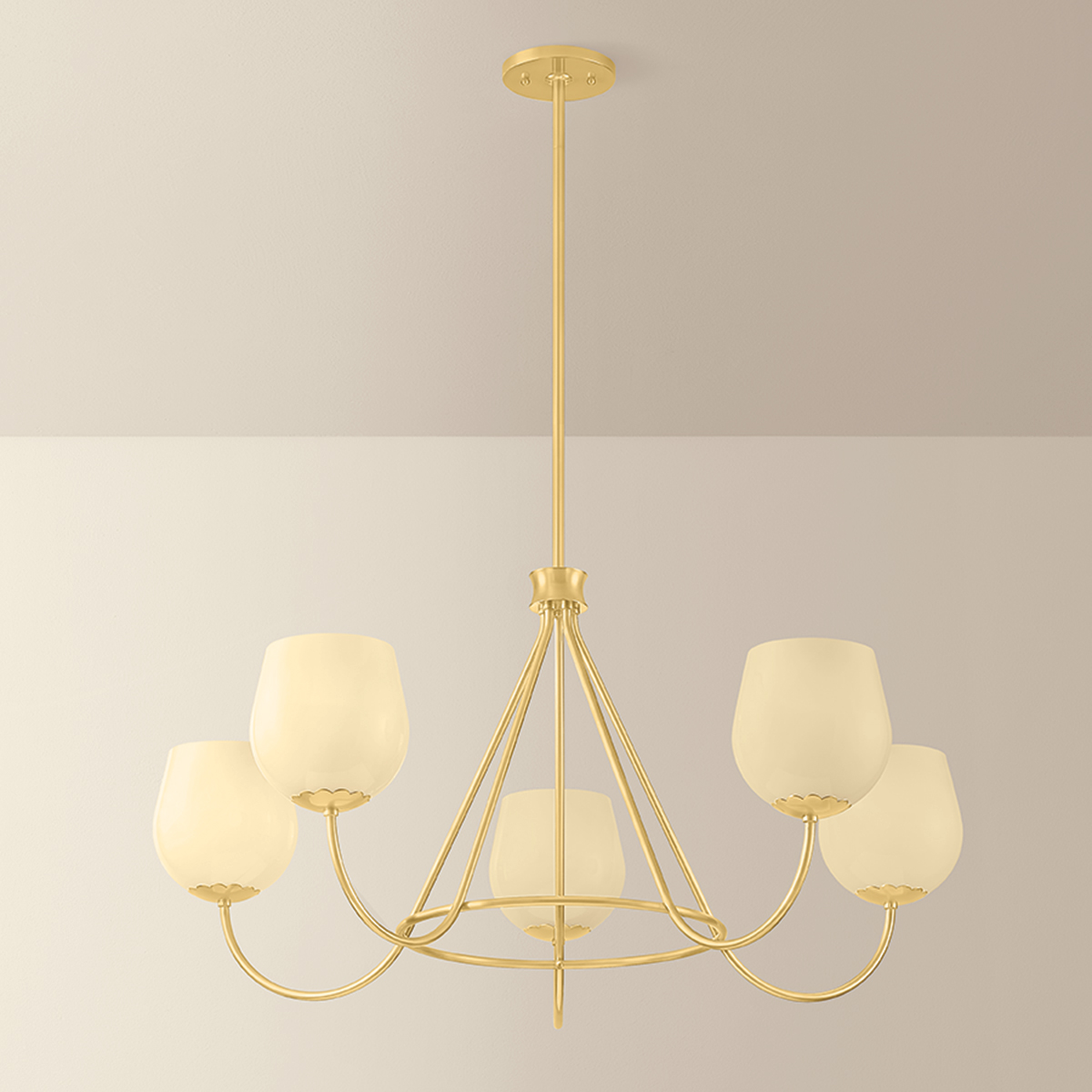 The Genevieve family blooms with vintage romance. Each arm unfurls like a stem to the sun, supporting a rosebud-shaped shade in Cream Opal glass. Recalling mid-century Italian lighting, the design includes a scalloped detail at each fitter and an Aged Brass finish on the frame. Available as a 1-light sconce and 5-light chandelier, Genevieve’s lyrical curves and pearlescent tones make for a compelling composition.