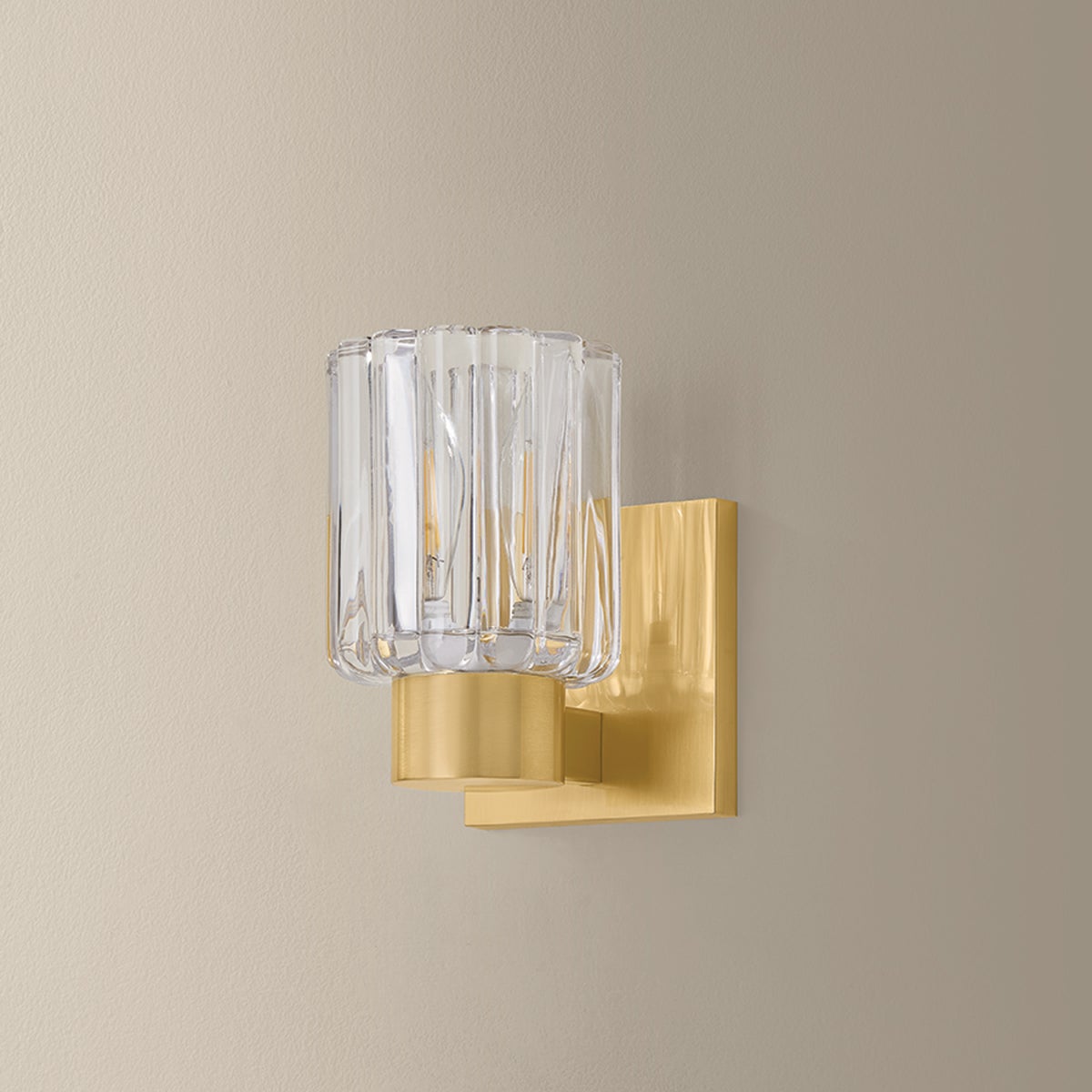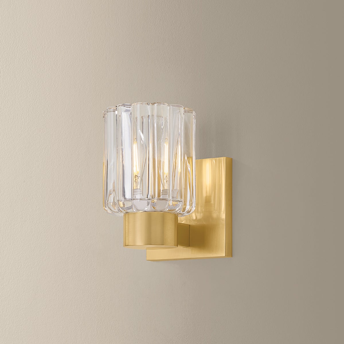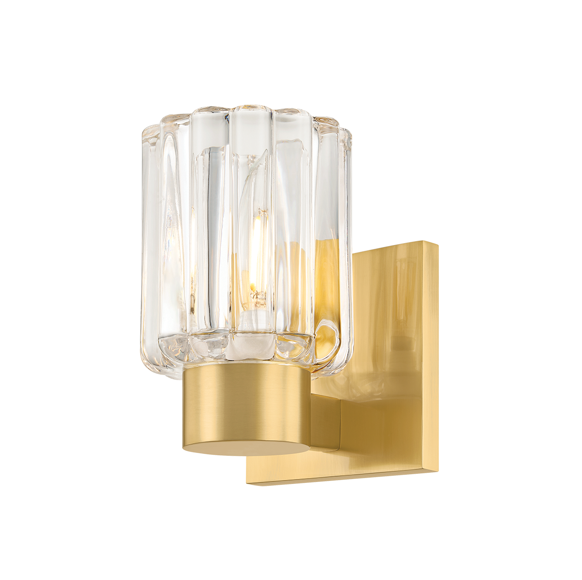 Inspired by the beauty of Orrefors vases, the Danae family pairs clean-cut metalwork with distinctive fluted glass. This petite bath sconce features a dense, scalloped glass shade that catches and scatters the glow within. Available with 1, 2, or 3 lights, and finished in Aged Brass or Polished Nickel, Danae is fresh, yet functional for a powder room or bath.