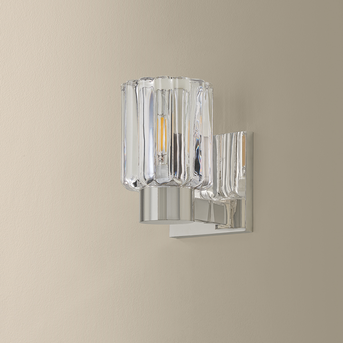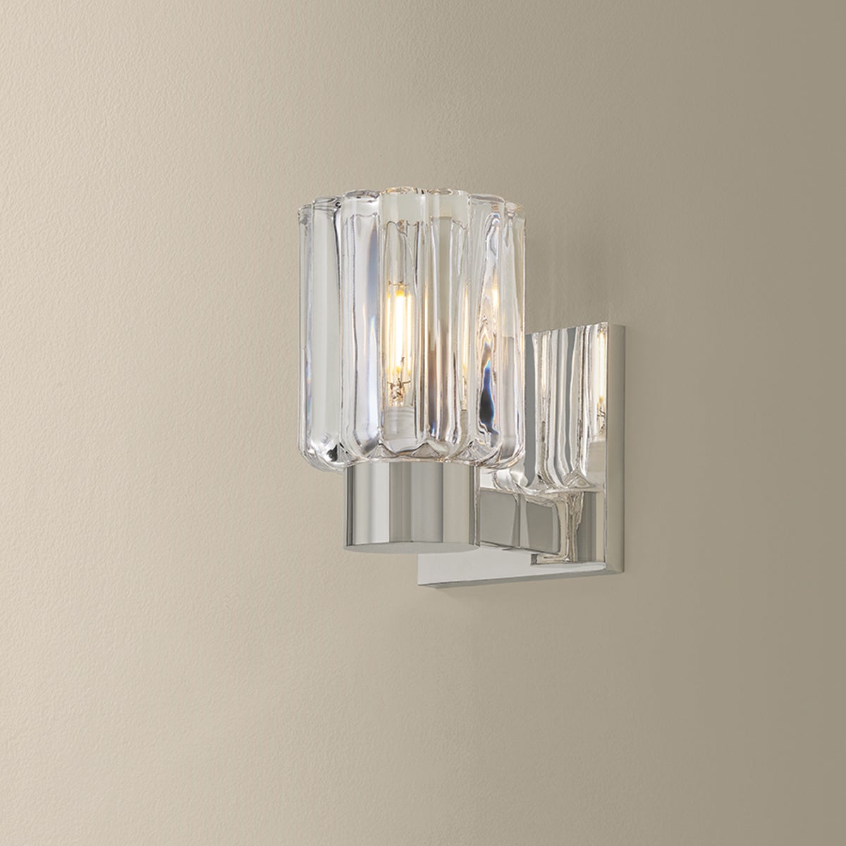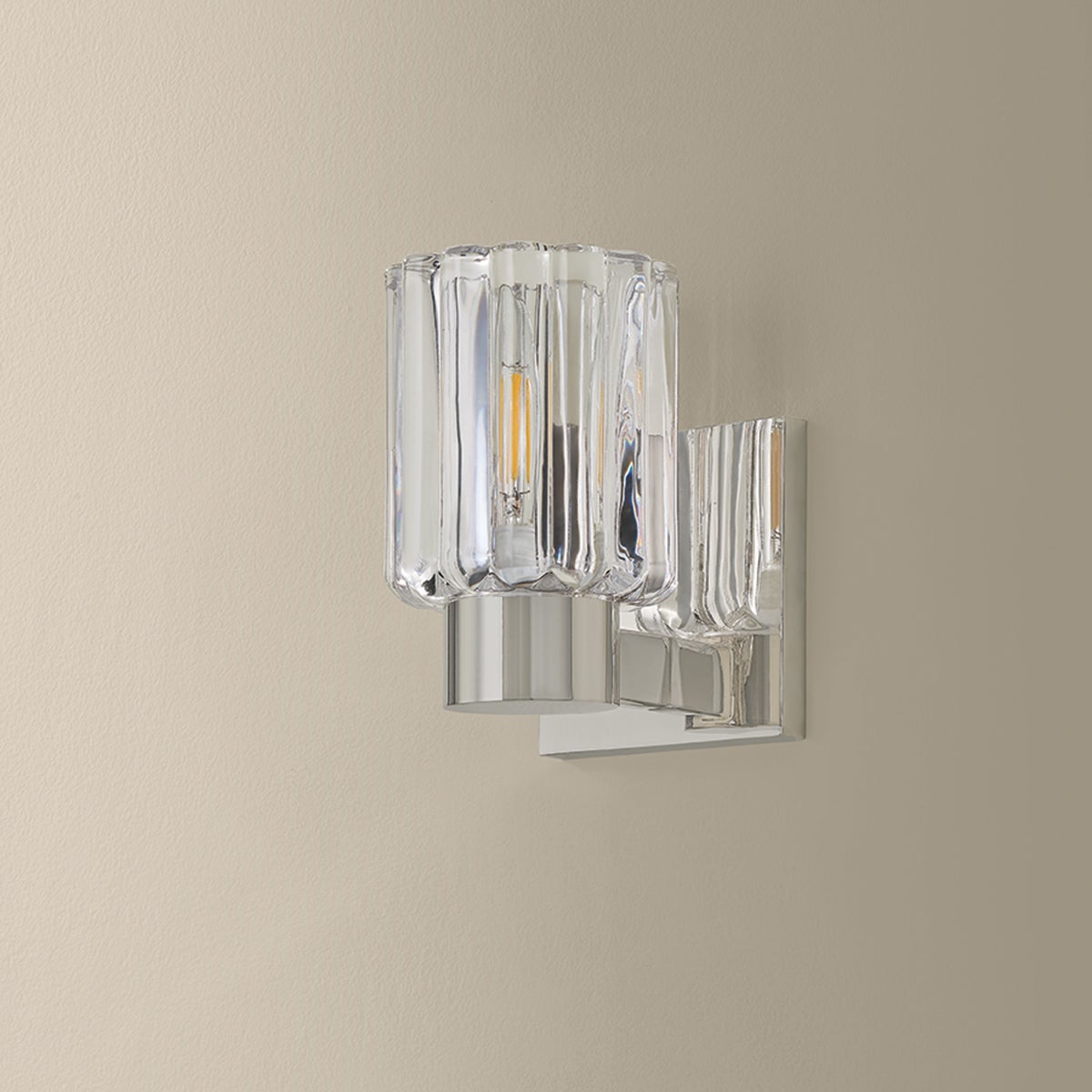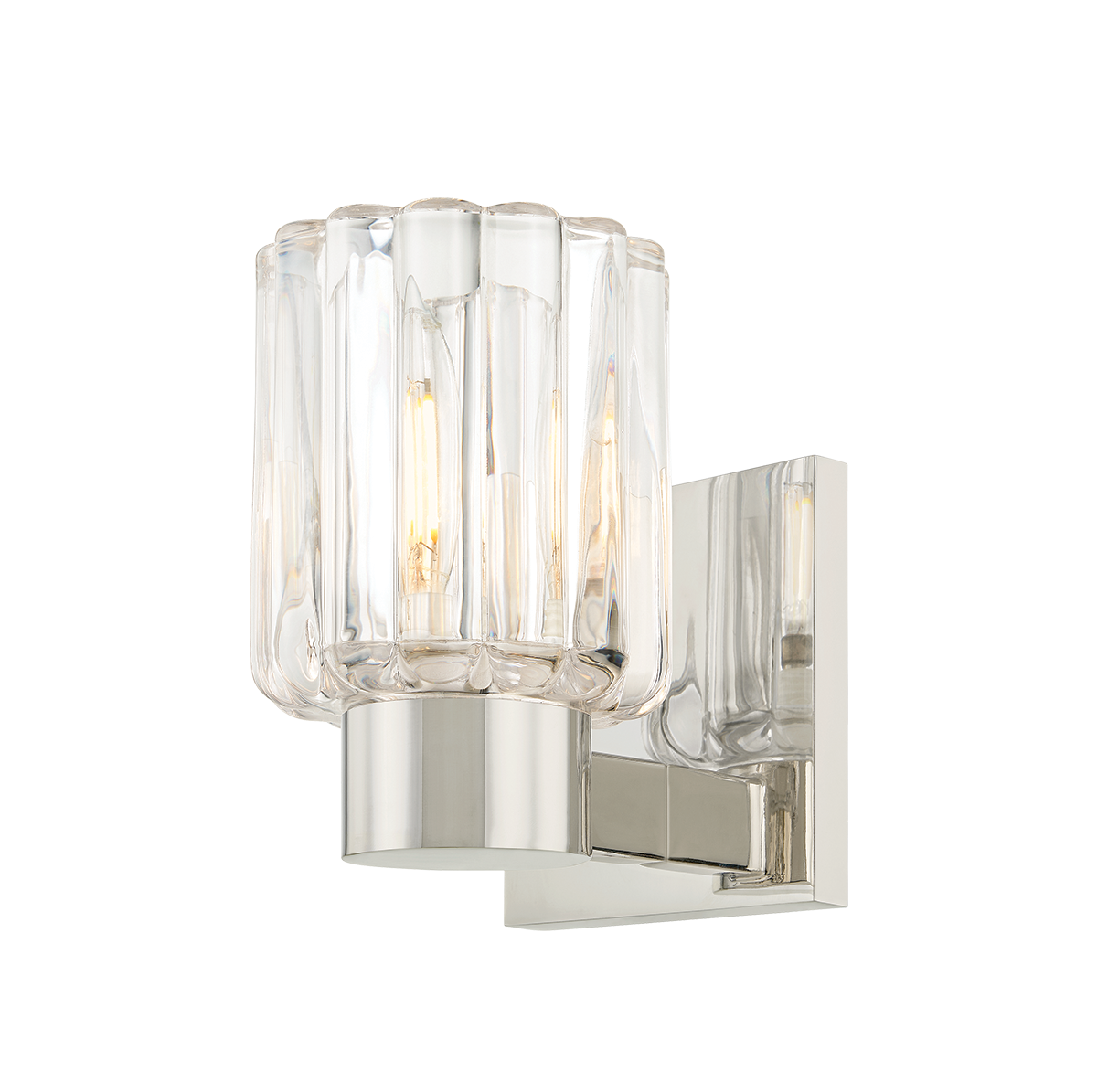 Inspired by the beauty of Orrefors vases, the Danae family pairs clean-cut metalwork with distinctive fluted glass. This petite bath sconce features a dense, scalloped glass shade that catches and scatters the glow within. Available with 1, 2, or 3 lights, and finished in Aged Brass or Polished Nickel, Danae is fresh, yet functional for a powder room or bath.