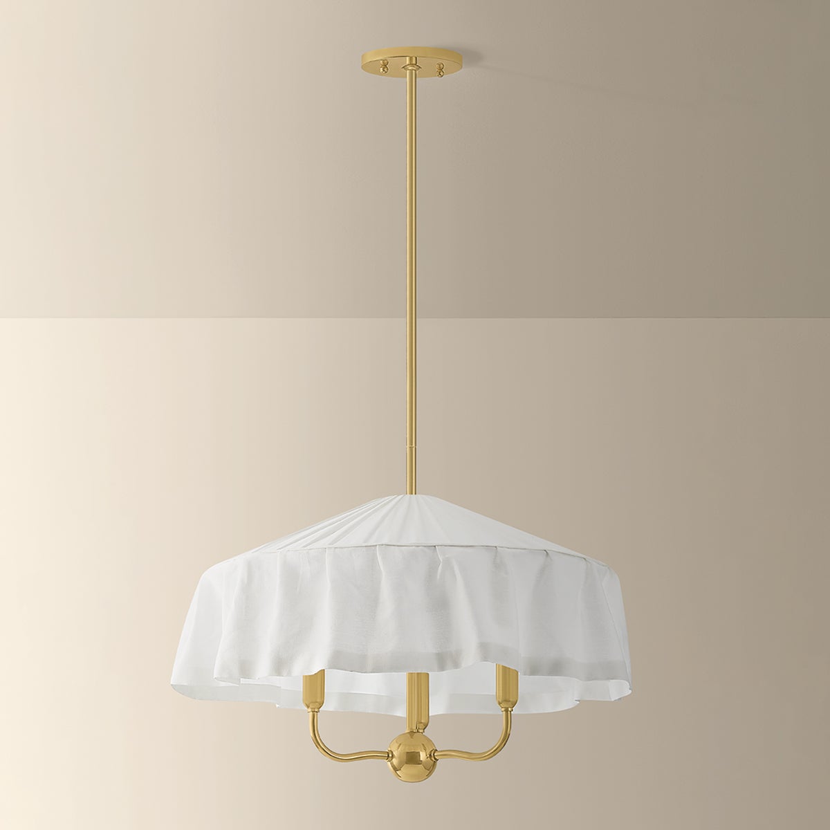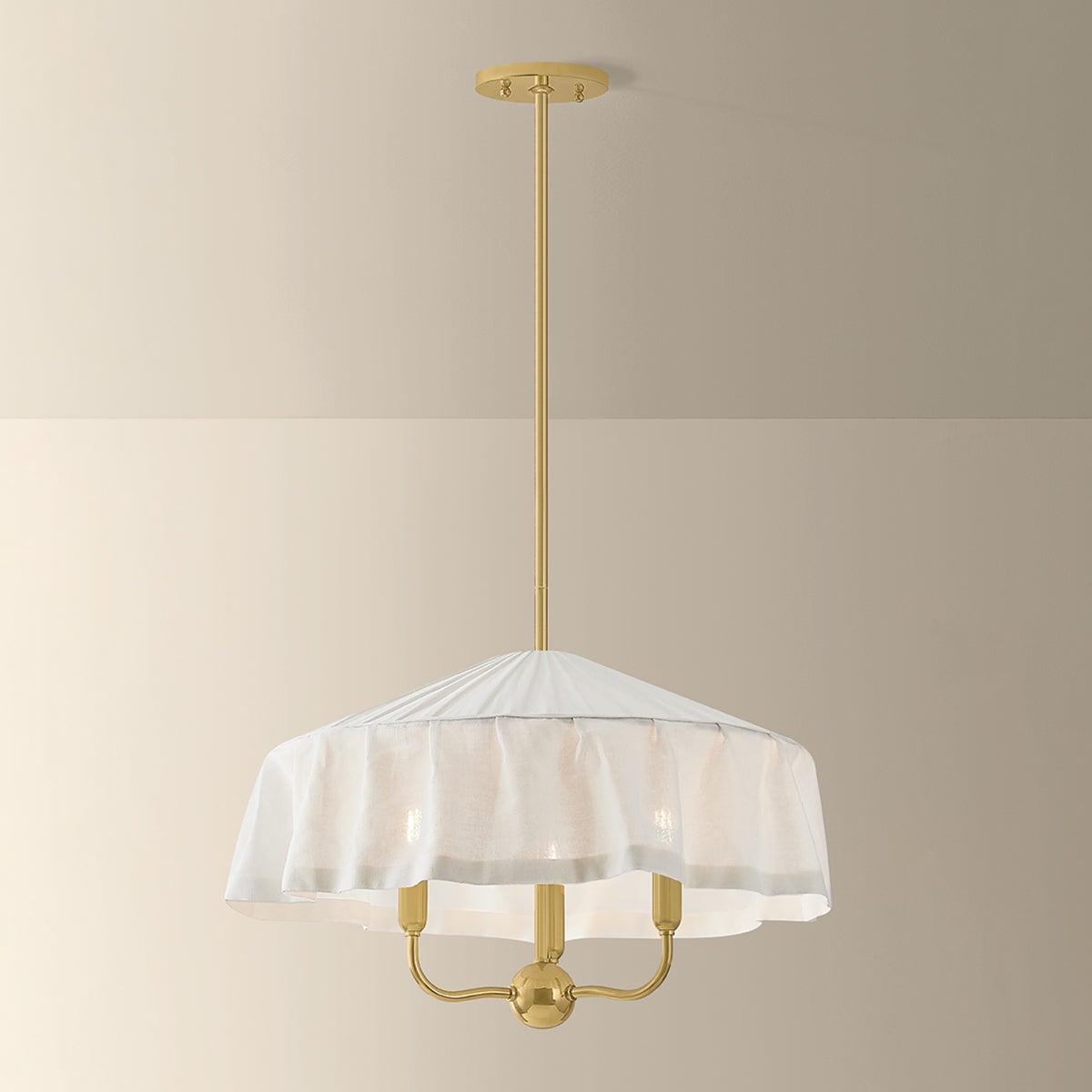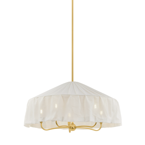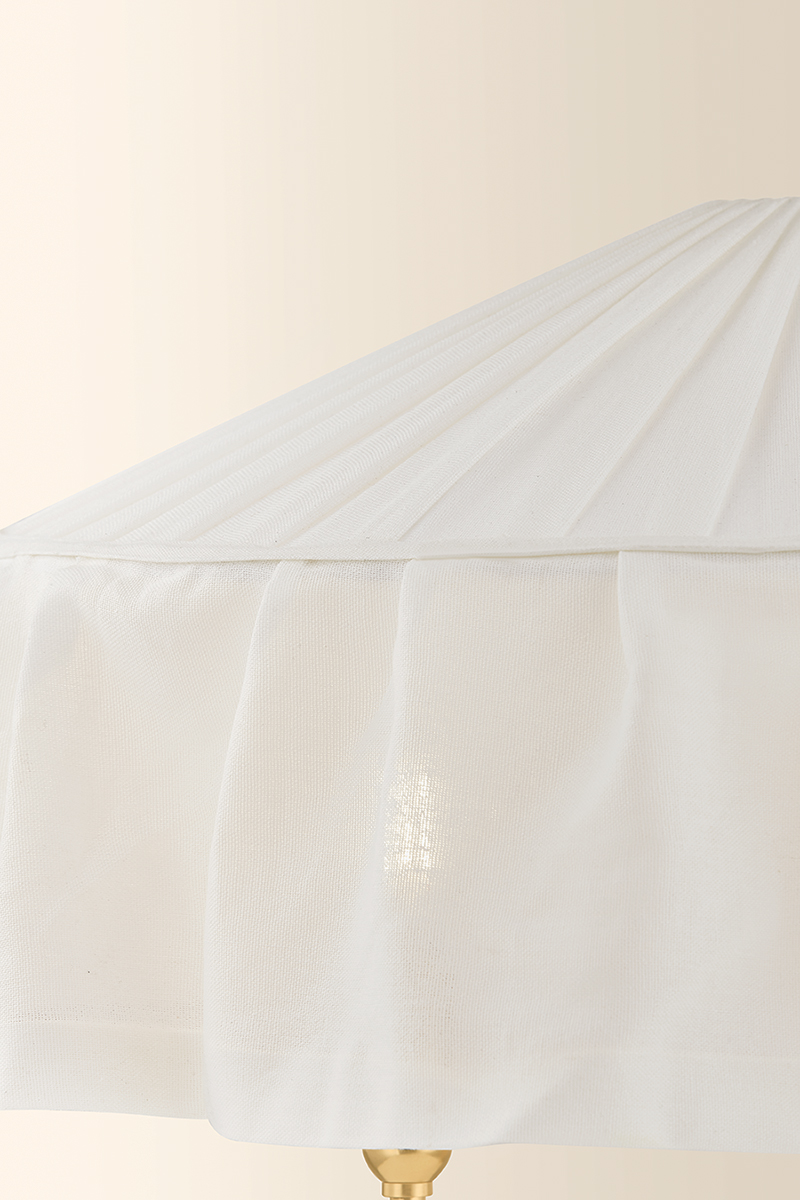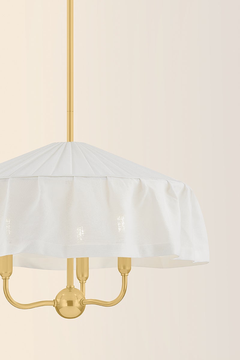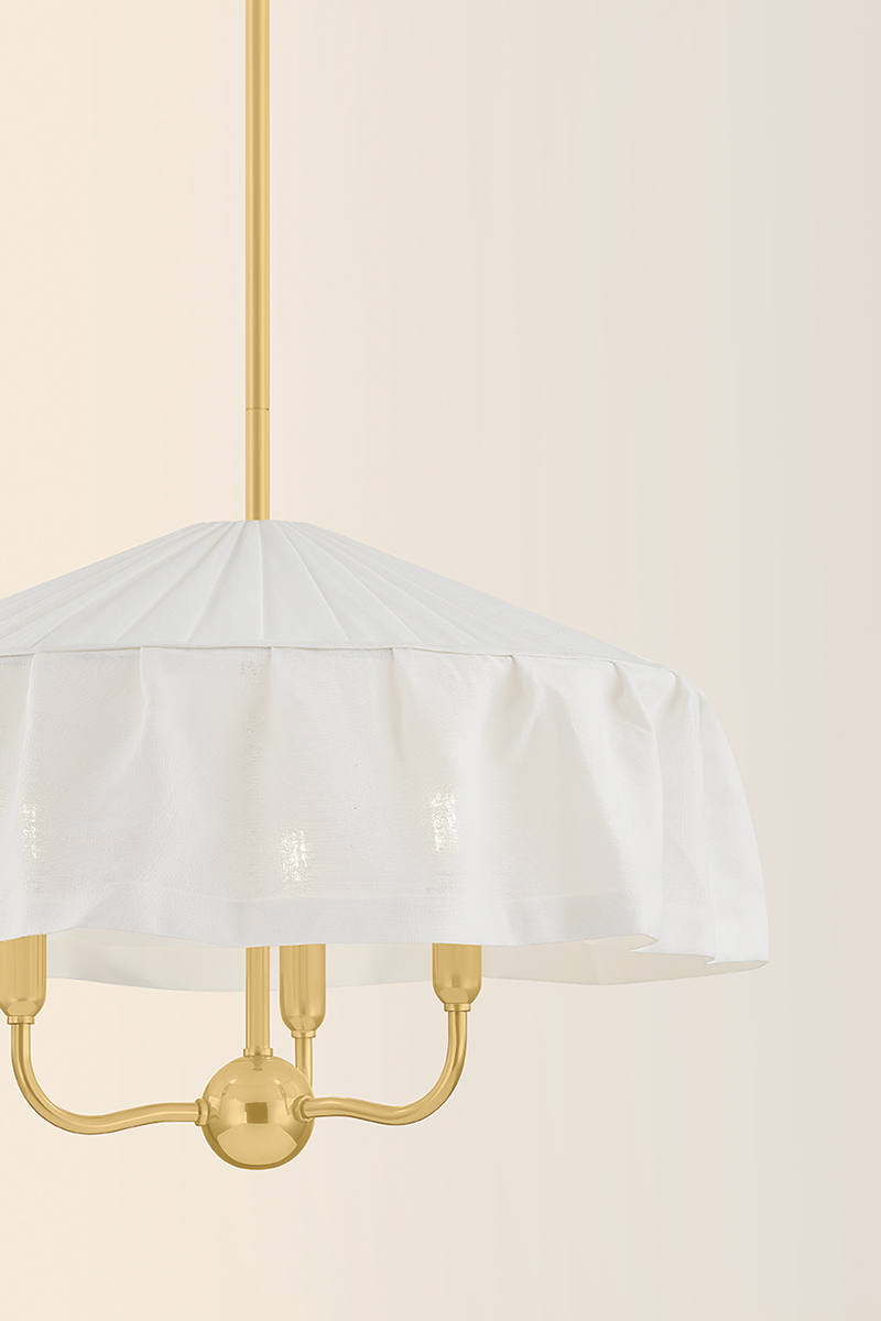 Paying homage to the modernist designs of Adolf Loos, the soft materiality of Shivonne creates a poetic statement piece. This ethereal chandelier features an ivory linen shade that loosely drapes like a skirt as it envelops a 3- or 5-light candle cluster. An Aged Brass finish on the frame adds to the vintage character, while a fabric-covered cord maintains a sense of cohesion with the shade.