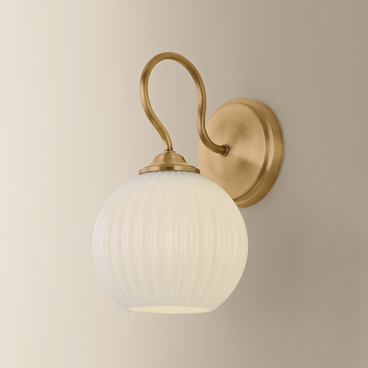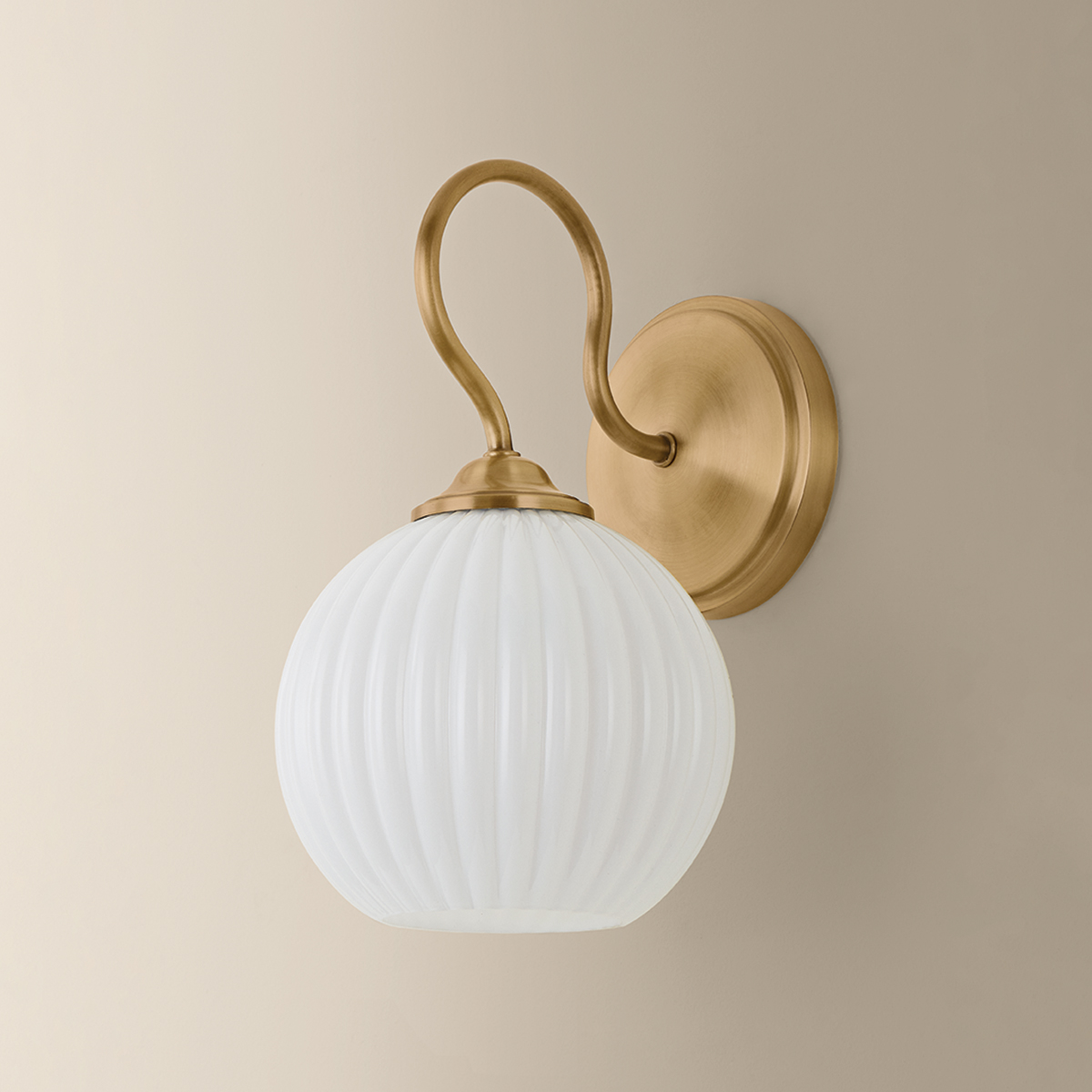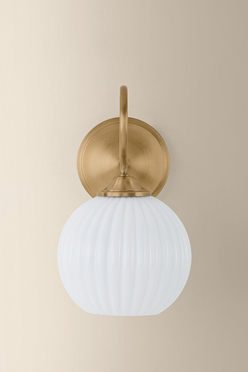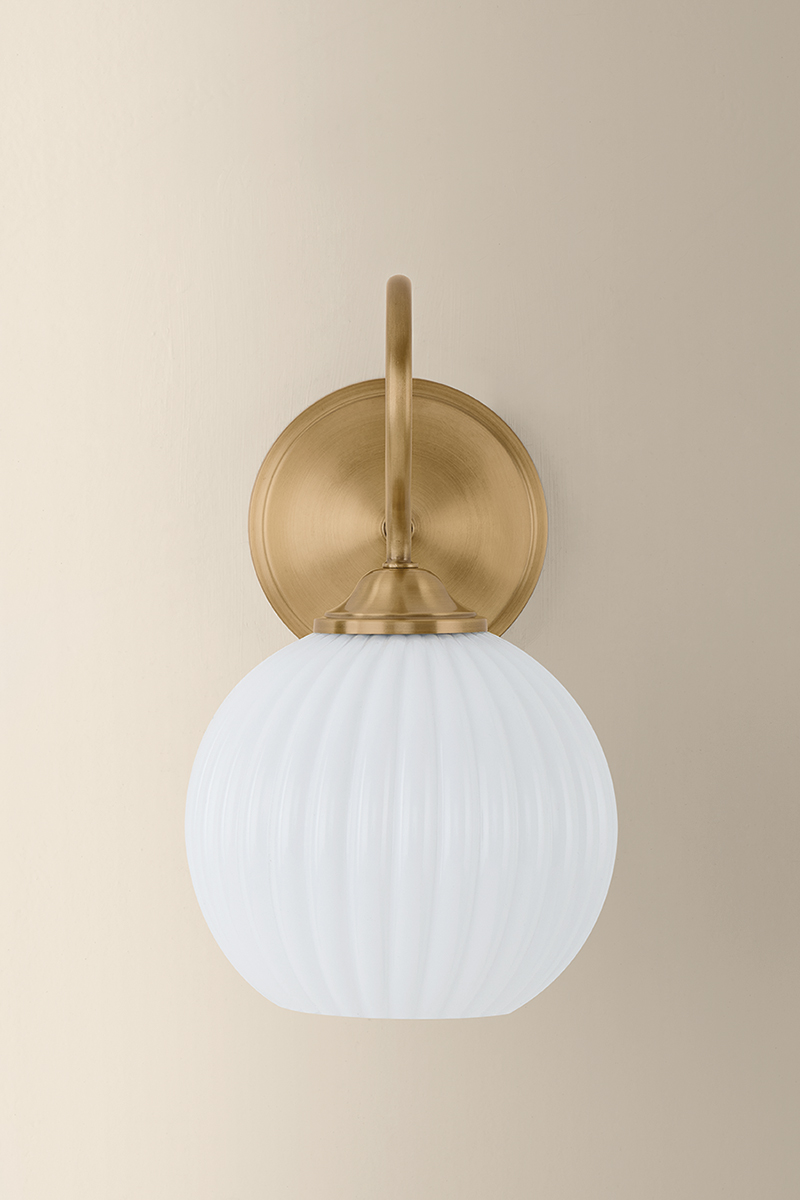 Bring a touch of charm to the wall with the Vida sconce. Recalling an antique design, a slender gooseneck arm with a Patina Brass finish blooms into a scalloped opal glass shade. The sweeping form and fluted glass create a sense of balance and movement that embellishes a small space.