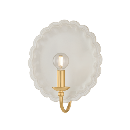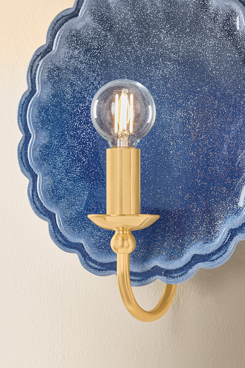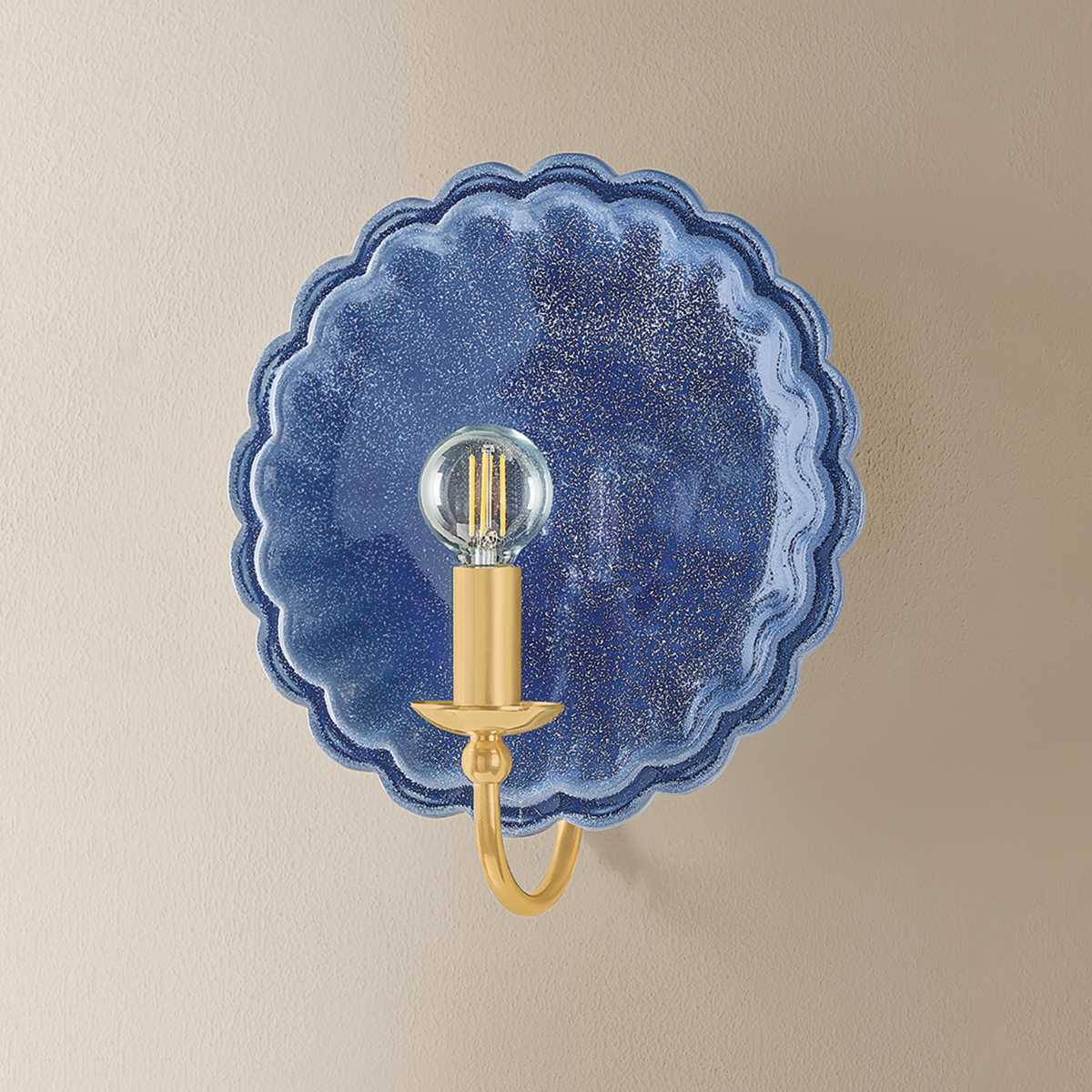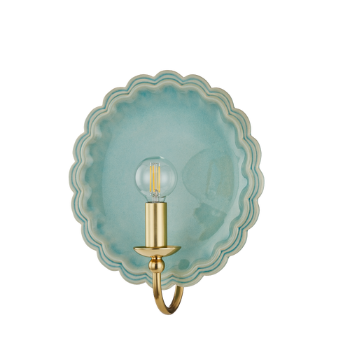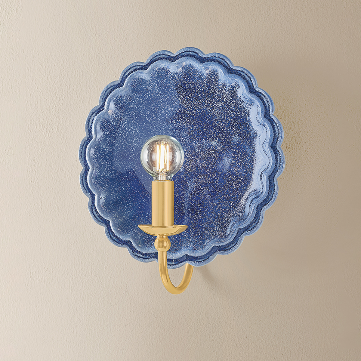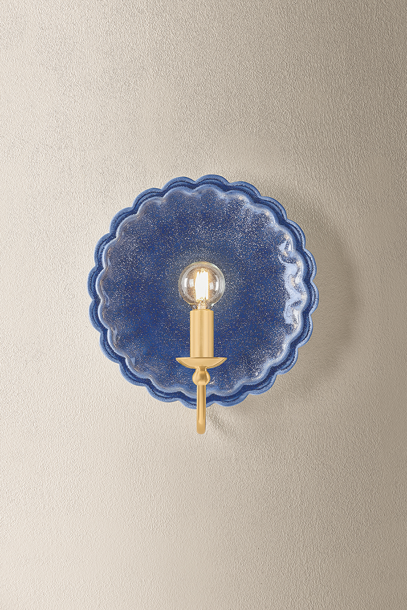The delicately scalloped Paulette sconce embodies the spirit of new Romanticism, transforming functional lighting into artful expression. A hand-sculpted ceramic backplate creates an expressive vignette in either Gossamer Ivory, Indigo Wash, or a Moss Crackle glaze. An Aged Brass gooseneck arm introduces a heritage detail that completes this transitional fixture.