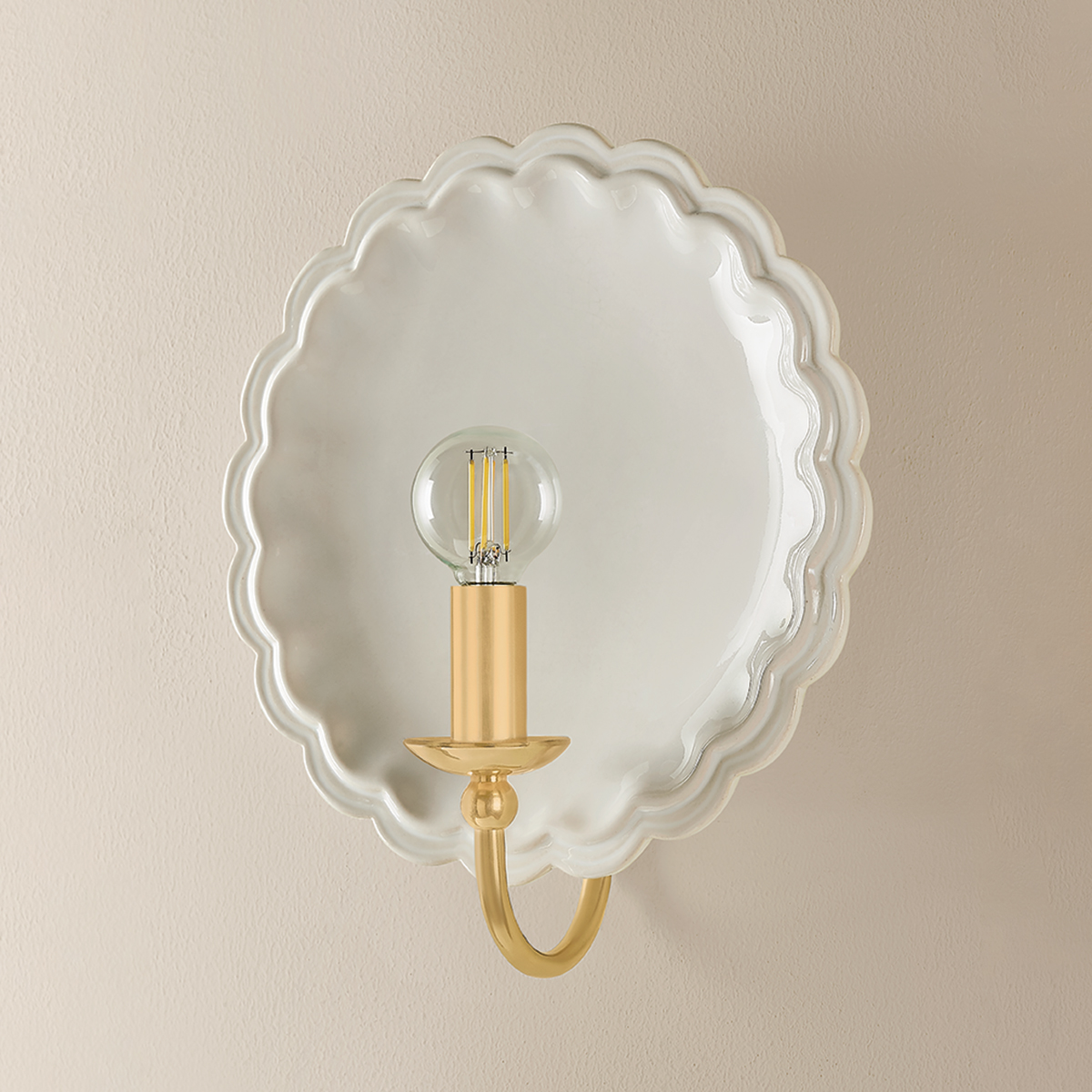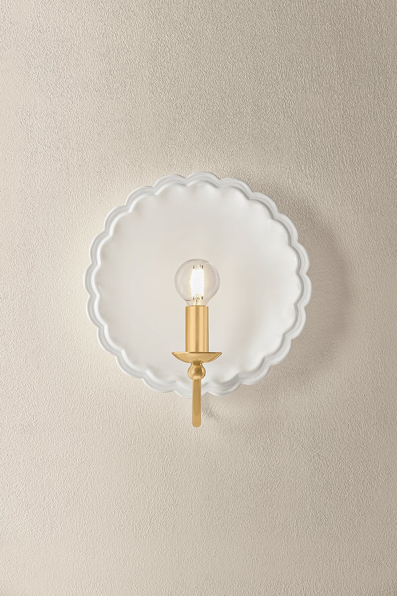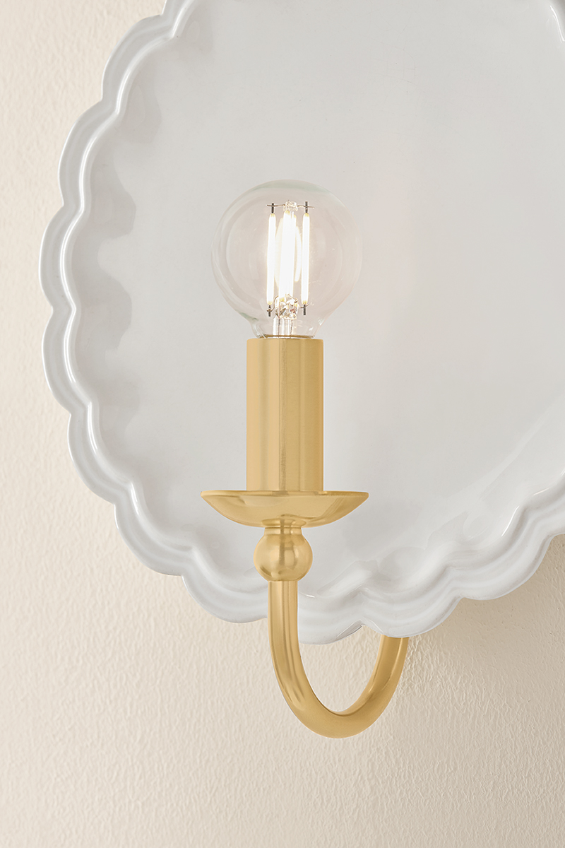 The delicately scalloped Paulette sconce embodies the spirit of new Romanticism, transforming functional lighting into artful expression. A hand-sculpted ceramic backplate creates an expressive vignette in either Gossamer Ivory, Indigo Wash, or a Moss Crackle glaze. An Aged Brass gooseneck arm introduces a heritage detail that completes this transitional fixture.