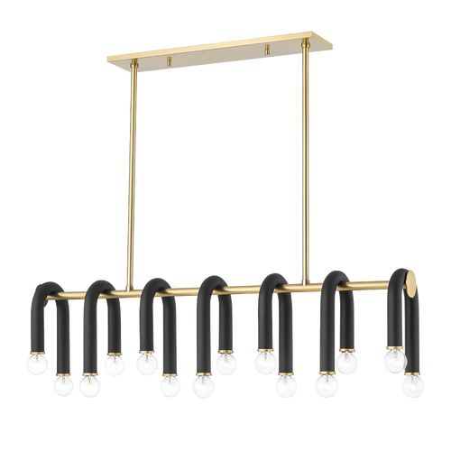 Whimsical for the win. A playful take on modern design, Whit features a sweeping black metal tube draped over aged brass or polished nickel accents. The uneven lines create visual interest and allow light to shine at slightly different heights. Choose from a pendant, chandelier, linear, floor lamp or wall sconce that can be mounted to provide either uplight or downlight.