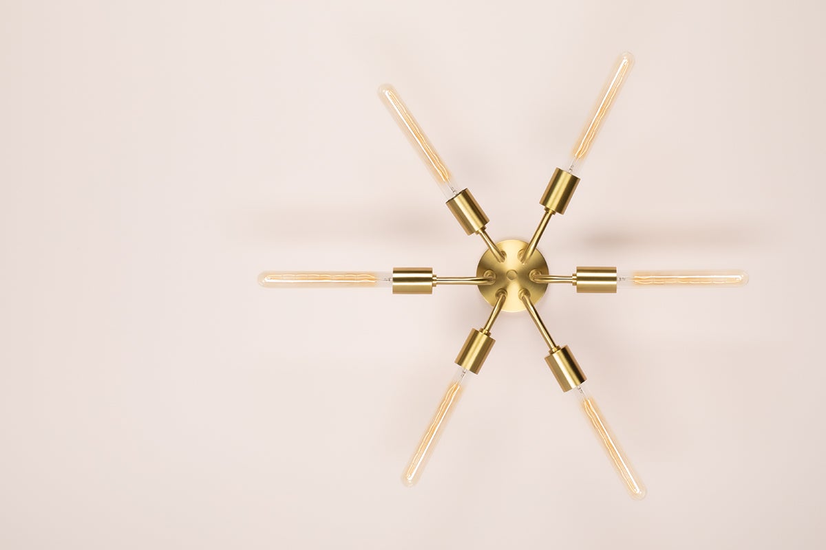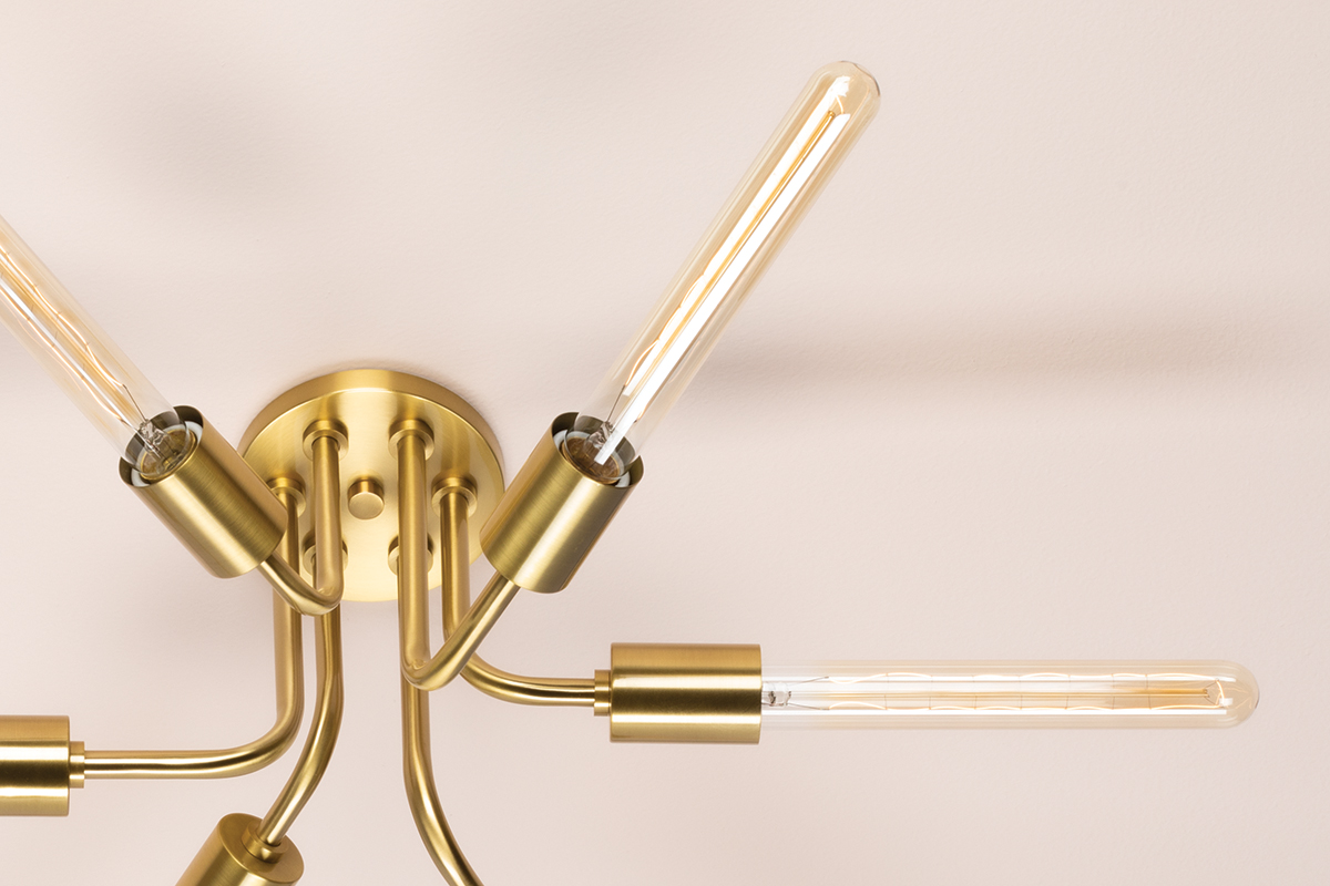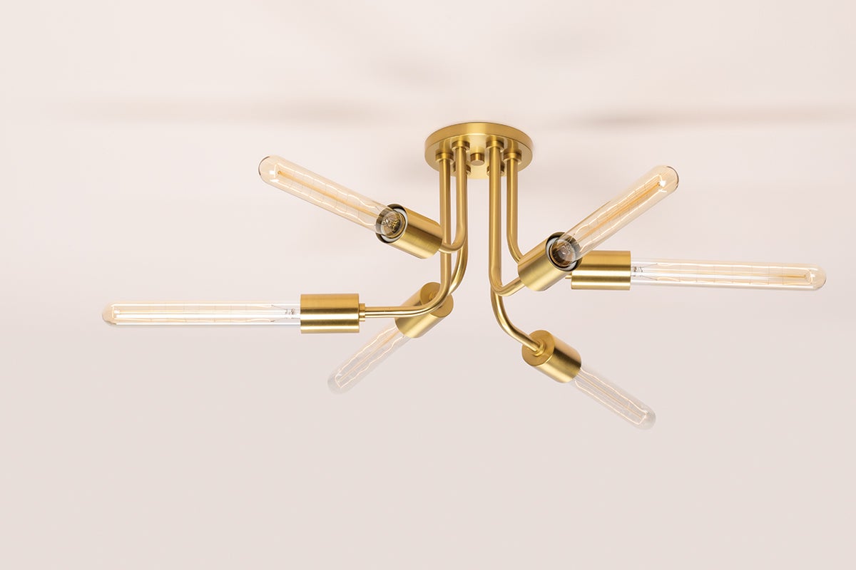 Boob lights be gone! Why settle for ordinary when you can punch up your style with unique flush mounts like Donny? Tubular bulbs extend outwards on varying planes, creating visual intrigue and depth. Bet you didn't know a flush mount could do that! Available in aged brass and polished nickel, Donny sets a new standard for ceiling lighting.