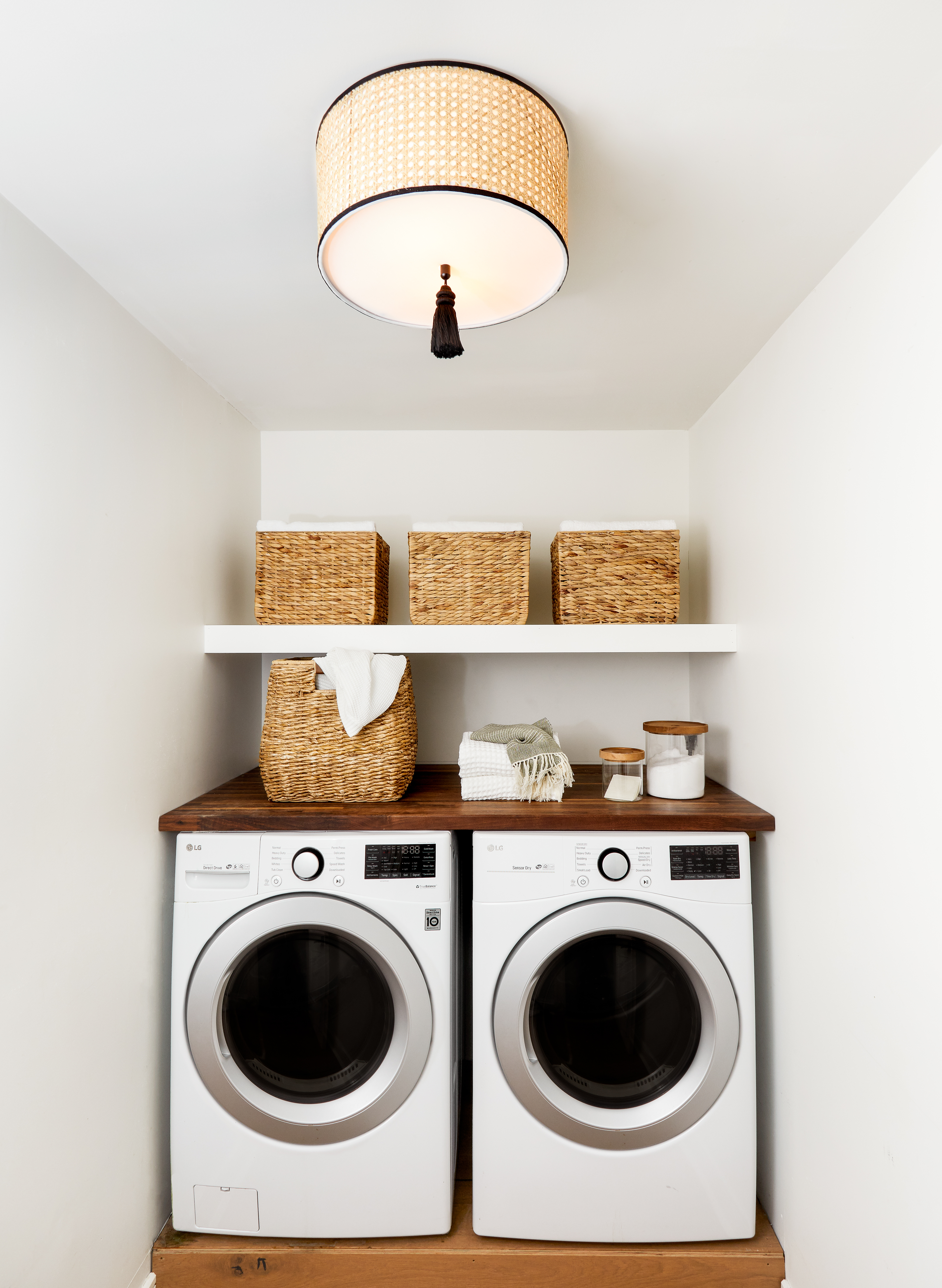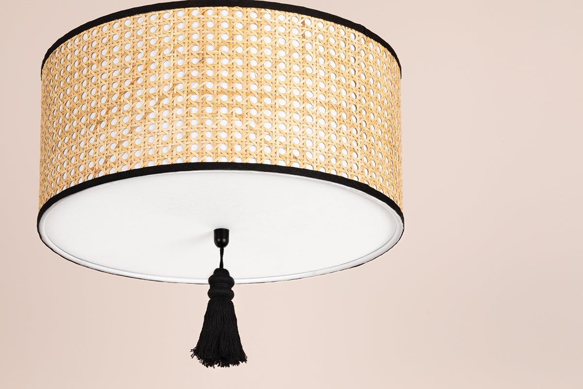 A bohemian darling, Dolores is brimming with theatrical flair. Dolores pays homage to the cane mania of the 70s, reinvented for today. Natural cane is woven intricately around a white cotton shade, contrasted with a soft black finish. The flush mount and pendant versions feature a decorative tassel for good measure.