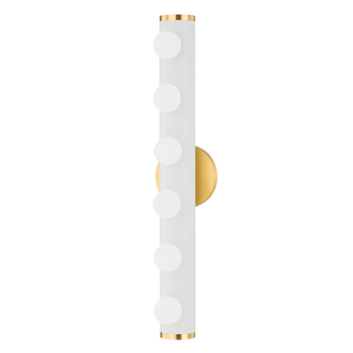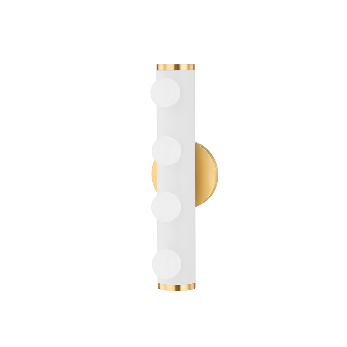 Penny gives familiar Hollywood-style lighting a fresh feel. Small opal matte globes spread across a cylinder of textured white or textured black for a glamorous look that provides ample bright light. An aged brass backplate and decorative end caps give the fixture a fun, updated look. With the ability to mount horizontally or vertically, Penny makes perfect sense over or alongside the vanity in the bath.
