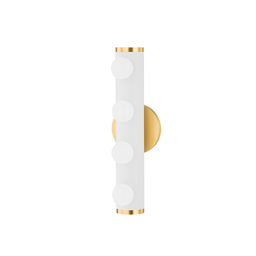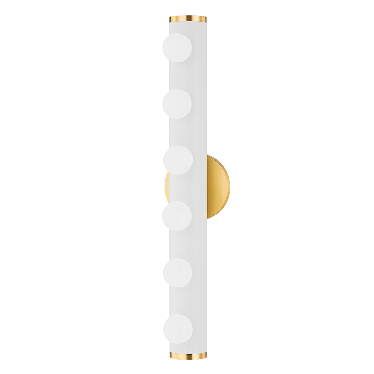 Penny gives familiar Hollywood-style lighting a fresh feel. Small opal matte globes spread across a cylinder of textured white or textured black for a glamorous look that provides ample bright light. An aged brass backplate and decorative end caps give the fixture a fun, updated look. With the ability to mount horizontally or vertically, Penny makes perfect sense over or alongside the vanity in the bath.