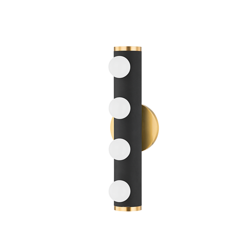 Penny gives familiar Hollywood-style lighting a fresh feel. Small opal matte globes spread across a cylinder of textured white or textured black for a glamorous look that provides ample bright light. An aged brass backplate and decorative end caps give the fixture a fun, updated look. With the ability to mount horizontally or vertically, Penny makes perfect sense over or alongside the vanity in the bath.