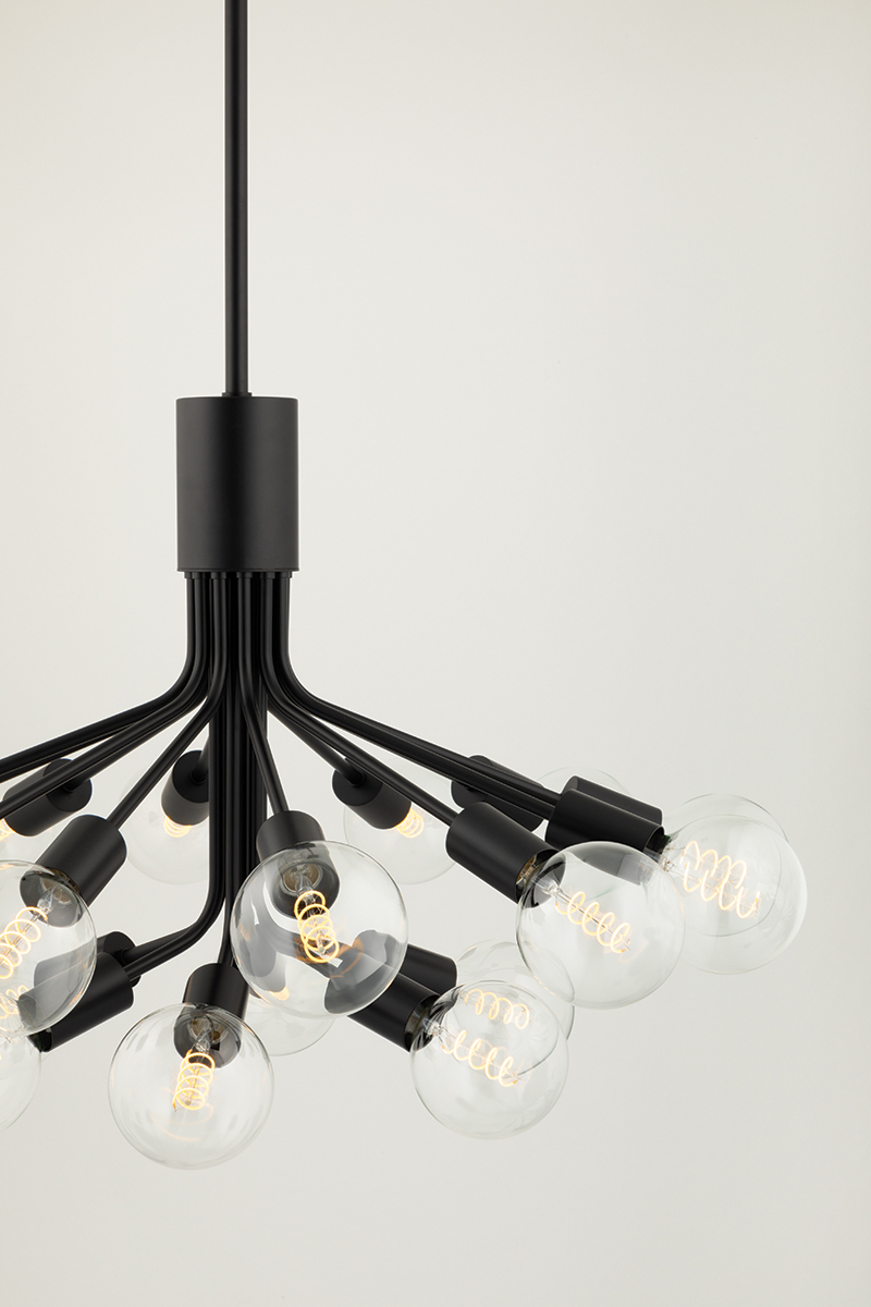 The Drea Wall Sconce, Chandelier, and Semi Flush feature a soft black finish on pivoting arms. Traditional clear bulbs transform the design.