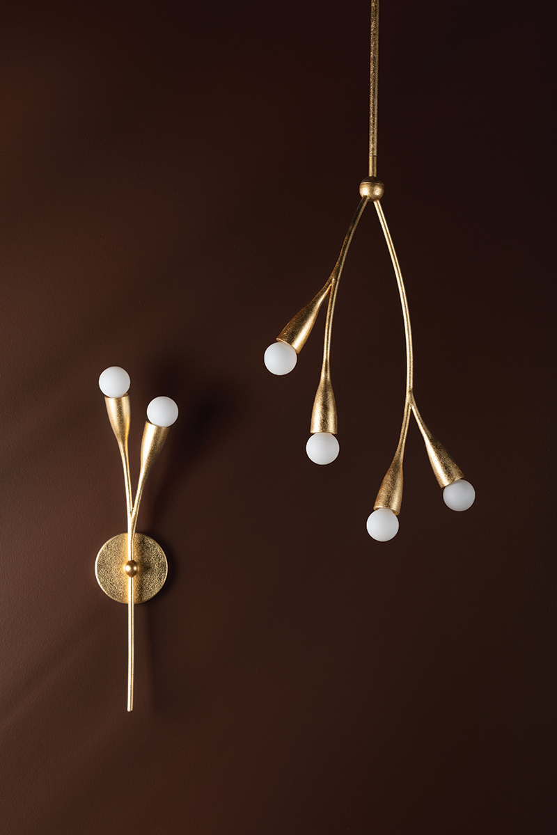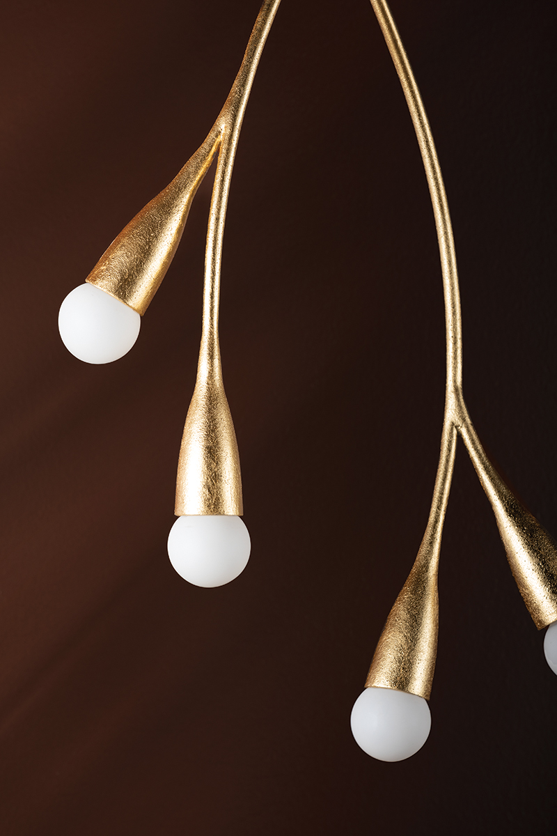 Bursting with style, Elsa draws inspiration from cherry blossom trees. Slender arms branch out from small spheres, ending in buds of petite matte white globes. This soothing, organic design is available as a wall sconce, pendant, linear, and chandelier in Gold Leaf and Textured White. For the best look, we recommend G16.5 incandescent matte white finish bulbs.
