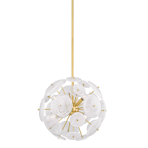 Gorgeous layers of Capiz shell, in alternating circles and rectangles, dangle from an Aged Brass frame for a sophisticated coastal aesthetic. This stunning design, available in a small and large chandelier, is the perfect centerpiece for your bedroom or living room update. Part of our Megan Molten x Mitzi Tastemakers collection.