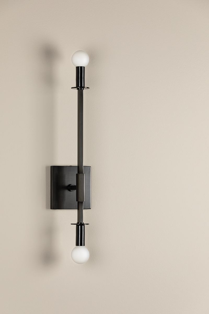 Milana takes proportion play to the next level, delivering a statement-making wall sconce with brilliant form. A square backplate and center arm are strong modern features, offsetting the rounded curves in the sockets and bulbs. Finished in aged brass, polished nickel, and old bronze.