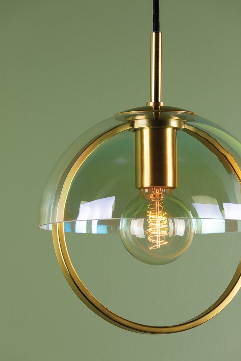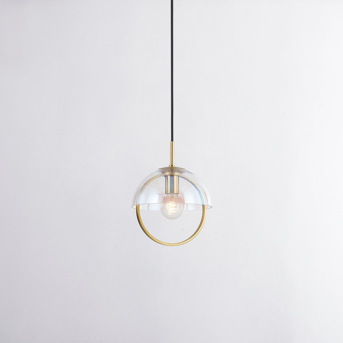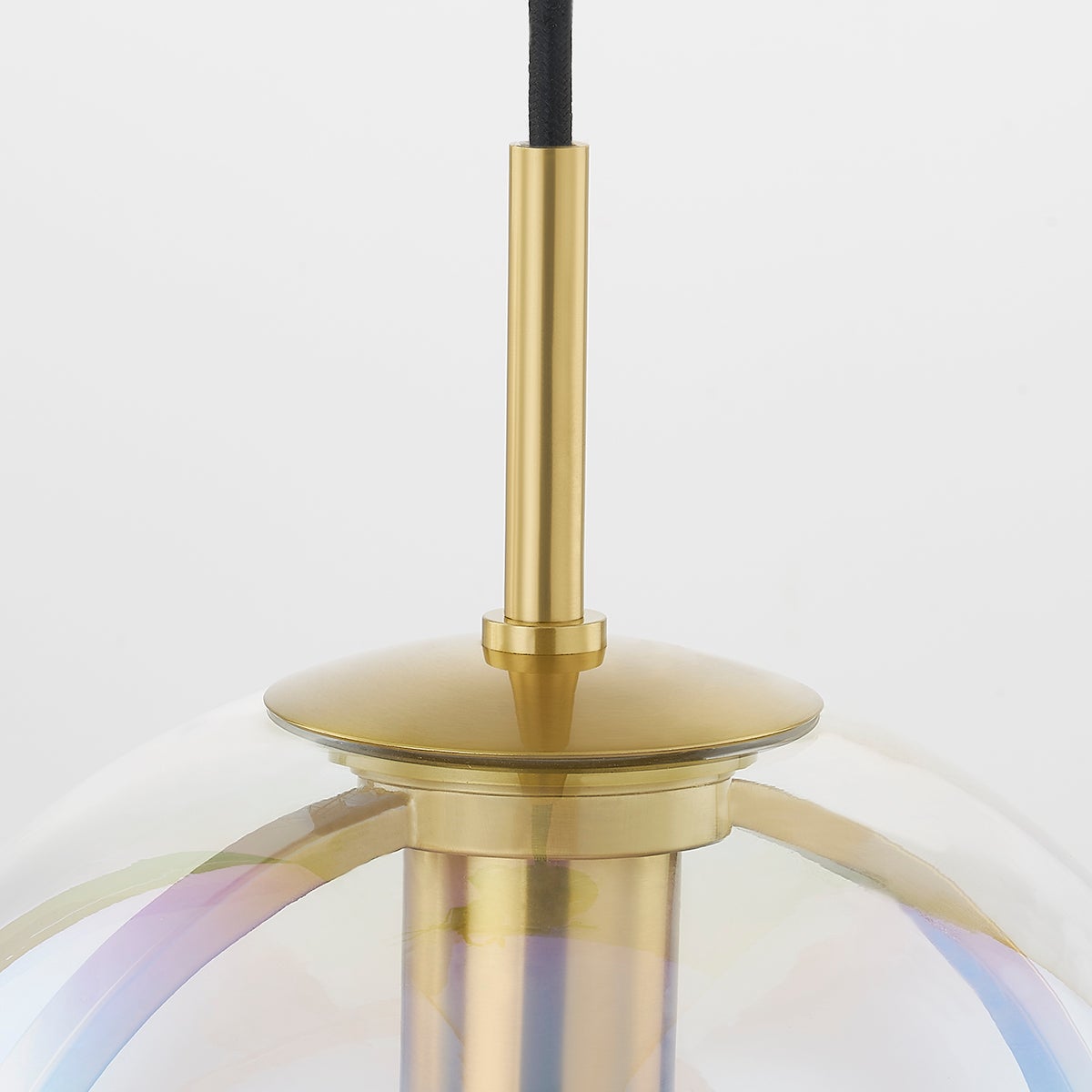 Meriah cascades effortlessly like a pendant necklace, featuring layers of spherical shapes. The aged brass frame hangs within an iridescent glass shade, lending a subtle sparkle to the dome silhouette. Also available in a smaller size.