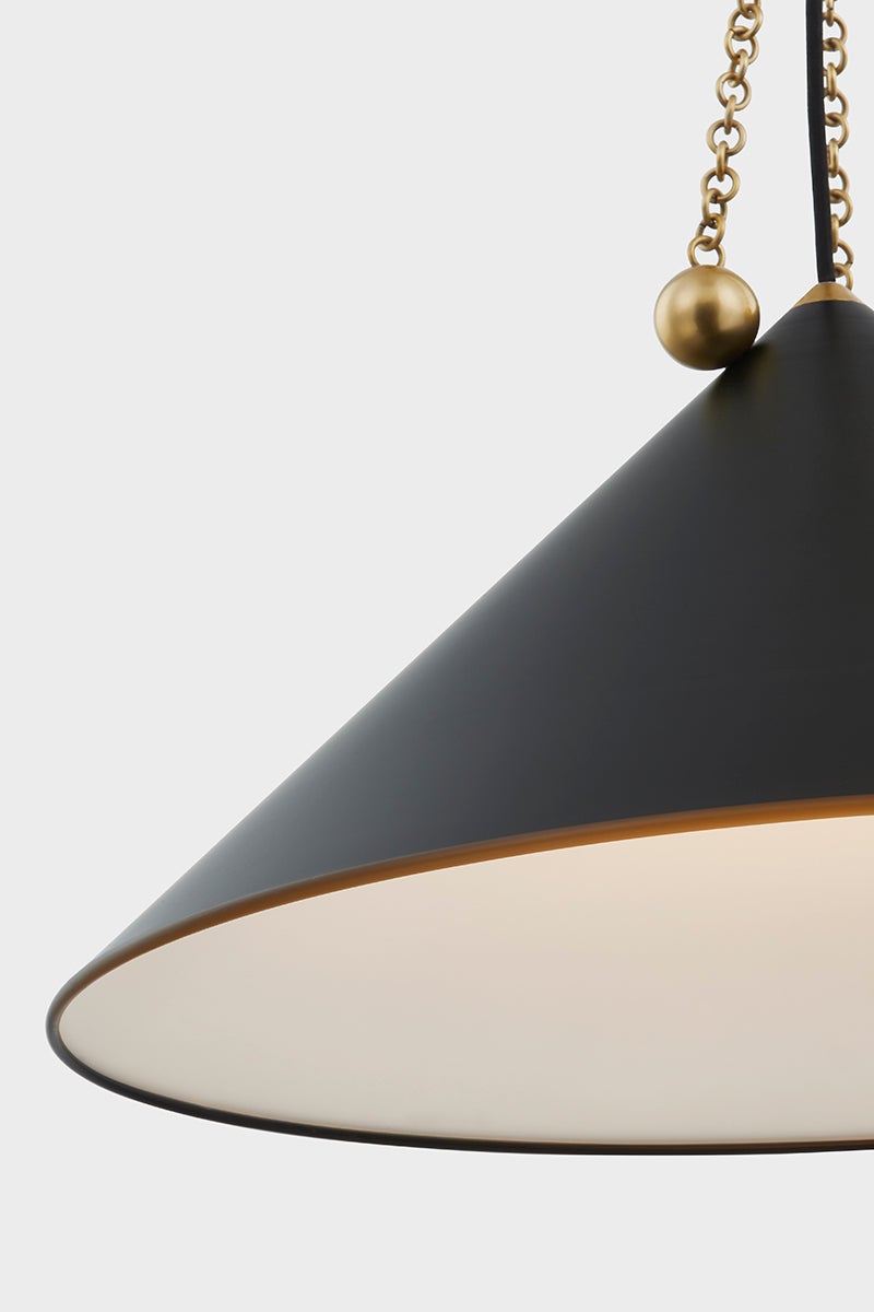 Boho meets Bauhaus in this ornamental and architectural pendant. The detailed Aged Brass chainwork, orb accents, and metal tip at the top decorate the straightforward, angular shade with jewelry-like accents. The all-over Soft White finish feels crisp and clean, while the Soft Black shade has a Soft White interior for a more dramatic effect.