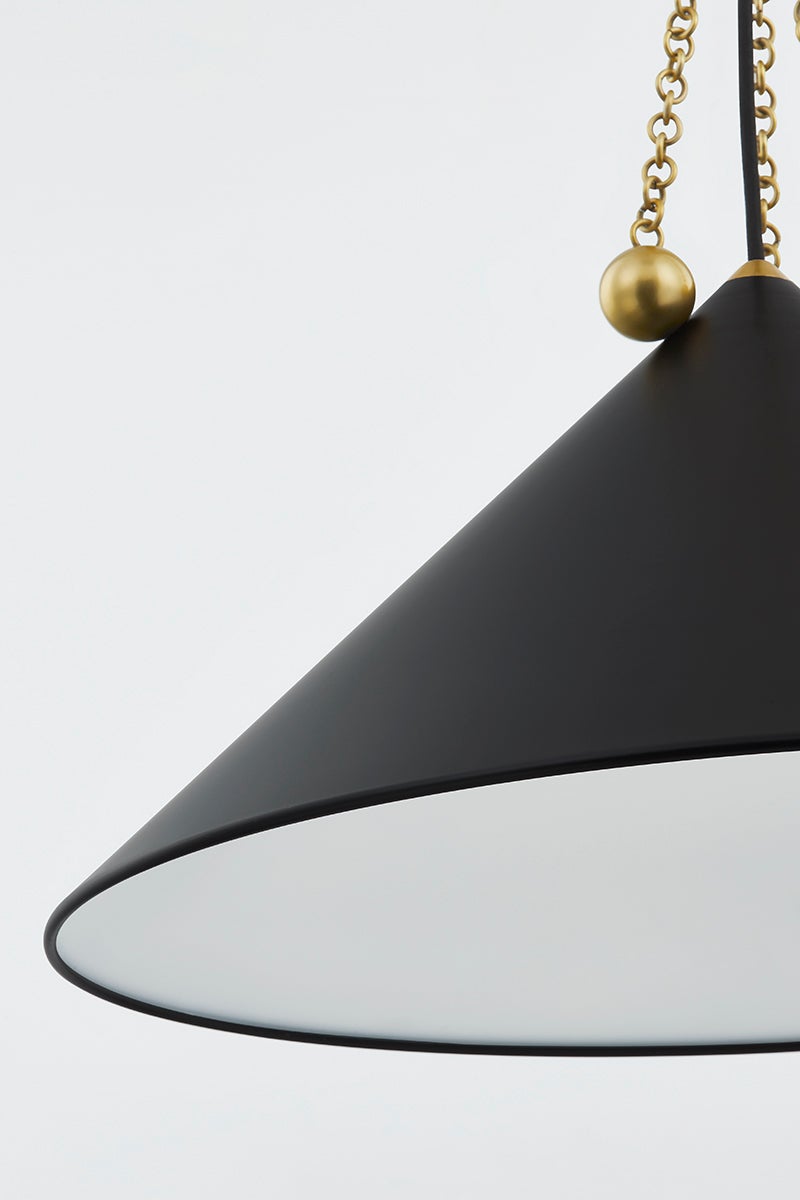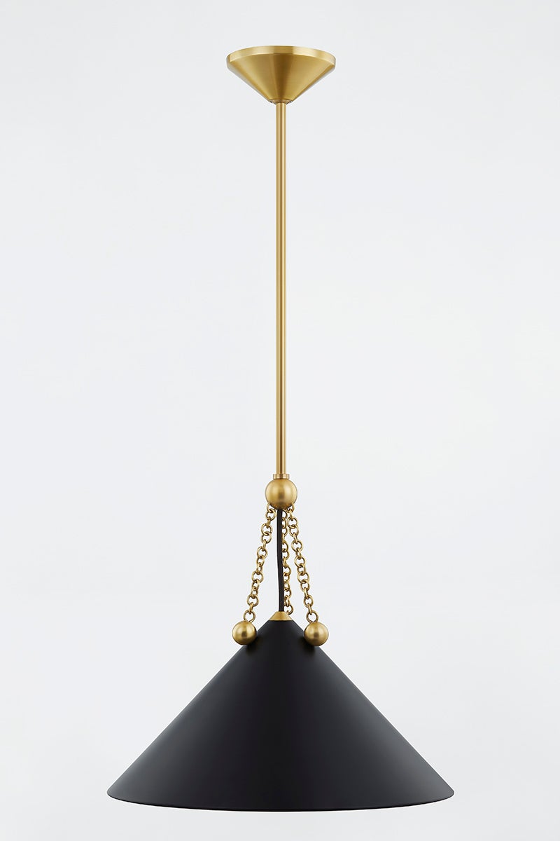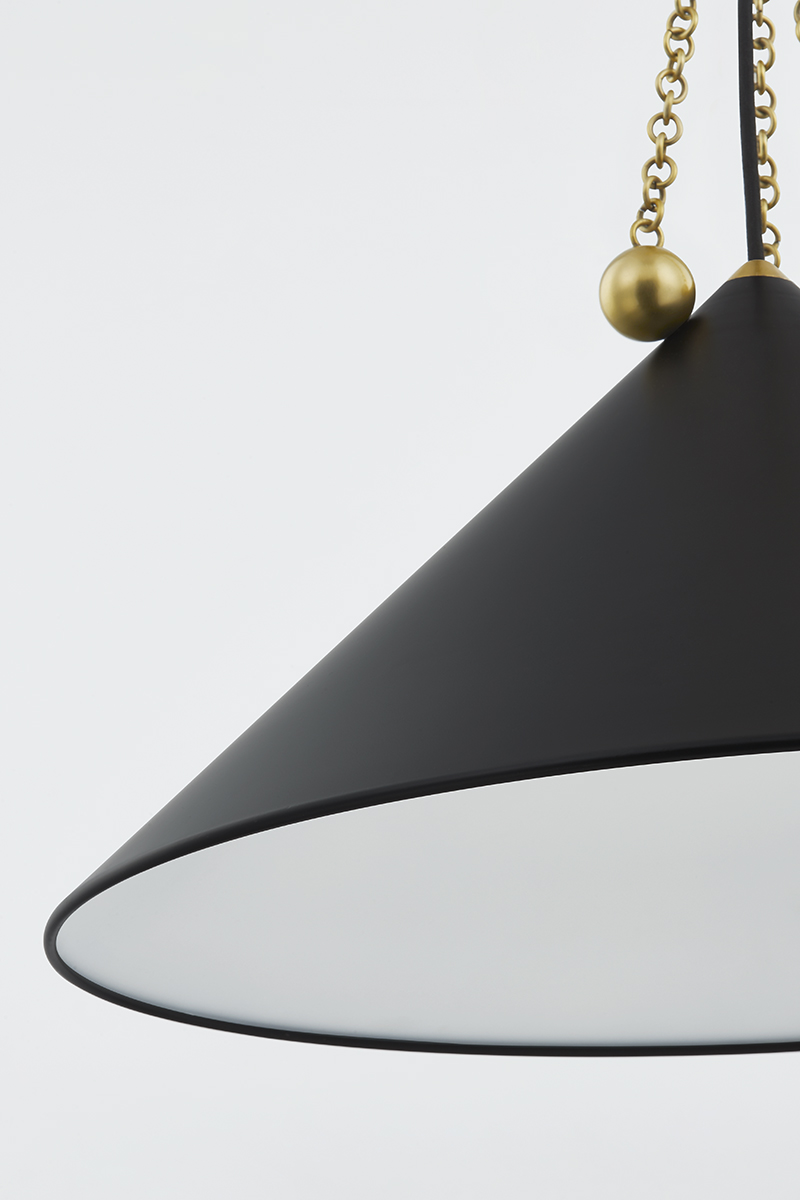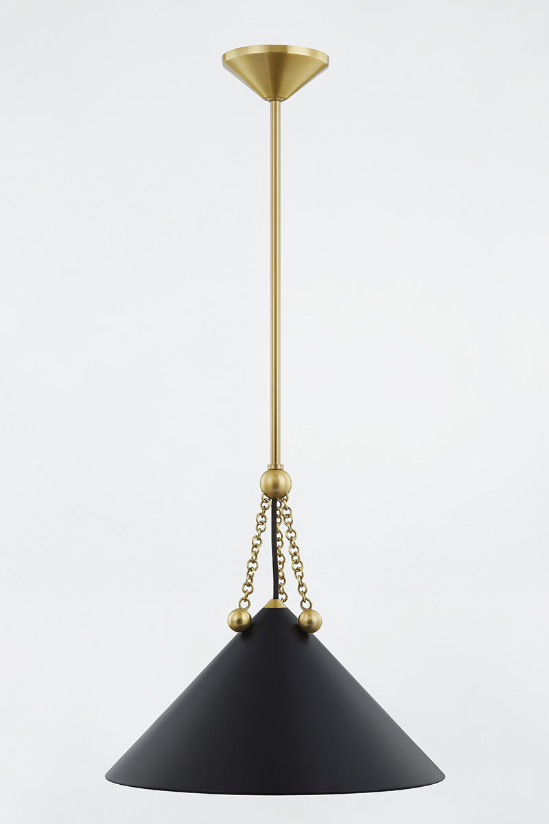 Boho meets Bauhaus in this ornamental and architectural pendant. The detailed Aged Brass chainwork, orb accents, and metal tip at the top decorate the straightforward, angular shade with jewelry-like accents. The all-over Soft White finish feels crisp and clean, while the Soft Black shade has a Soft White interior for a more dramatic effect.