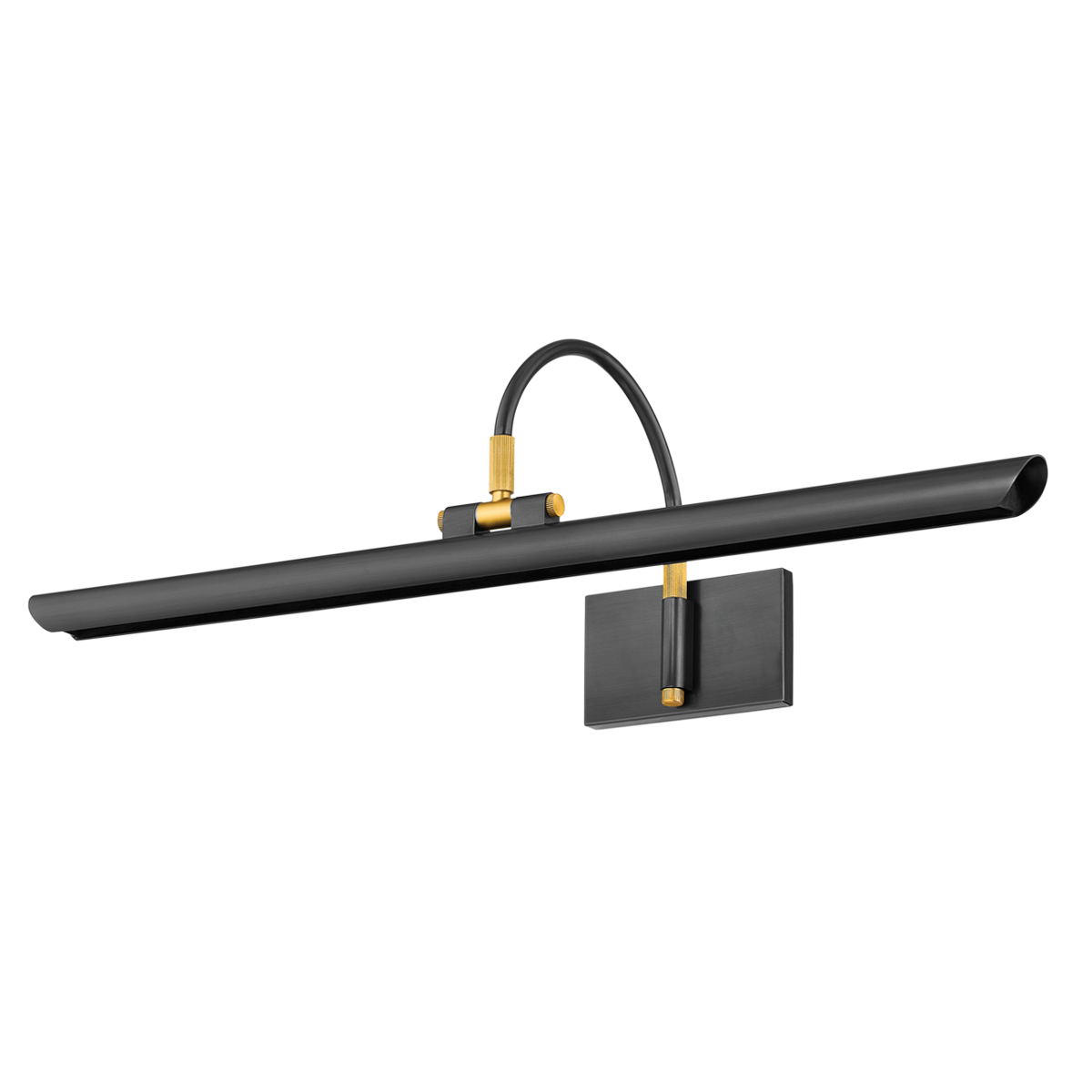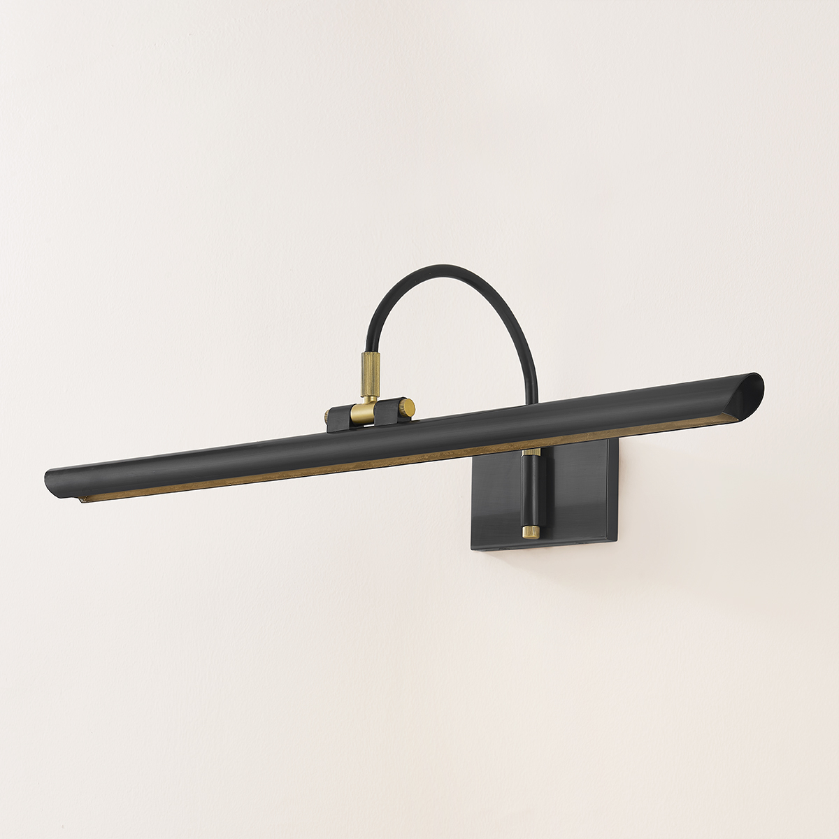 Breathing new life into a classic picture light design, Elowen features a slender silhouette and integrated LED technology. Supported by an arched neck, the shade is folded into a tube, leaving a thin opening that allows a band of light to pass through. Available in two sizes in either an Aged Brass or an Aged Old Bronze finish, Elowen provides discreet, yet powerful illumination of wall decor.