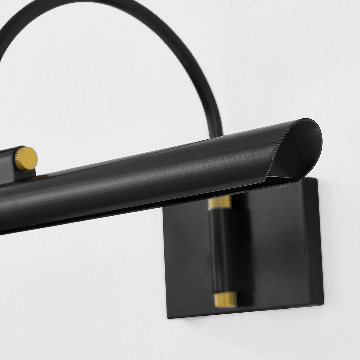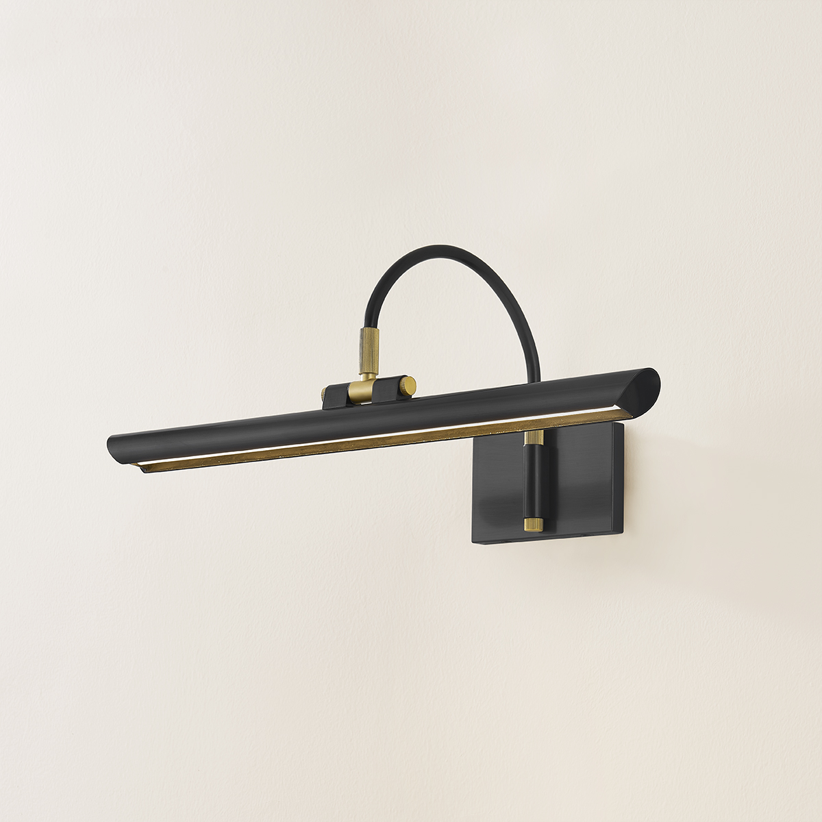 Breathing new life into a classic picture light design, Elowen features a slender silhouette and integrated LED technology. Supported by an arched neck, the shade is folded into a tube, leaving a thin opening that allows a band of light to pass through. Available in two sizes in either an Aged Brass or an Aged Old Bronze finish, Elowen provides discreet, yet powerful illumination of wall decor.
