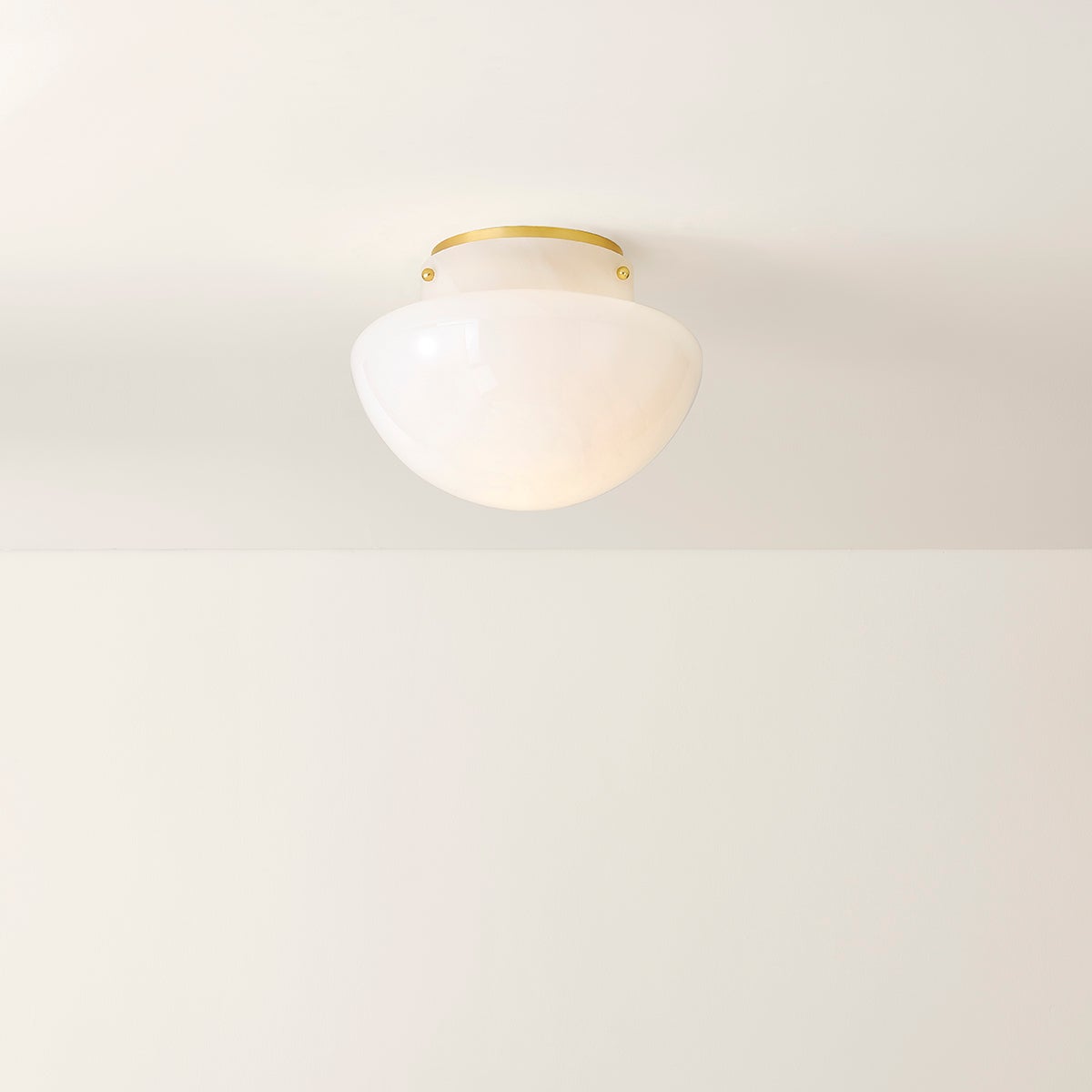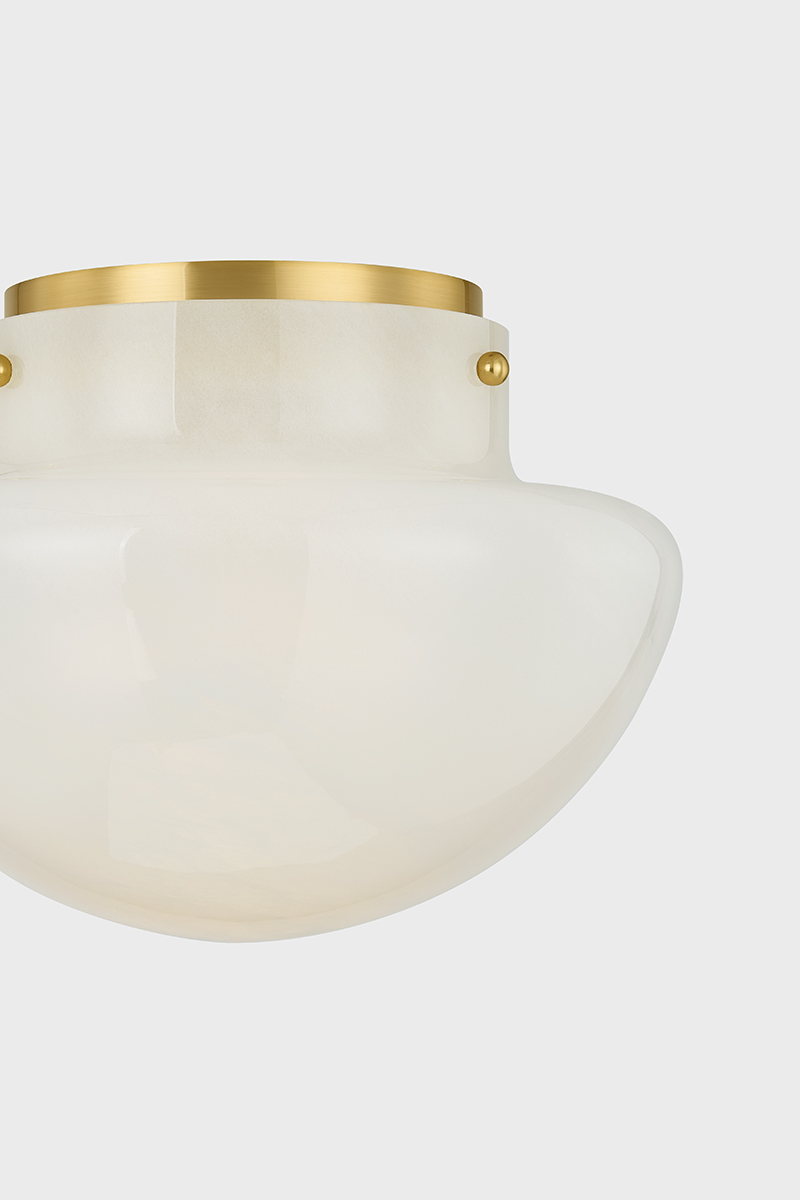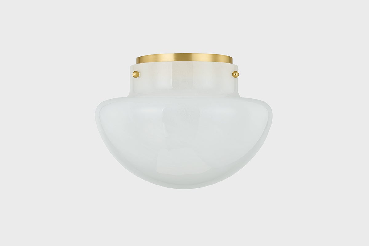 The stylish Lilou borrows features cloud glass and a mushroom-like shape, reminiscent of classic Murano glass table lamps to create a fixture full of vintage charm. An Aged Brass canopy and elegant thumb screws embellish the fixture. Emitting a soft glow, this flush mount makes a subtle statement without taking up a lot of space.