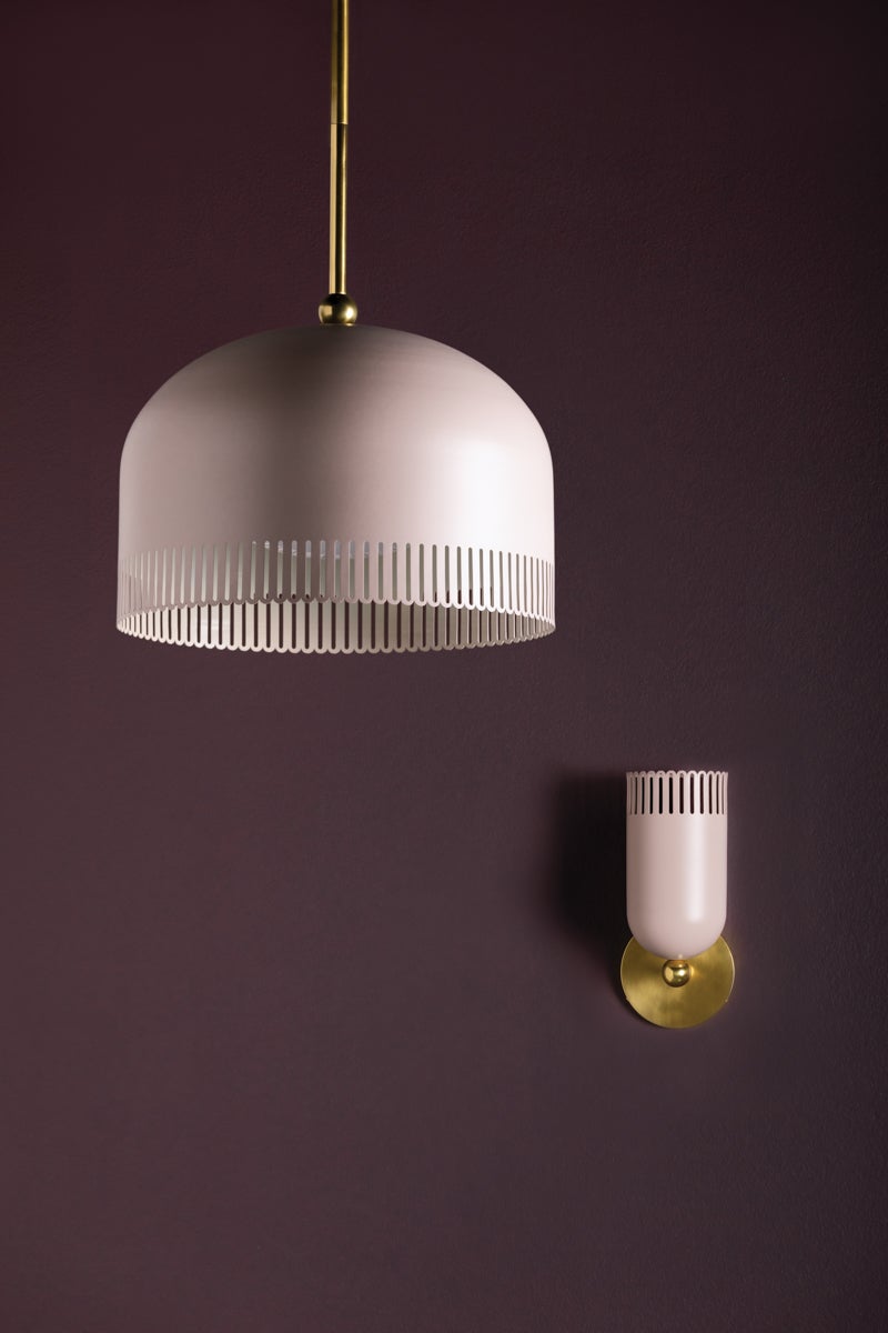 A visual treat, Liba features classic forms updated with eye-catching details. Known for her color sensibility, Zoe Feldman has added a playful touch to this fixture with its unique hue. The warm neutral has a hint of pink that creates a calming, inviting presence which is complemented by the Aged Brass framework. The slender scalloped edges of the fixture allow light to shine through while adding a whimsical note. Available as a 1 or 2-light sconce and a pendant in two sizes, Liba is a thing of beauty. Part of our Zoe Feldman collection.
