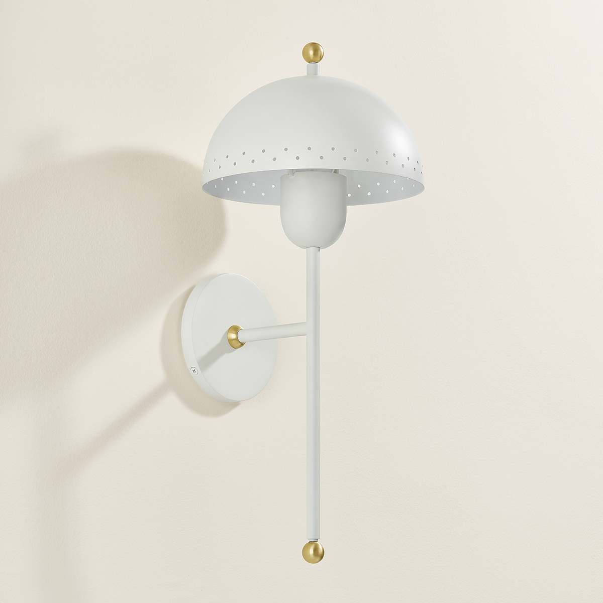 Influenced by midcentury design, Jojo features a dome-shaped shade with decorative perforations that allow light to escape. Both the pendant and sconce come in a Soft White finish while the lamp is available in a moody green as an eye-catching accent piece. The pendant features 2 lights within its bowl, optimizing illumination. All variations are elegantly accented in Aged Brass. Part of our Zoe Feldman collection.