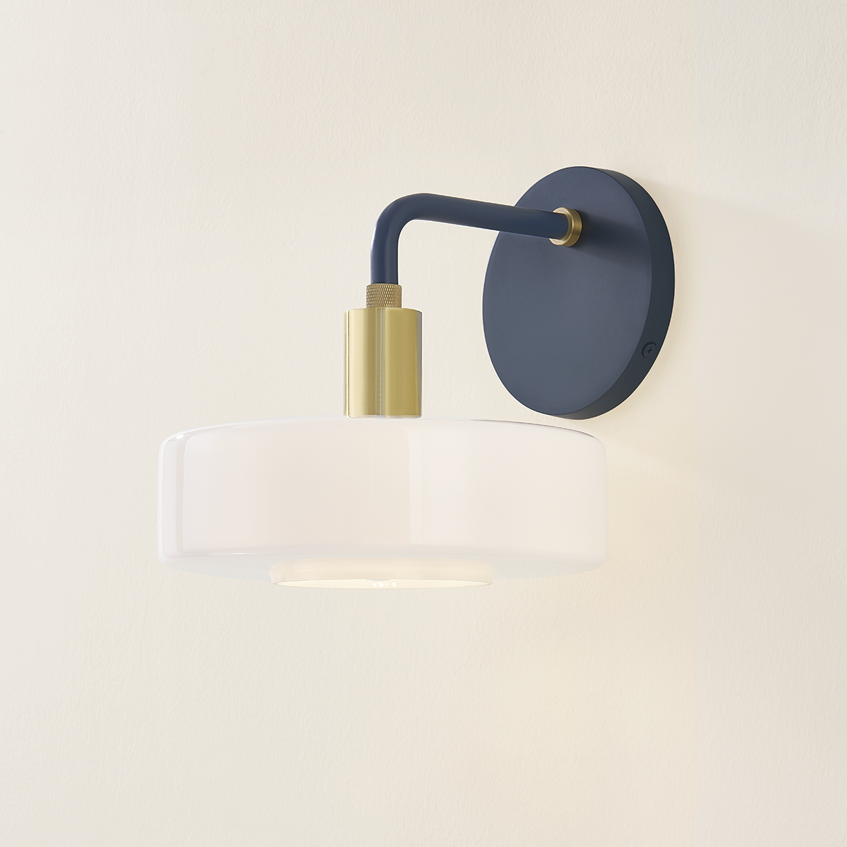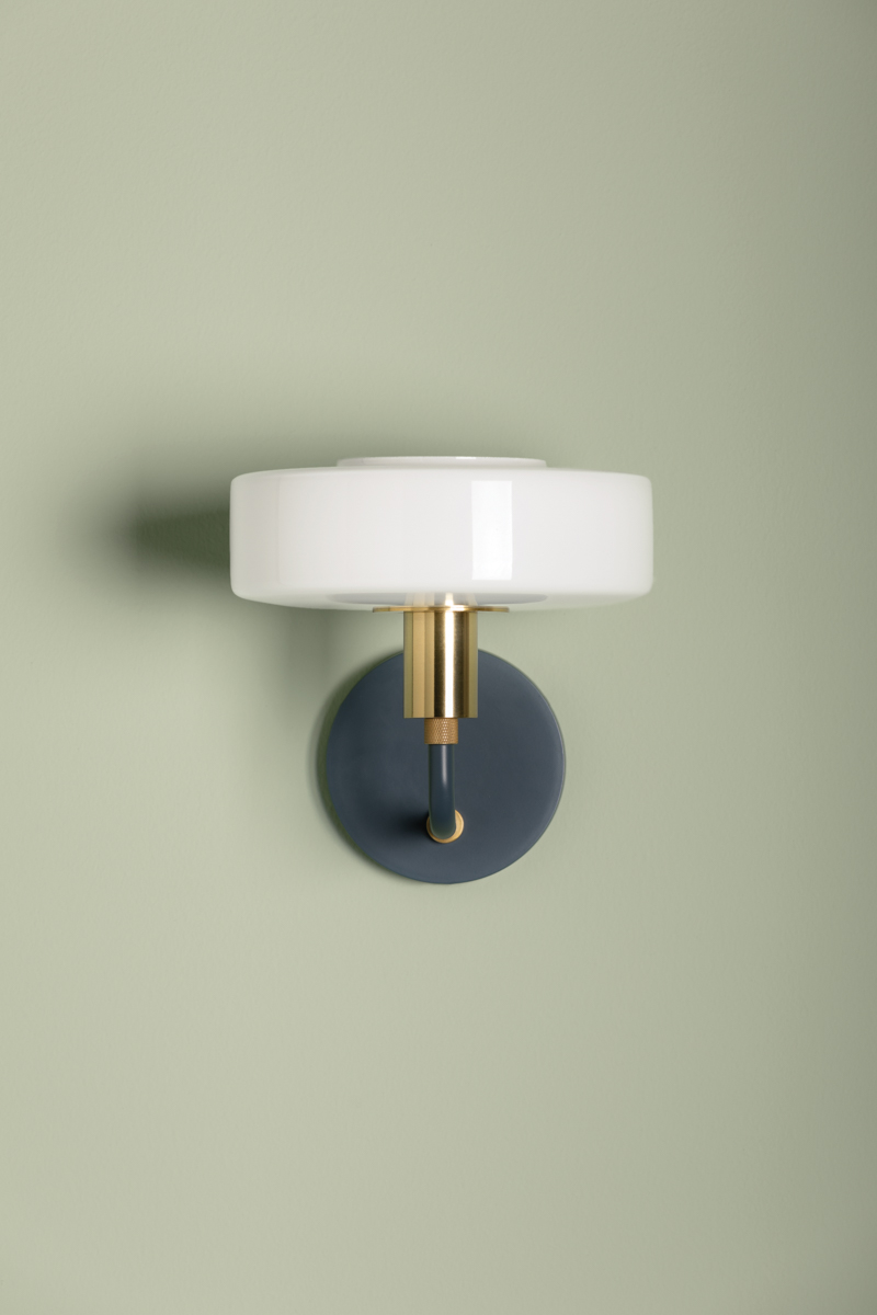 A modern statement piece in stylish Slate Blue, Aston features thick pillow-shaped shades made of Opal Shiny Glass balanced on a softly geometric frame. Sleek lines, right angles, and warm Aged Brass accents contribute to the striking stature of this fixture. Available as a sconce, 3-light and a 5-light chandelier, Aston fills any space with a warm glow. Part of our Zoe Feldman collection.