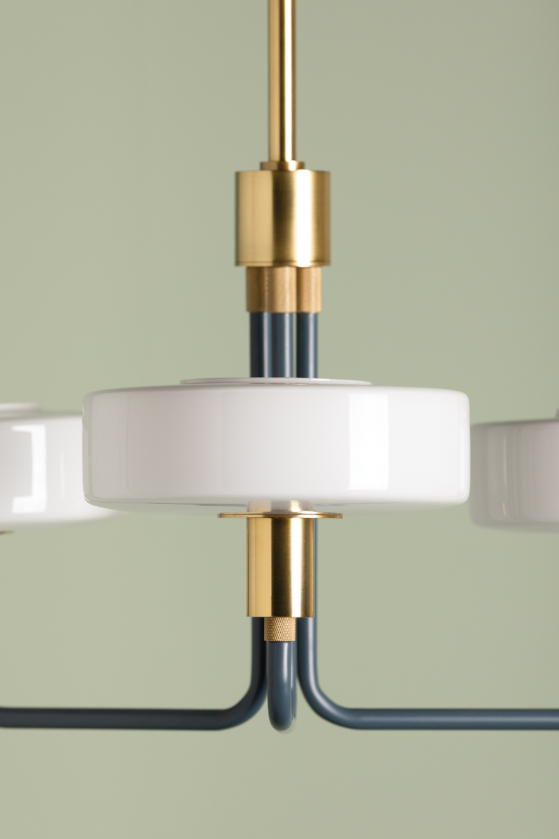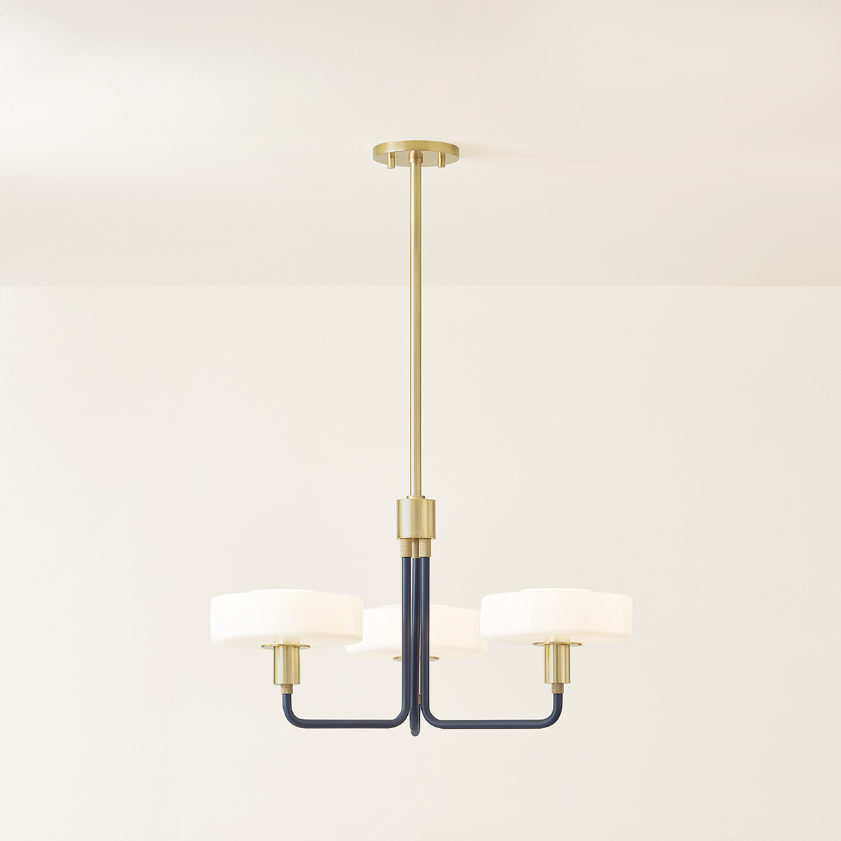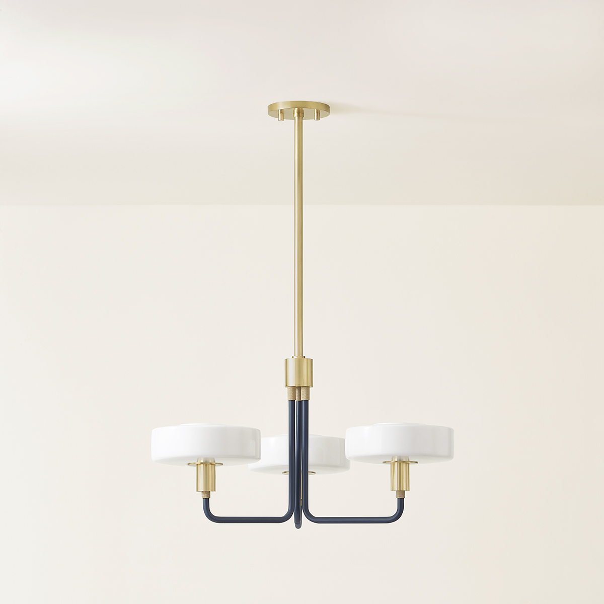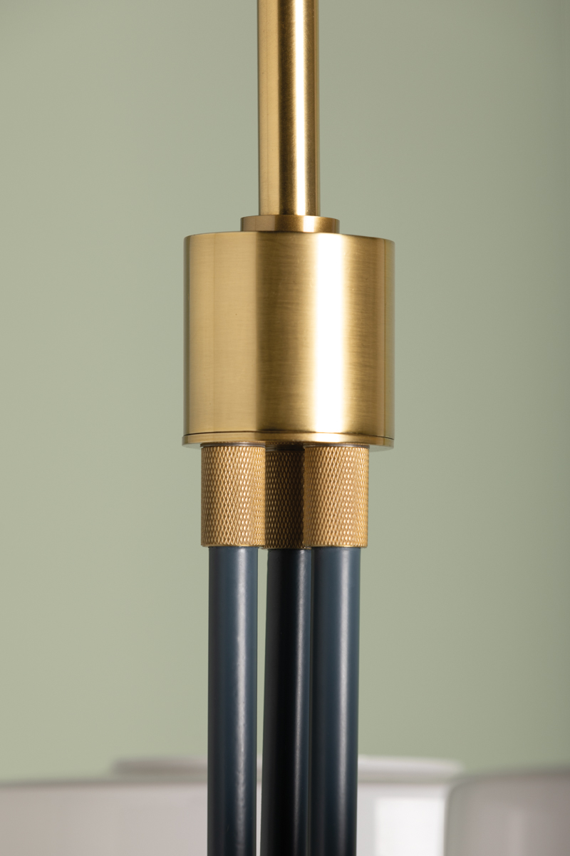 A modern statement piece in stylish Slate Blue, Aston features thick pillow-shaped shades made of Opal Shiny Glass balanced on a softly geometric frame. Sleek lines, right angles, and warm Aged Brass accents contribute to the striking stature of this fixture. Available as a sconce, 3-light and a 5-light chandelier, Aston fills any space with a warm glow. Part of our Zoe Feldman collection.