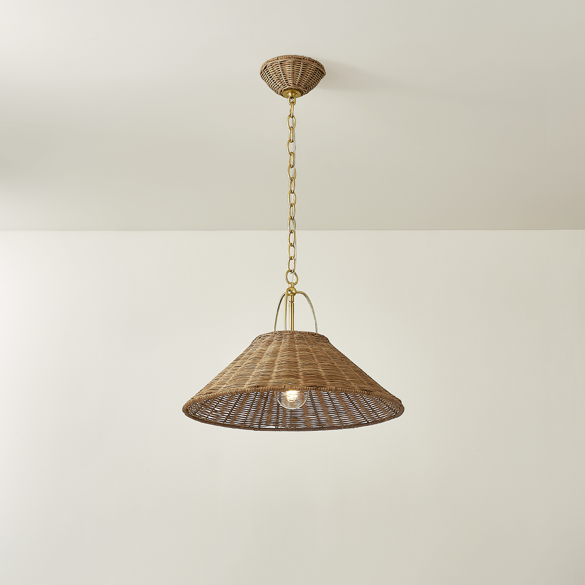 The Davida pendant takes a heritage silhouette and gives it an update with contemporary materiality. Woven from Natural Rattan, the shade and canopy bring an earthy, yet sophisticated feel to a space. The unique metalwork details are finished in a timeless Aged Brass finish. Part of our Zoe Feldman collection, Davida is available in two sizes.