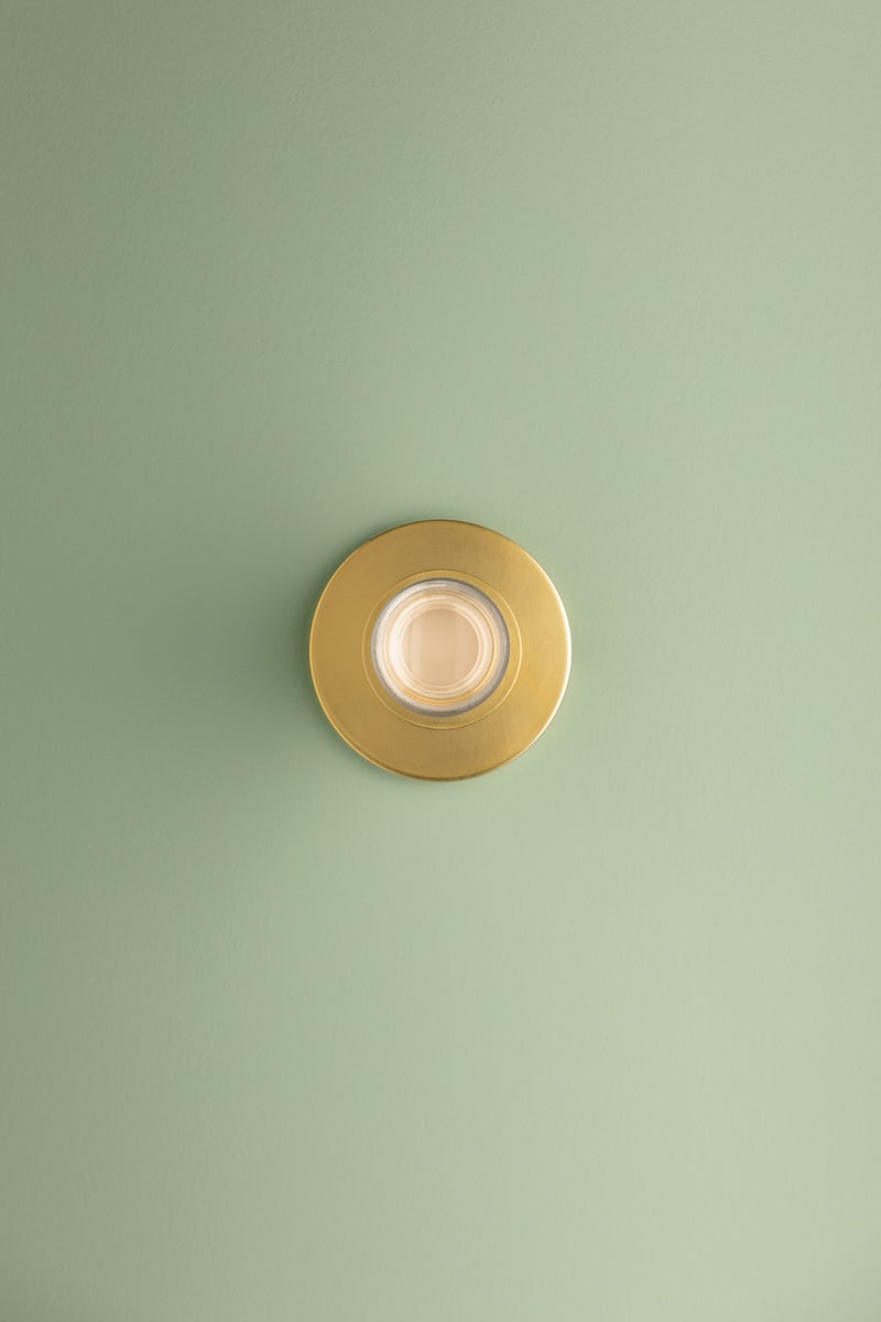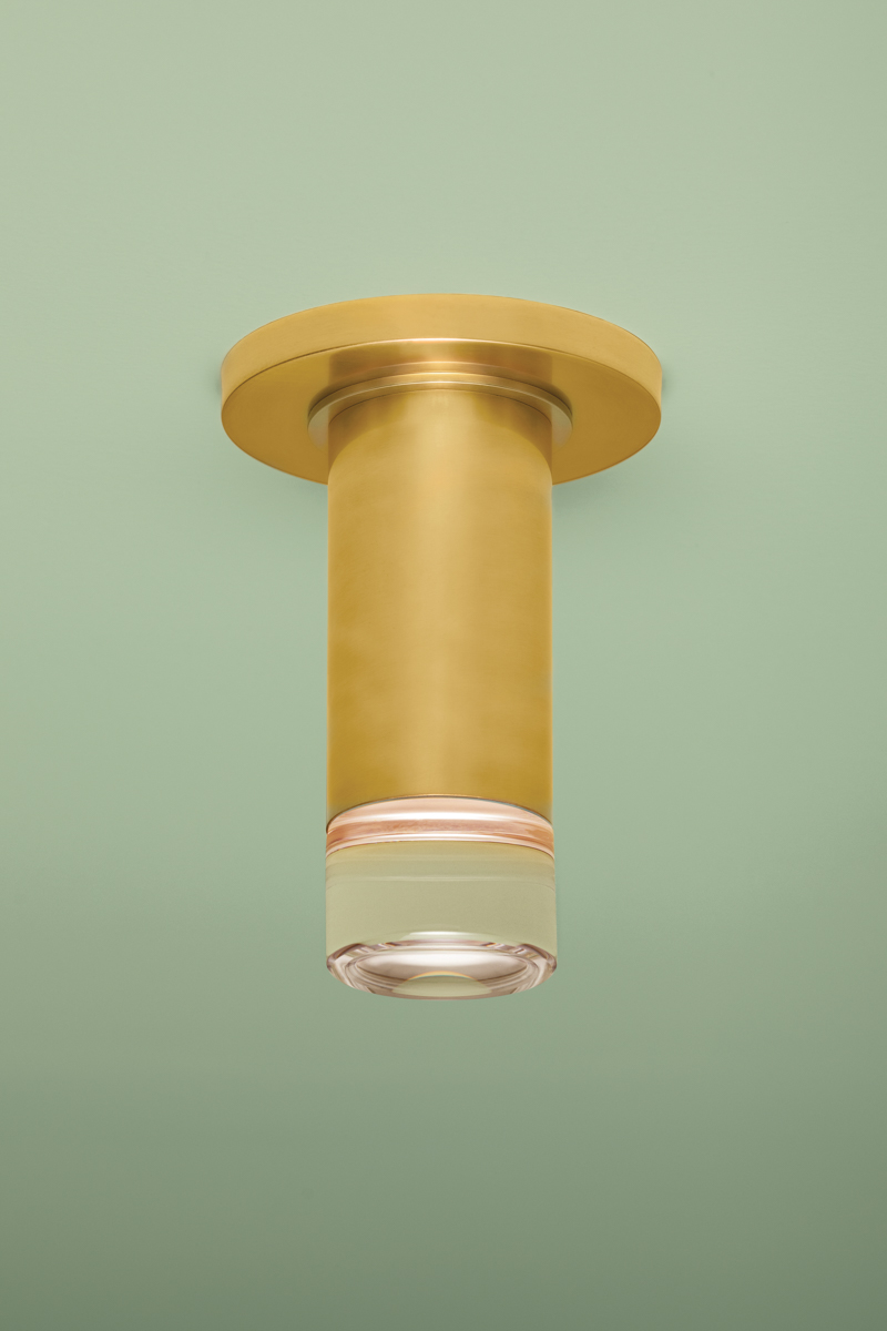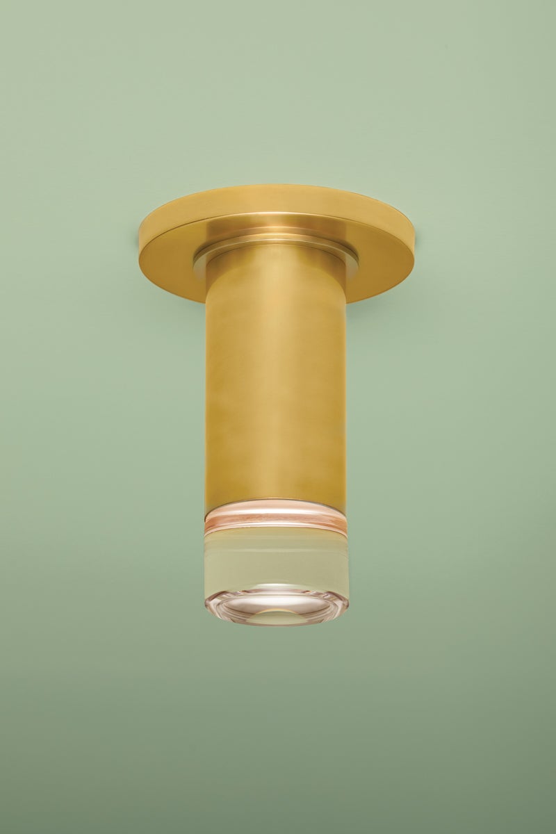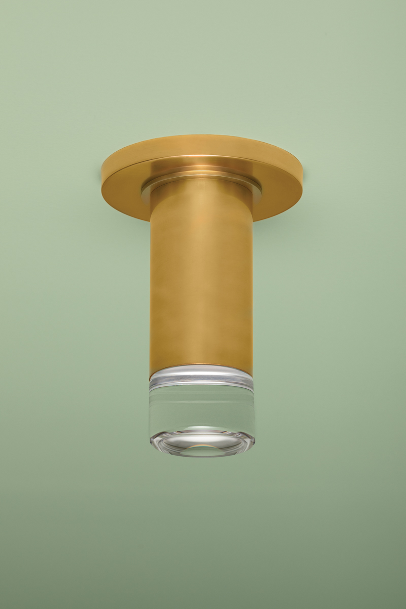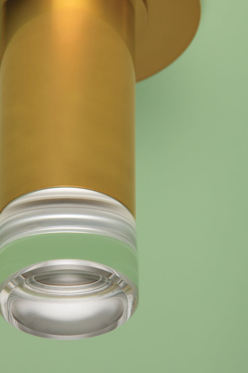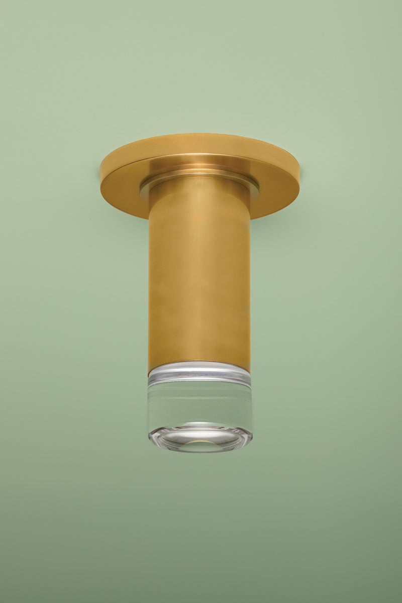 The slim proportions and sleek materiality of Claudie create a frills-free yet chic alternative to a can light. Encased in a clear K9 crystal lens, the light source provides powerful downlighting without a harsh glare. Accessible yet elevated, the Aged Brass finish gleams when illuminated.