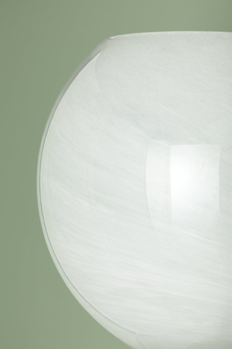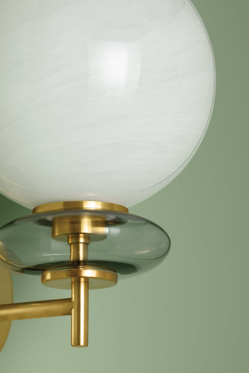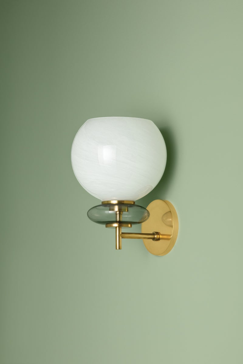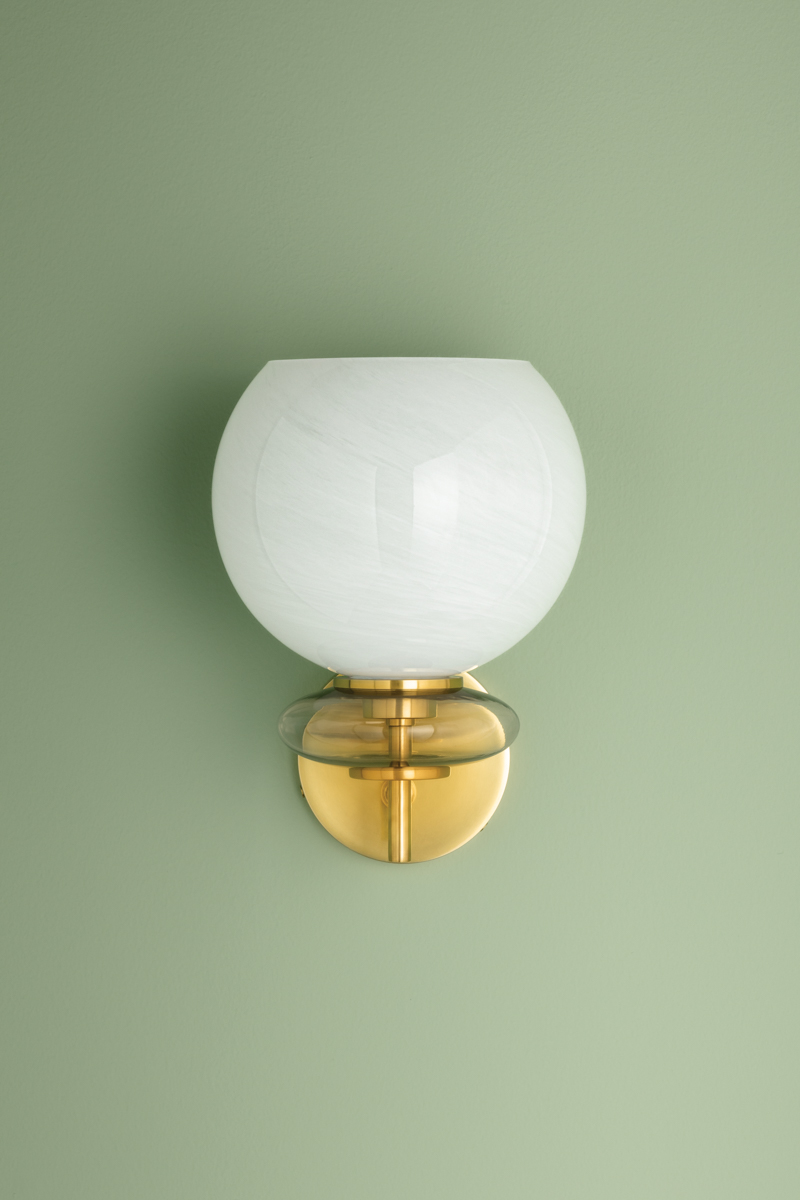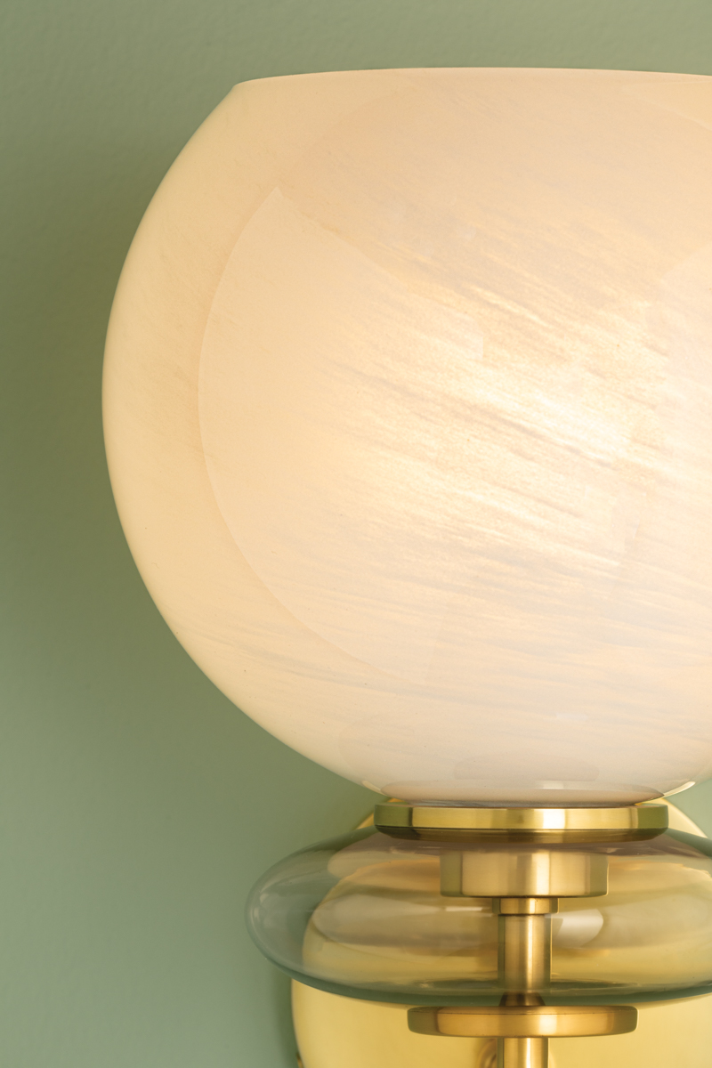 The totemic composition of Alexia strikes an artful note with a large cloud glass orb stacked above an iridescent glass bubble. Lustrous Aged Brass metalwork pierces through floating forms as if they were beads on a string. Available as a 1-light sconce or a 5-light chandelier, Alexia is both delicate and sweet – a true charmer.